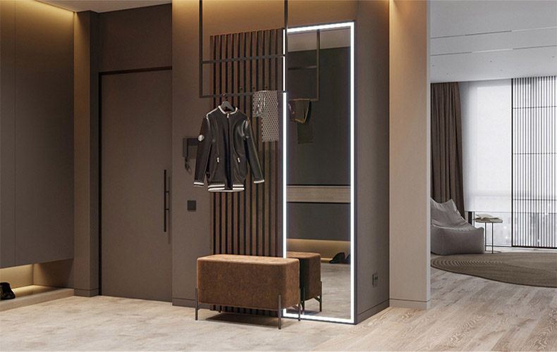 При входе в квартиру застройщик предусмотрел место не только для прихожей возле входной двери, но и помещение для небольшой гардеробной. Мы сразу разделили эти зоны перегородкой из тонированного стекла. Такая перегородка придает интерьеру легкости, но при выключенном в гардеробной свете становится практически непрозрачной и надежно скрывает от посторонних глаз хранимые вещи.