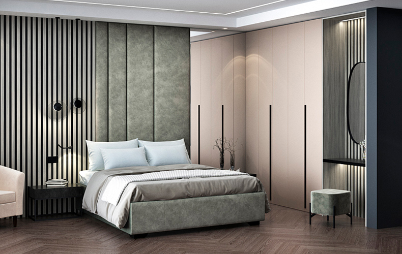 Стена за кроватью полностью декорирована панелями. Изголовье — мягкие панели, выполненные из той же ткани, что и кровать. Такая мебель для спальни обеспечит комфортный отдых. А стена рядом отделана реечными панелями, похожими на те, что украшают гостиную. Так весь интерьер обретает целостность и стилевую законченность.