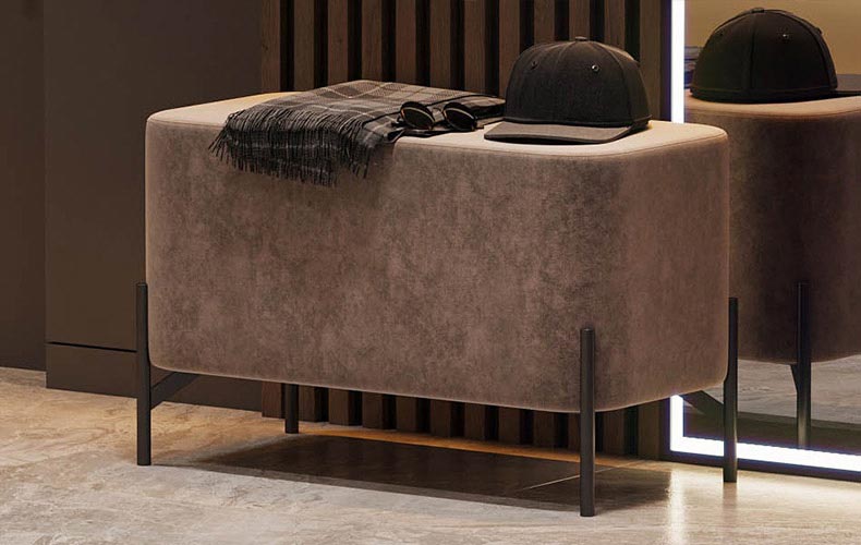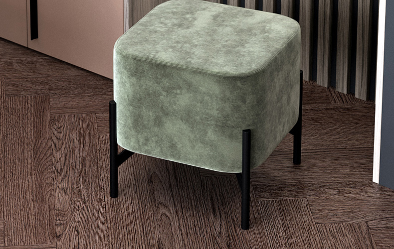 Лофт-стилистику продолжают зеркало в металлической раме с подсветкой и пуф «Лофт» с металлическими ножками.