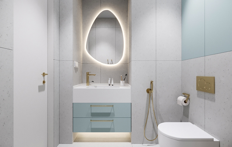 Гостевой санузел очень компактный. В нем разместилась инсталляция и раковина для мытья рук. Над коммуникациями сверху унитаза мы встроили шкаф, который скрывает трубы и одновременно обеспечивает к ним легкий доступ. Также этот шкаф можно использовать для хранения принадлежностей: туалетной бумаги, средств для уборки и т.п.