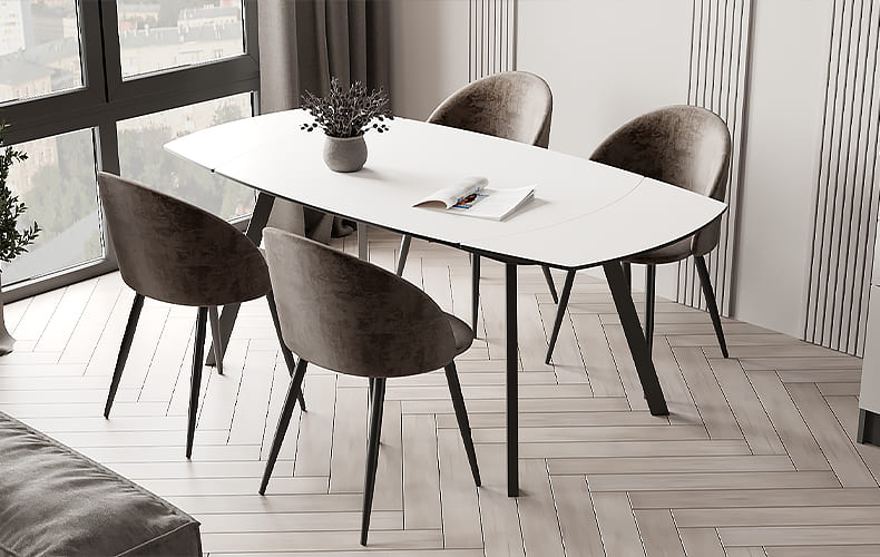 В зоне столовой свободно помещается стол на шесть персон, так что дружить семьями и приглашать друзей в гости жильцам этой квартиры будет легко и приятно. Впрочем, стол «Орбита», который на фото раздвинут, в сложенном состоянии будет гораздо компактнее. Его столешница выполнена из компакт плиты — практически неубиваемого, экологичного и очень красивого материала под цвет кухонной столешницы («Леванто Белый»).
