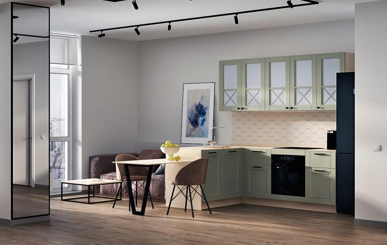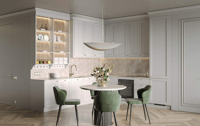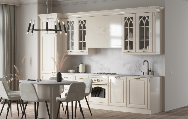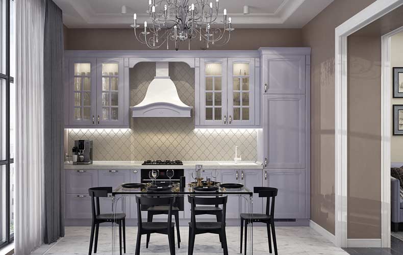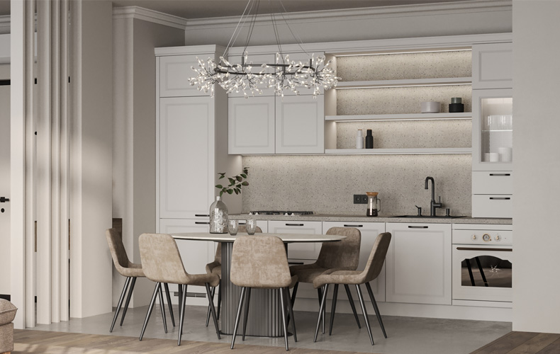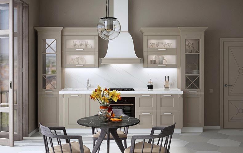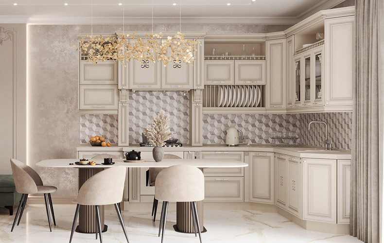 Фасады — из МДФ с фрезеровкой, в эмали, или рамочные соседствуют с лаконичными линиями, современной фурнитурой, модной подсветкой. Для такого интерьера также характерны столешницы и стеновые панели под камень и нейтральная светлая классическая палитра.