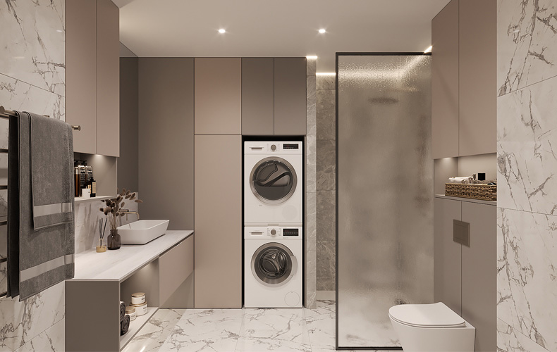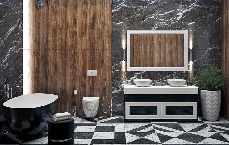 Плитка под мрамор, утонченная мебель, встроенное нишевое освещение — такое сочетание делает современный интерьер классикой на века.