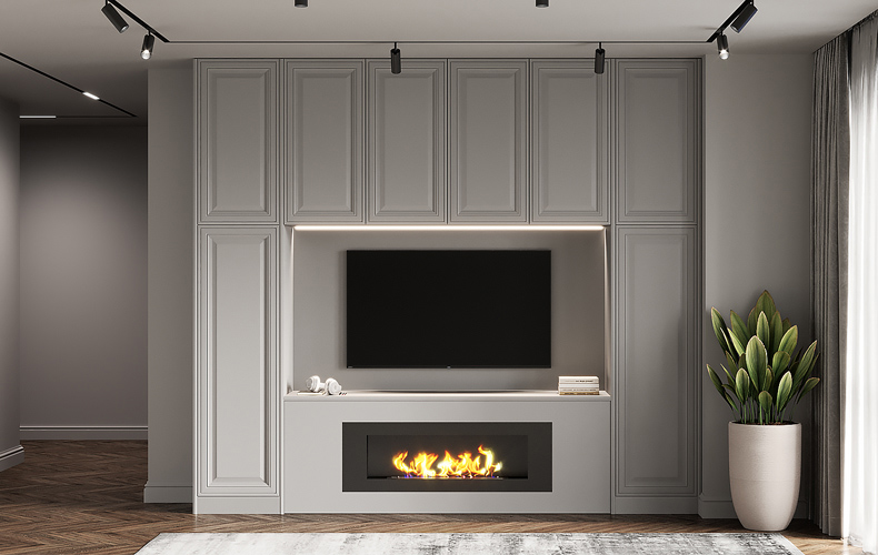 - присутствуют молдинги, карнизы и панели на стенах, но более легкие, чем строго классические варианты, скорее как намек, нежели как полновесный декор;