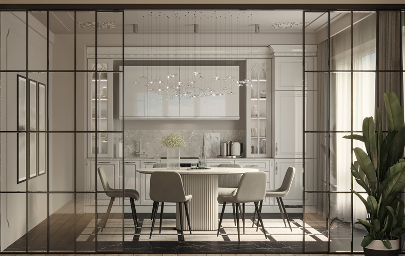 Белые классические фасады + современные глянцевые шкафы + минималистичная обеденная группа