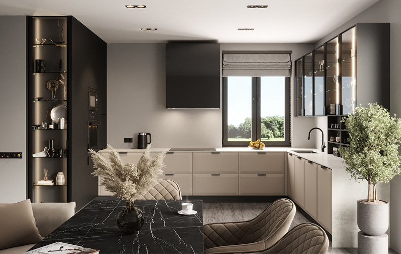 Классические фасады + современные столешницы обеденного стола