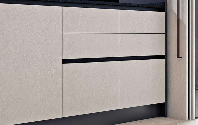 Вариант чуть подороже — фасады «Клодия», новинка в нашем ассортименте. Это HPL-пластик, и на данный момент это самые прочные фасады из тех, что у нас есть. Про них можно сказать: «антивандальные» фасады. «Клодии» все нипочем. Фасады легко чистятся, они влагостойкие и их можно мыть. А поцарапать их можно только, если приложить усилия и взять гвоздь поострее. Дети, кстати, любят эксперименты с колюще-режущими предметами, но таких испытаний ни один фасад не выдержит. На HPL-пластике от острого предмета останется вмятина, а не царапина. И такому фасаду не страшны собачьи когти и зубы — маленькая собачка его не сможет разгрызть.