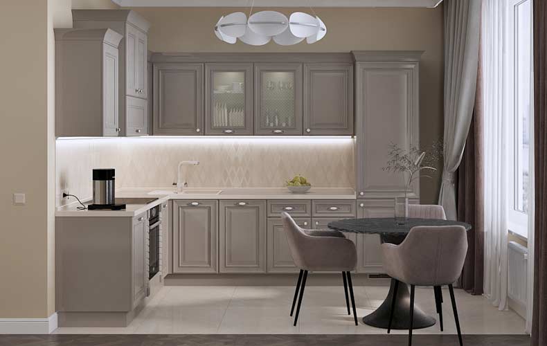 Форма и оттенок фасадов — один из ключевых показателей общего стиля кухни. Строгие минималистичные фасады можно дополнить столешницей сдержанного цвета, современный интерьер хай-тека отлично сочетается как с черным и серым, так и с яркими тонами, а элегантная фрезерованная классика требует строгости — с такими фасадами часто используют белые и черные рабочие поверхности.