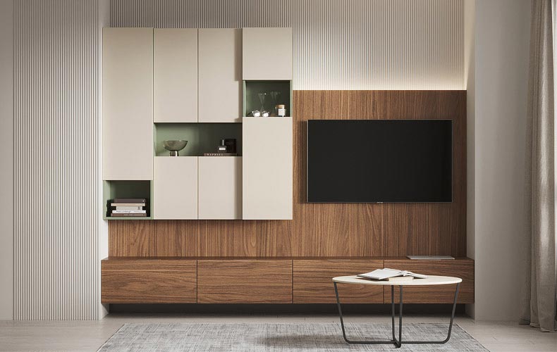 С тумбой под телевизор мы очень долго бились, но так и не придумали идеального решения. На новый год я подарила маме электрический камин, который мы решили расположить под телевизором в тумбе. И очень хотелось сделать раздвижные и уходящие назад гибкие дверцы-шторки. Но технически это оказалось невозможным. Поэтому мы заказали классические распашные фасады. Но, чтобы насладиться огнем в камине, надо либо снять дверки вообще, либо держать их постоянно открытыми.