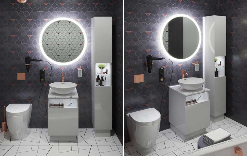 Одной из примет минималистичных интерьеров стало отсутствие видимых источников света в прихожей или ванной. При этом зеркало — обязательный атрибут такого помещения — становится источником рассеянного света.