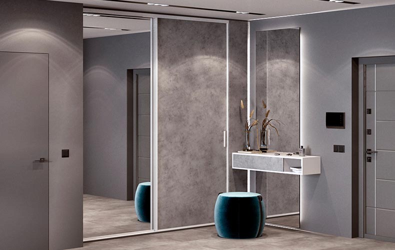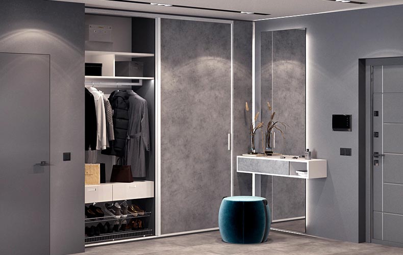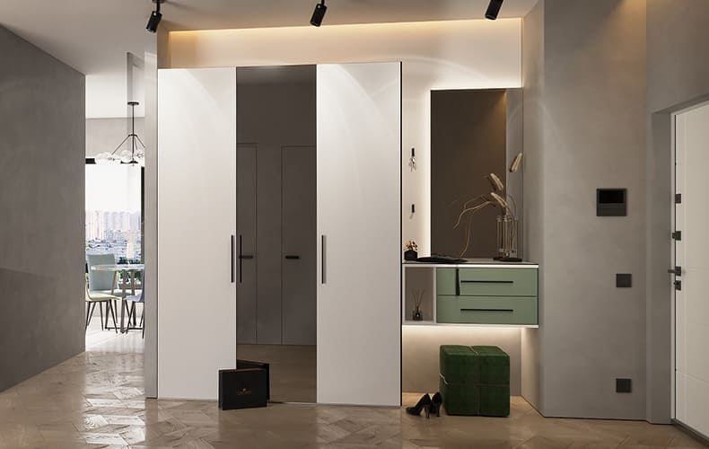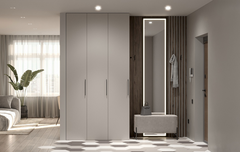 Большие зеркала от пола до потолка — обязательная деталь даже маленькой прихожей. Более того, именно маленькая прихожая будет казаться больше, если в ней установлено такое зеркало. Вместо массивной рамы установите контурную подсветку: еще один дополнительный источник света в лишенной окон прихожей будет уместным и эффектным.