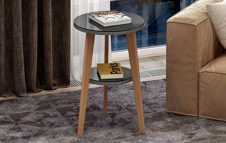 Круглый журнальный столик на буковых опорах удобен тем, что сверху можно поставить чашку чая, а внизу разместить журналы или книги. Высота столика и стекло на столешницах можно выбрать из множества вариантов. Лучше всего такой столик вписывается в интерьеры, где много дерева, например, скандинавский или кантри. Плюс маленьких столиков — их можно разместить даже в небольшом помещении.