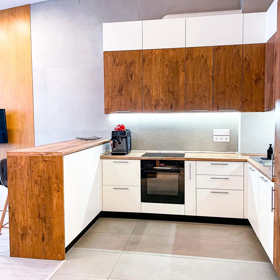 Задачи: сделать кухню и встроенные шкафы по готовому дизайн-проекту с учетом потолков разной высоты. В дизайн-проекте — кухня с белыми фасадами и фасадами под дерево, барной стойкой и вместительными зонами для хранения