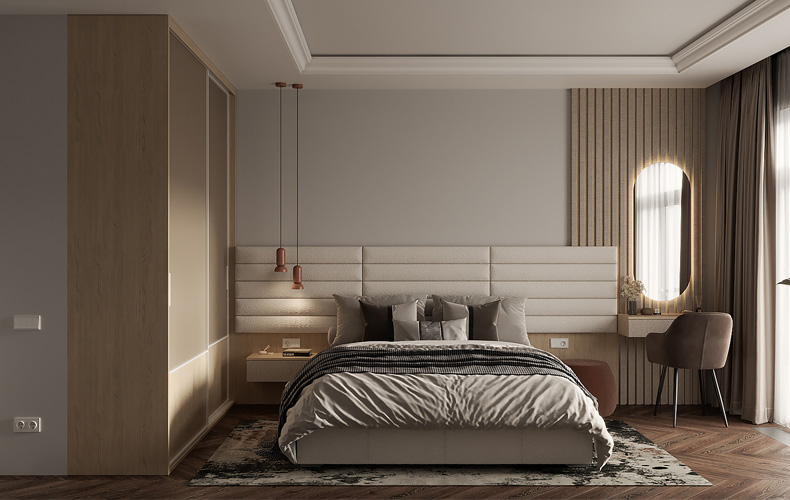 Для встроенных конструкций и отделки выбраны панели того же оттенка, что и в спальне, и в гостиной. Такой подход сделал интерьер целостным и гармоничным.