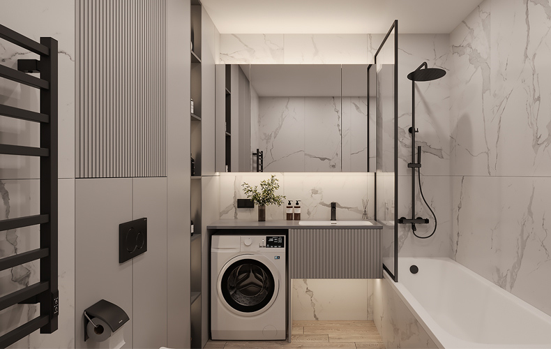 Для шкафа в ванную и тумбы под мойку выбрали ту же стилистику и похожие материалы. Столешница имитирует белый мрамор («Леванто белый»), шкаф — в оттенке «Кашемир серый» в сочетании с отделкой под дерево. Все минималистично, без ручек и лишних деталей. Все вместе стоило нам чуть меньше 100 000 рублей.