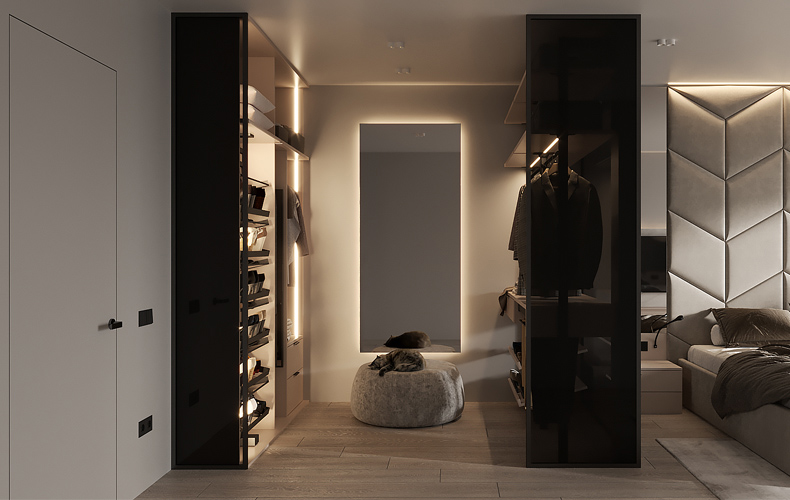 Системы хранения — это тоже вещи. От лишних коробок, мешков, пакетов, кофров и вешалок тоже стоит избавляться, рационально обустраивая пространство минимальным набором систем хранения. Оставляйте только то, что приносит радость, когда вы открываете шкаф или заходите в гардеробную.