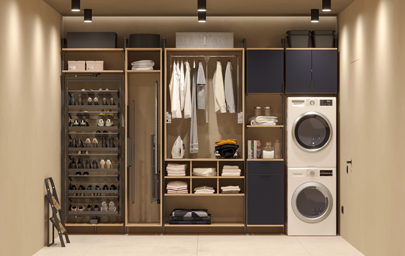 Пантограф обеспечивает комфортный и простой доступ к верхней зоне хранения, а штанга для одежды будет удобна для нижней зоны ( например для детей ) Нижнюю зону хранения можно обустроить нишами для вертикального хранения.