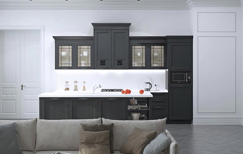 Важно учесть, насколько рабочая поверхность должна выступать над фасадом. Стандартная ширина столешницы — 60 см, но на заказ ее габариты могут быть практически любыми. При этом свес над тумбами не должен превышать 3-5 см. Этого достаточно, чтобы защитить дверцы шкафчиков от брызг и капель, и при этом не биться головой о столешницу при наклонах.