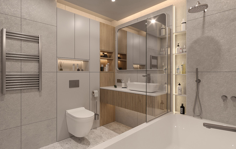 - Задачи: минималистичная ванная комната в просторном помещении 8 кв. м с нестандартной конфигурацией и большим количеством мест для хранения
