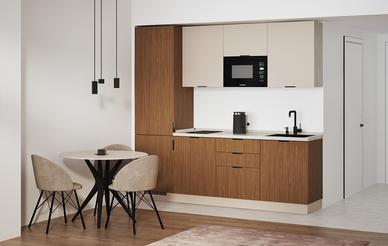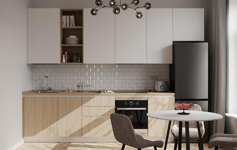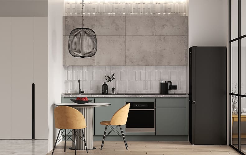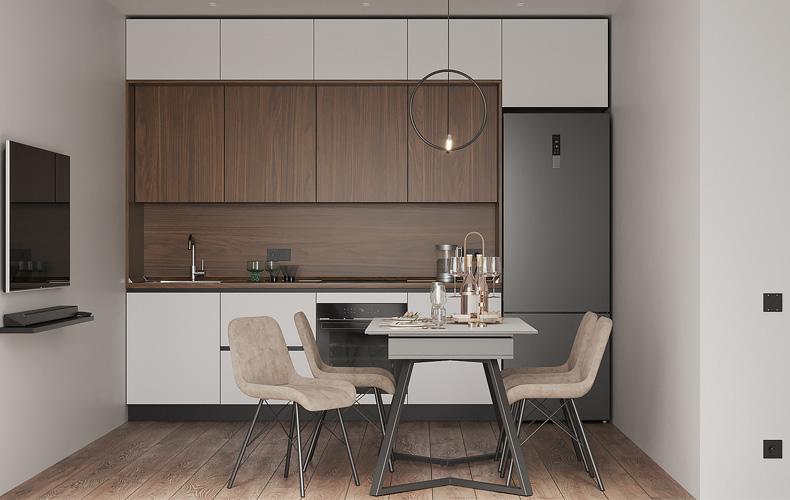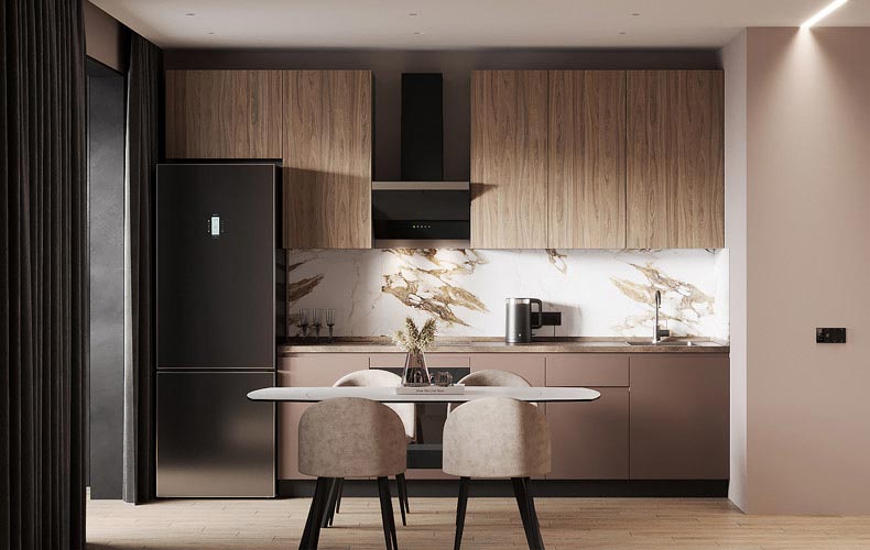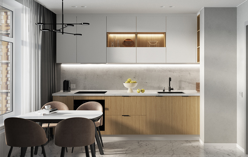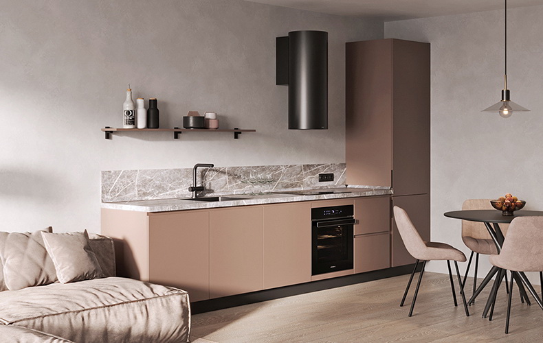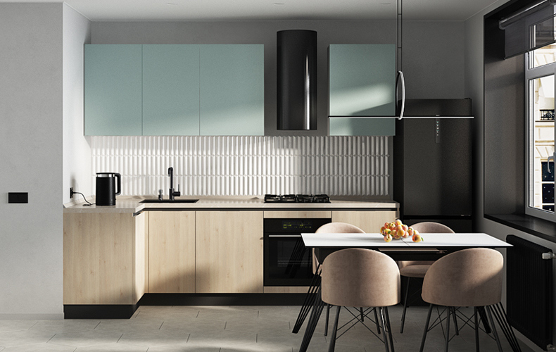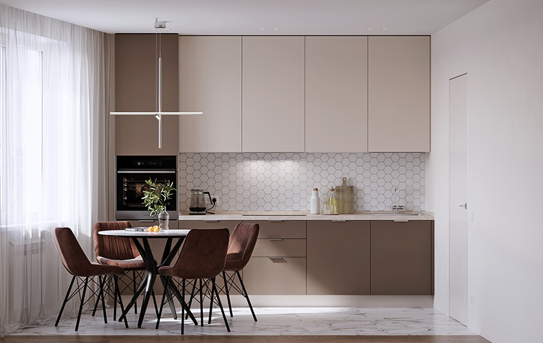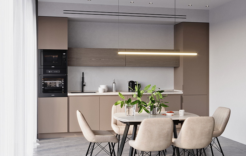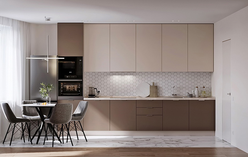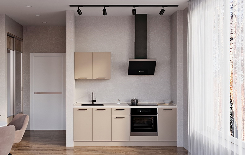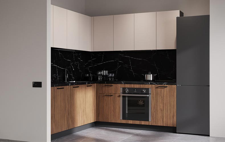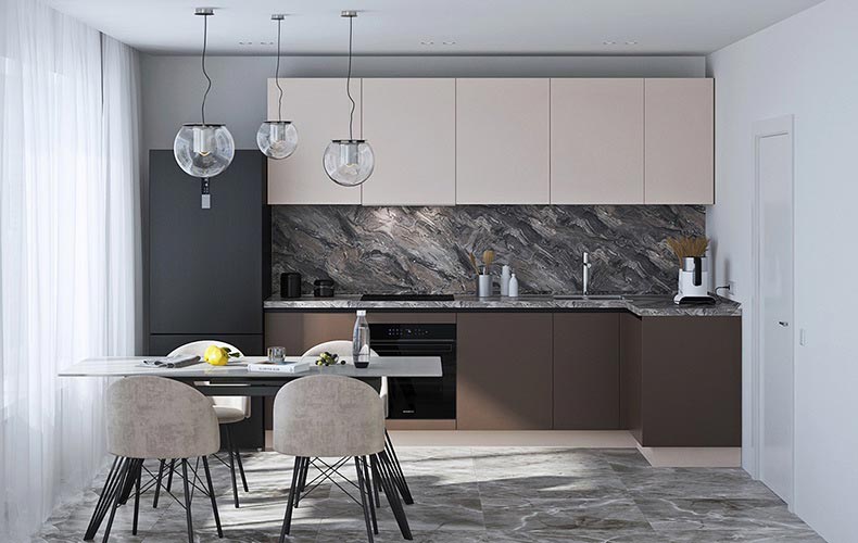 Теплый бежевый цвет фасадов мягко контрастирует с благородным серым декором под камень, в котором выполнены столешница и стеновая панель. Футуристичная навесная вытяжка над варочной панелью — модный акцент, не перегружающий пространство кухни в современном стиле.