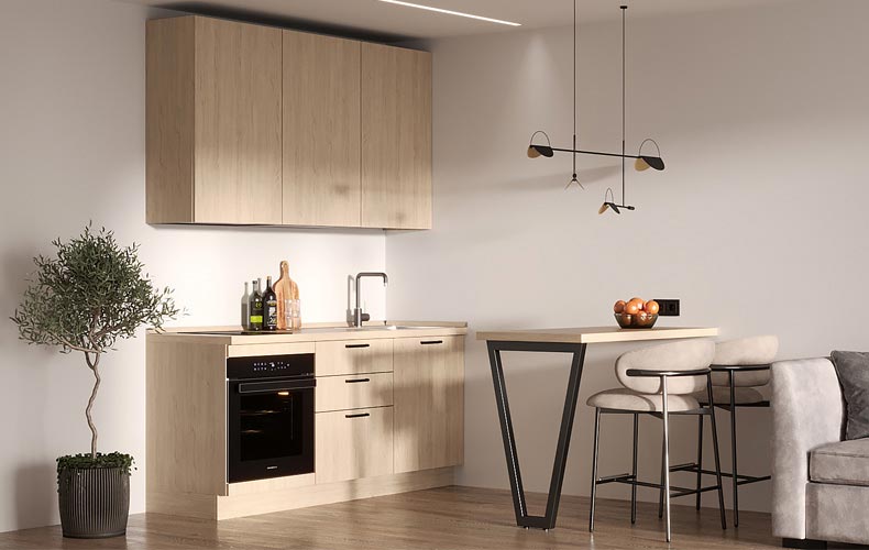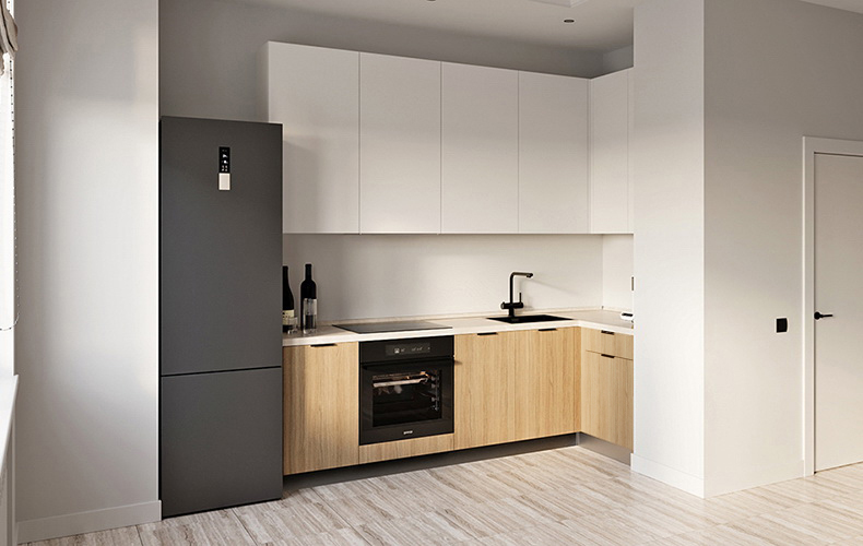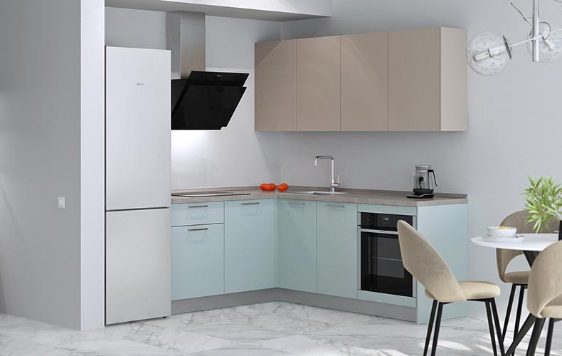 «Фабио Комфорт» сет 21 — угловая кухня без верхних шкафов. Но проблем с хранением не возникнет, ведь отсутствие верхнего яруса полностью компенсируют вместительные шкафы-колонны. В один высокий «пенал» можно установить холодильник, в другом разместить встроенную технику, и еще останется достаточно места для хранения важных мелочей. А вместительный нижний ярус отведен под вместительные полки и ящики.