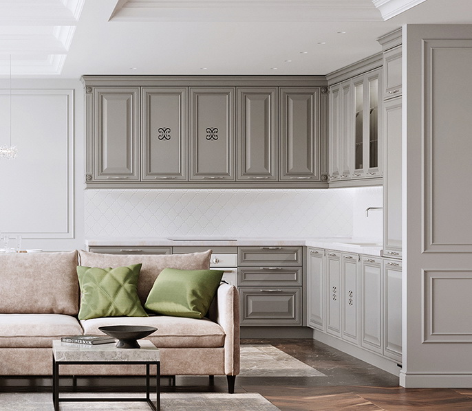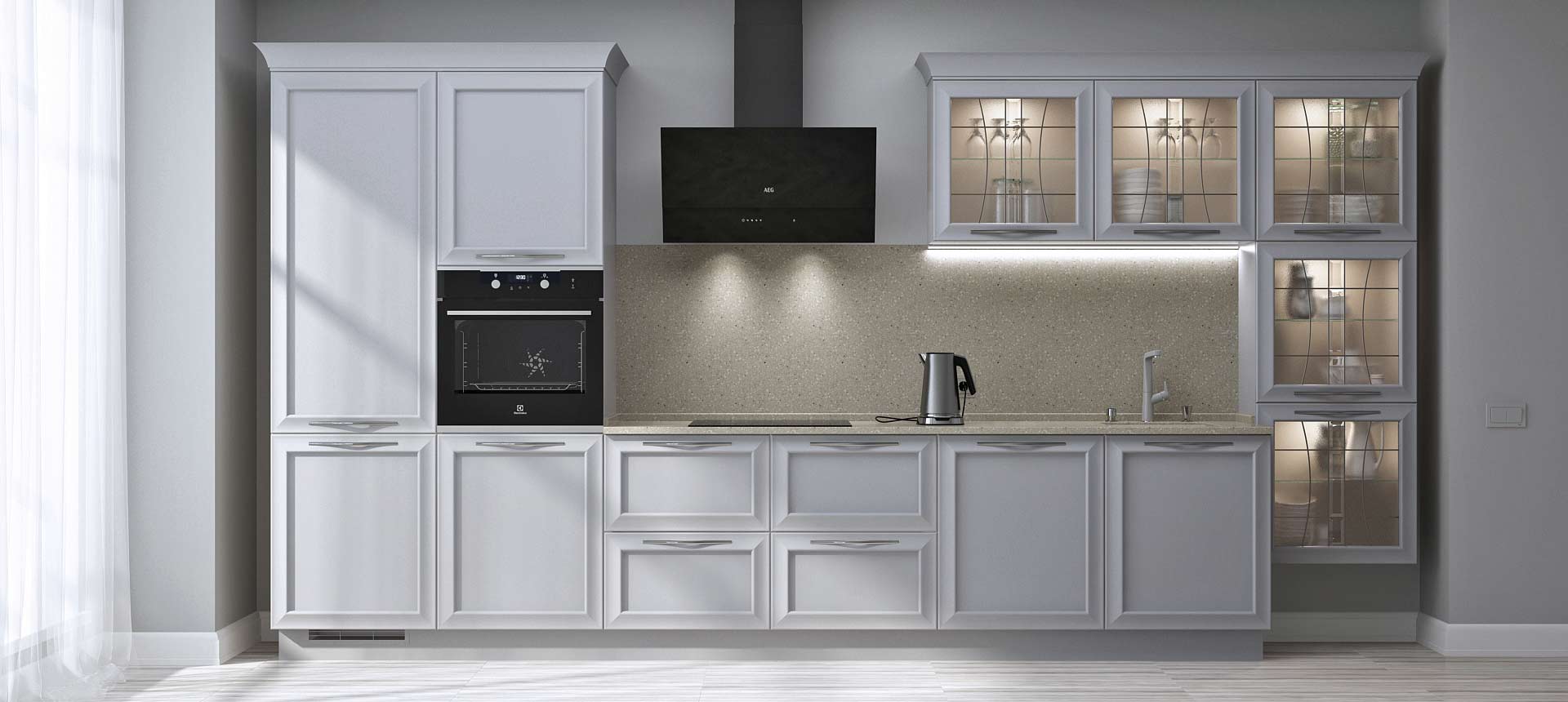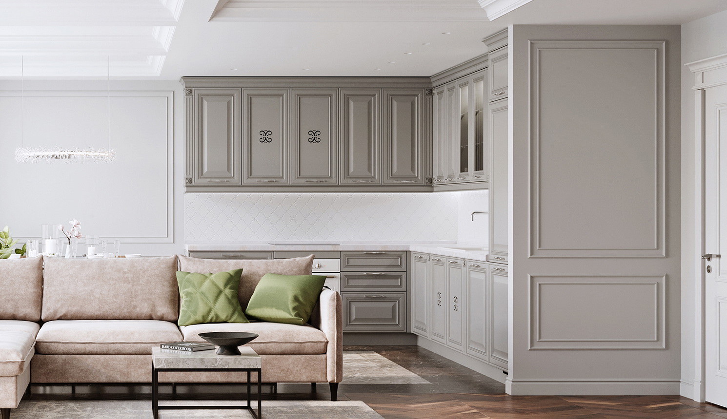 Современная классика — облегченный вариант классической кухни. Кухню в неоклассическом стиле отличает лаконичность, отсутствие выраженной патины, меньшее количество резного декора. Для нее характерны рамочные или имитирующие рамочные фасады, светлые тона и сочетание классических элементов мебели с самой современной бытовой техникой.