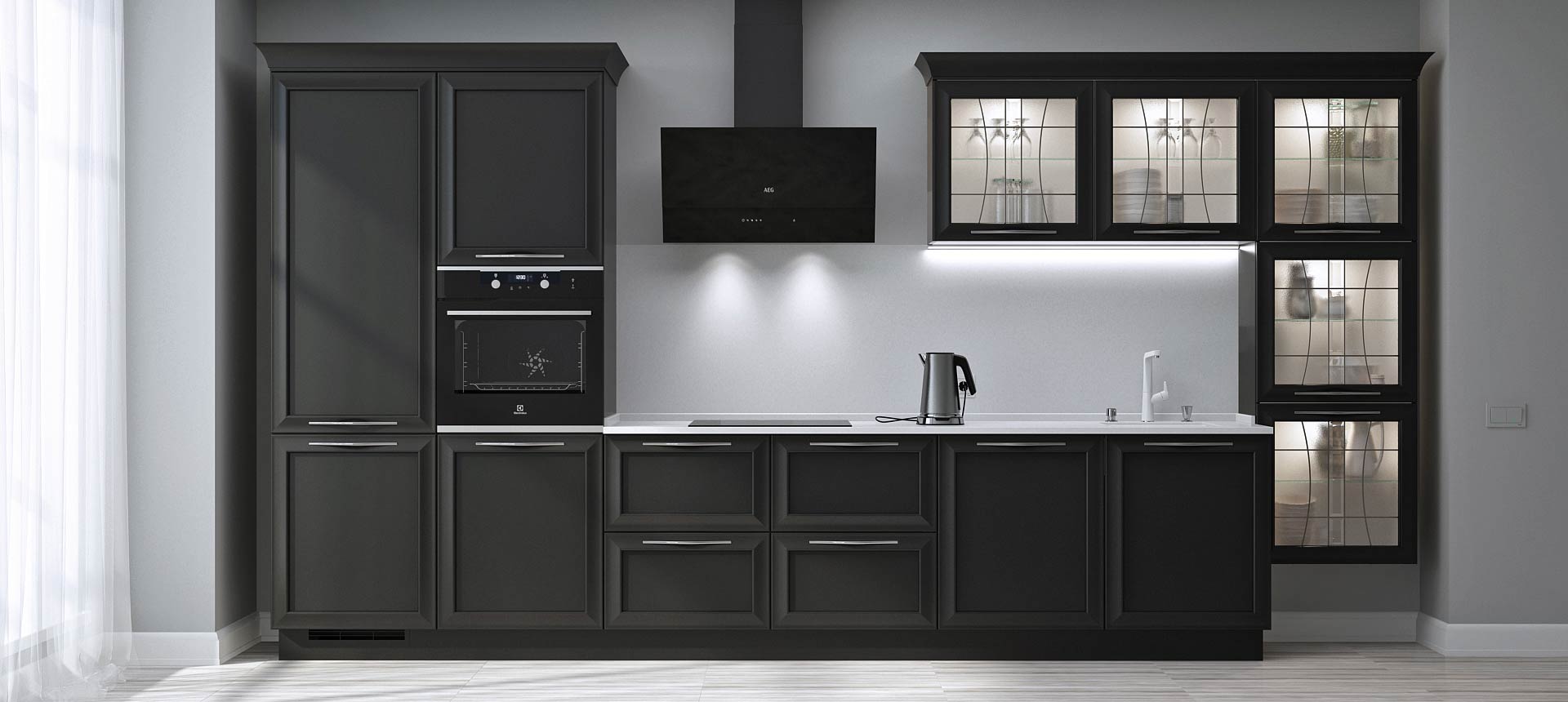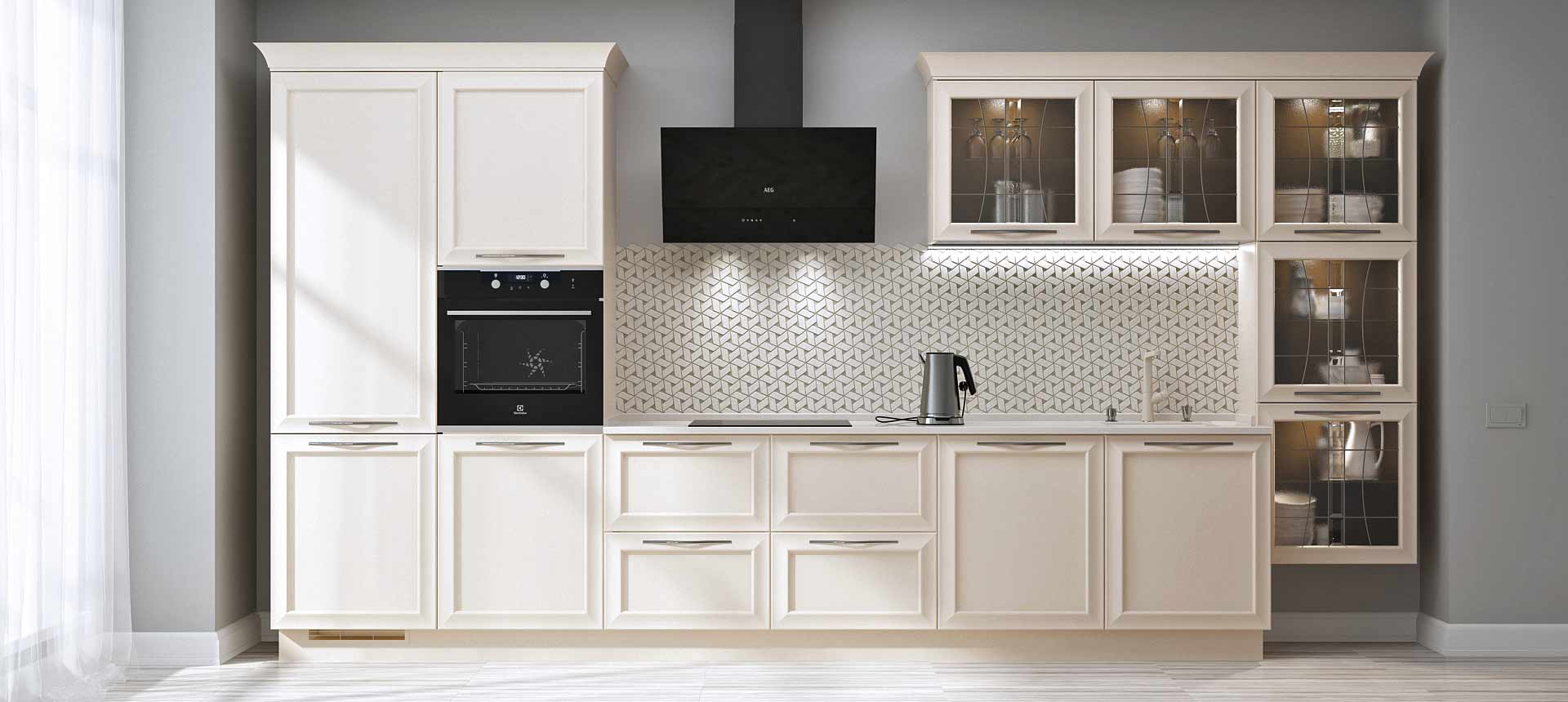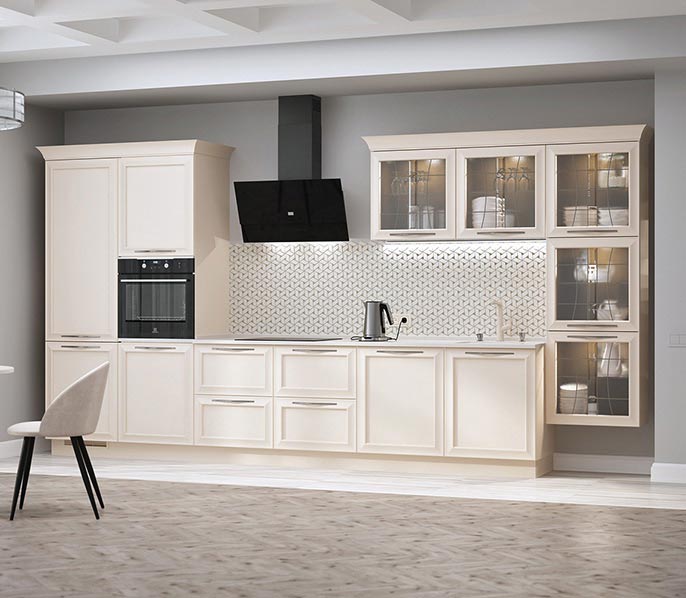 Классический интерьер кухни отличает мягкая палитра оттенков белого, бежевого, а также благородных коричневого, темно-синего или черного цветов. Сочетание цветов для классического гарнитура нехарактерно. Стиль отличают фасады с фрезеровкой и обилие фигурных украшений — карнизов, колонн, порталов и других элементов сложной формы. Часто такой интерьер дополняют винтажные детали и элементы декора, бытовая техника и вытяжка в стиле ретро. Классическая кухня — сочетание симметрии и простора. Стеклянные детали часто оформляются витражами, подчеркивающими роскошь интерьера. Подробнее о кухнях в классическом стиле вы можете прочитать в статье.