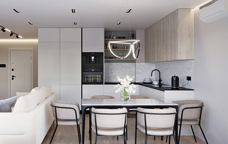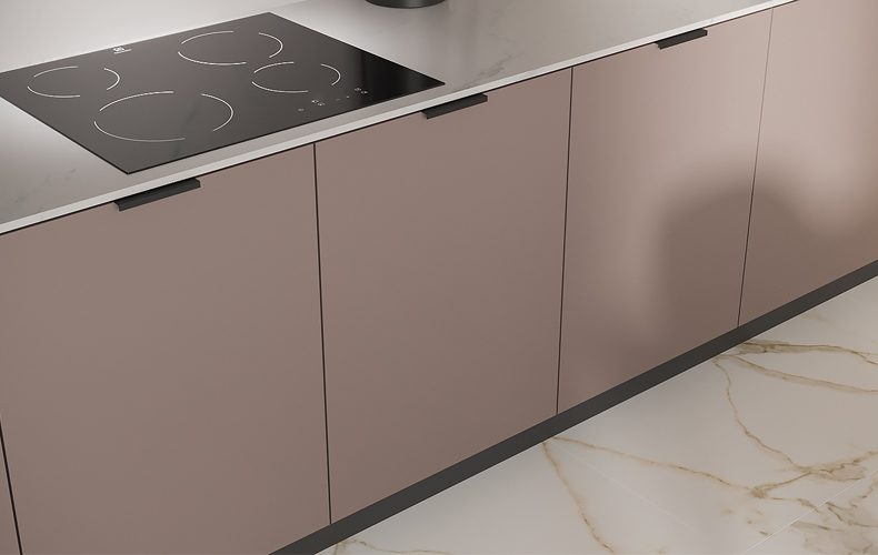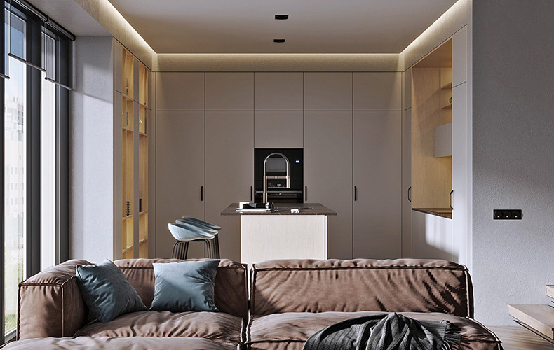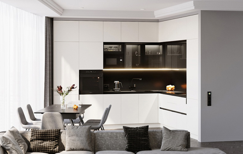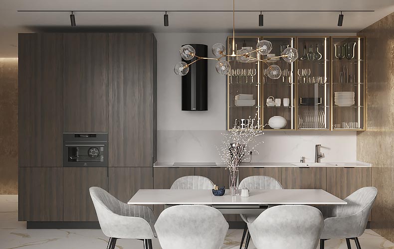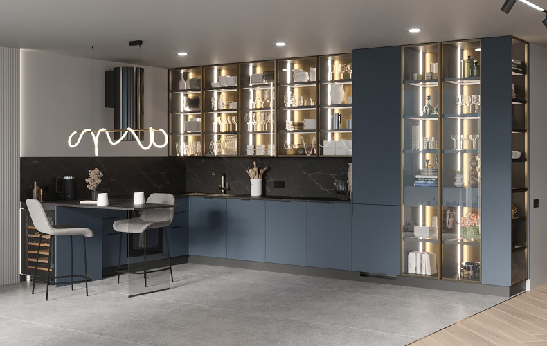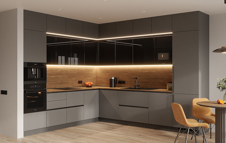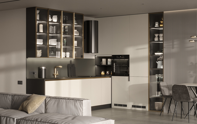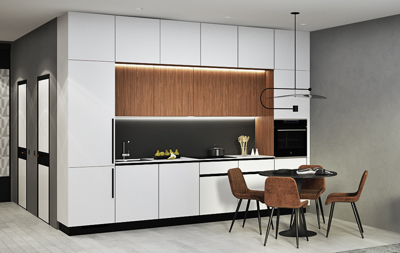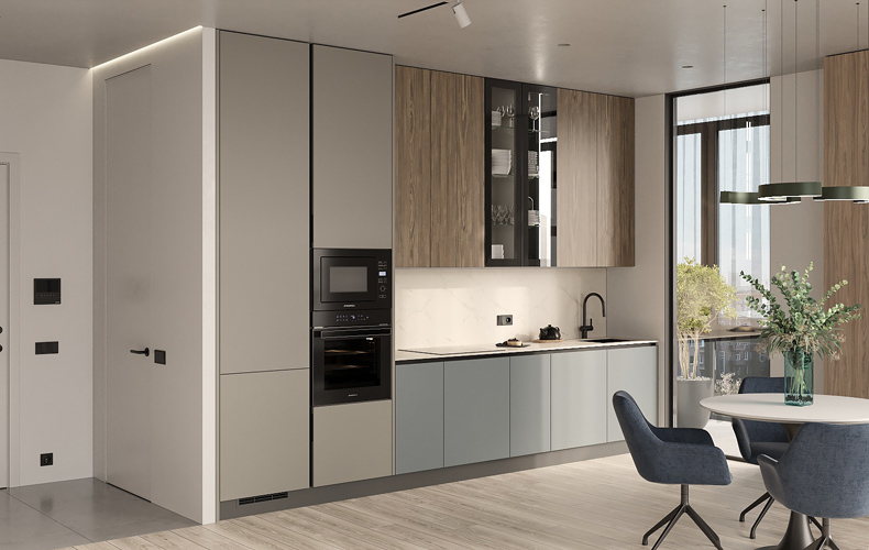 Кухонный гарнитур Маттео 25 - вариант с прямой конфигурацией, встроенной в нишу, для кухни-гостиной. Гарнитур представлен матовыми фасадами колонок, верхних и нижних шкафов и стеклами для навесной секции. В колонки вынесены духовой шкаф, свч-печь и холодильник. В рабочей зоне размещается мойка со смесителем, варочная поверхность и вытяжка. Установлена локальная подсветка.