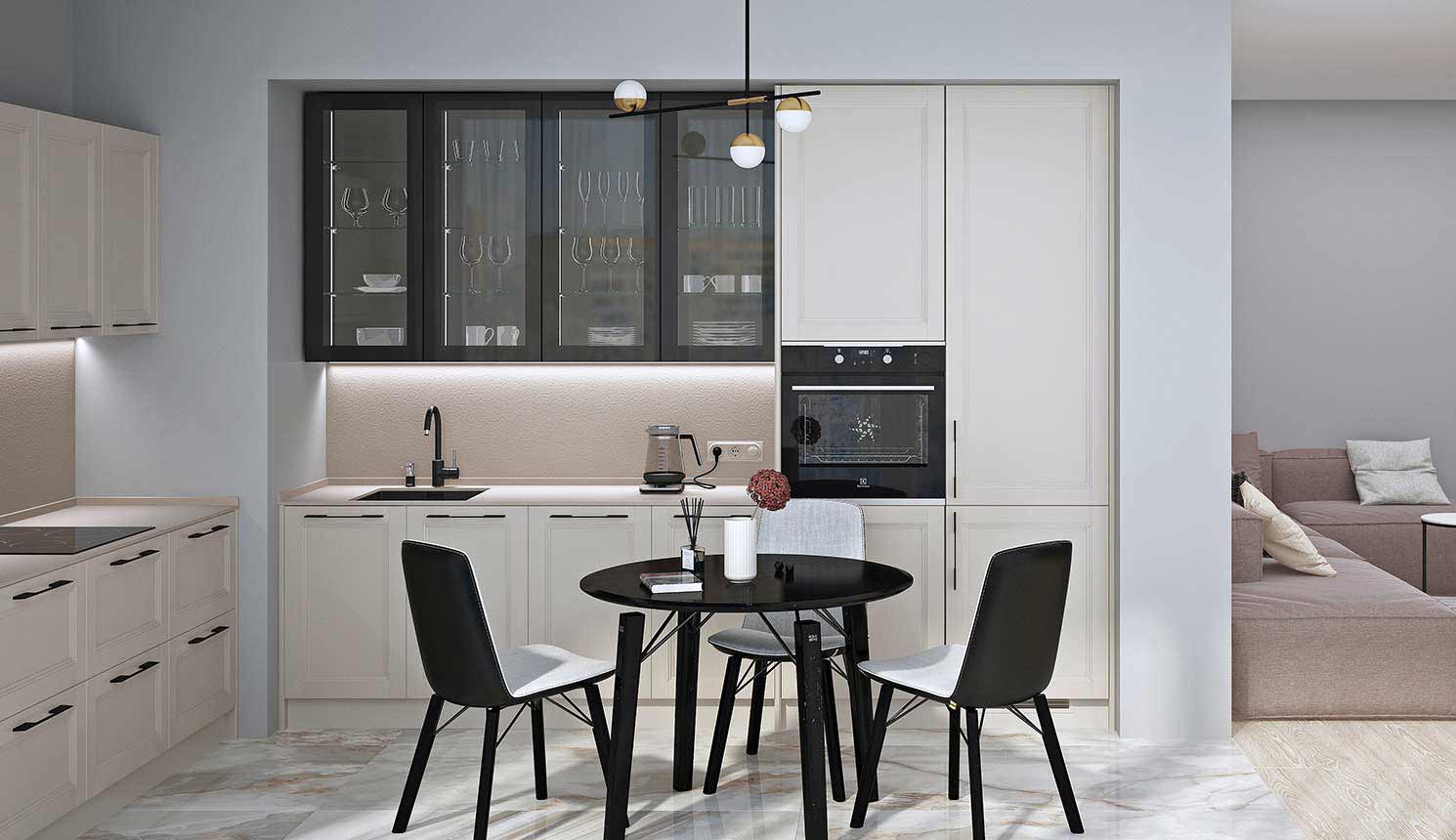 Светлая функциональная квартира в бежевых тонах для семьи из трех человек