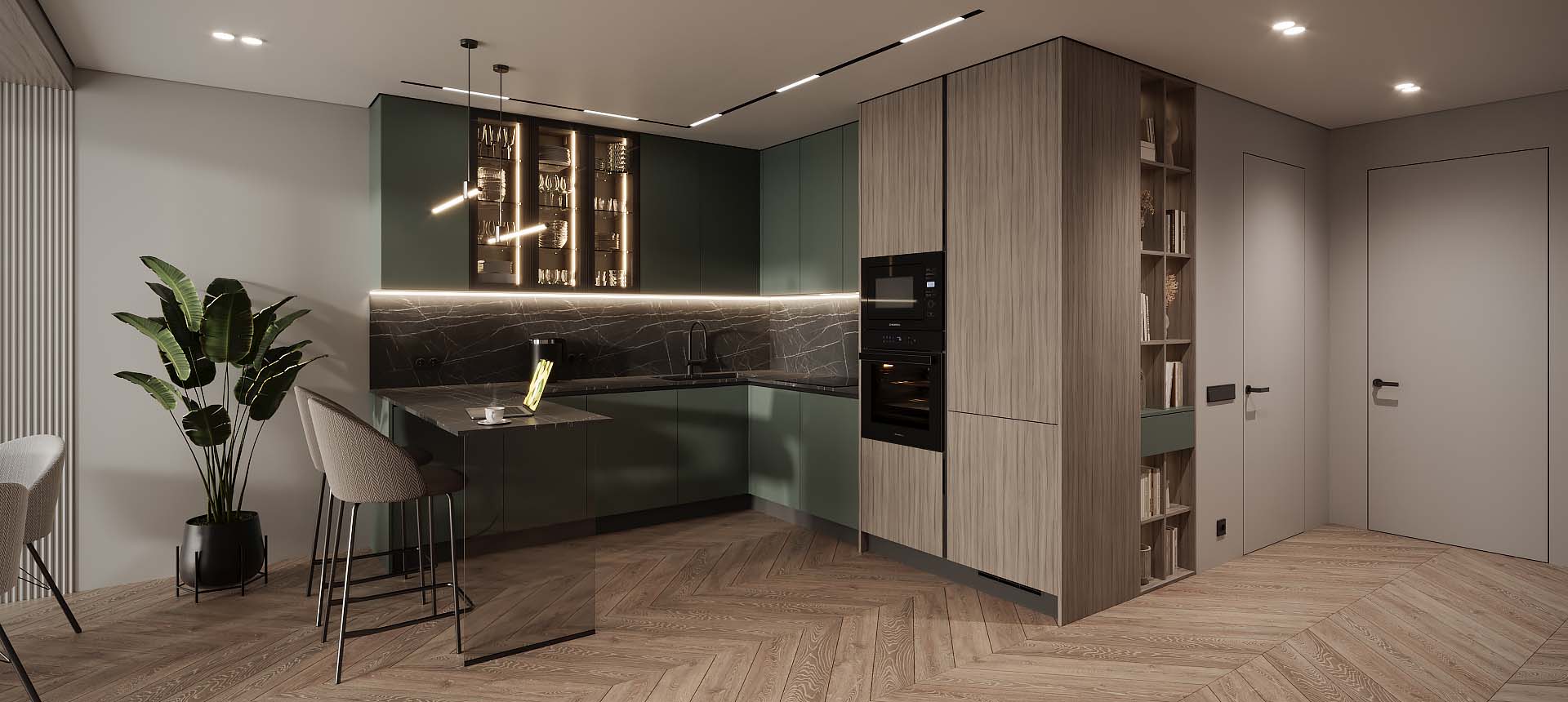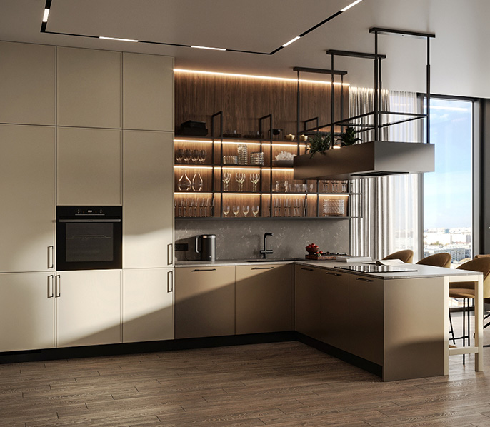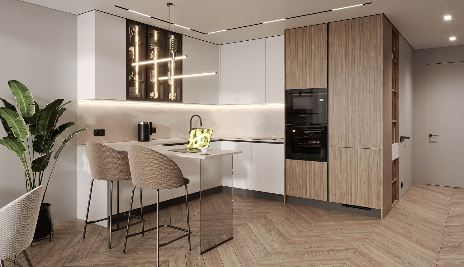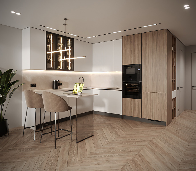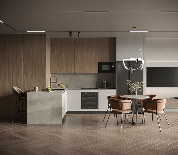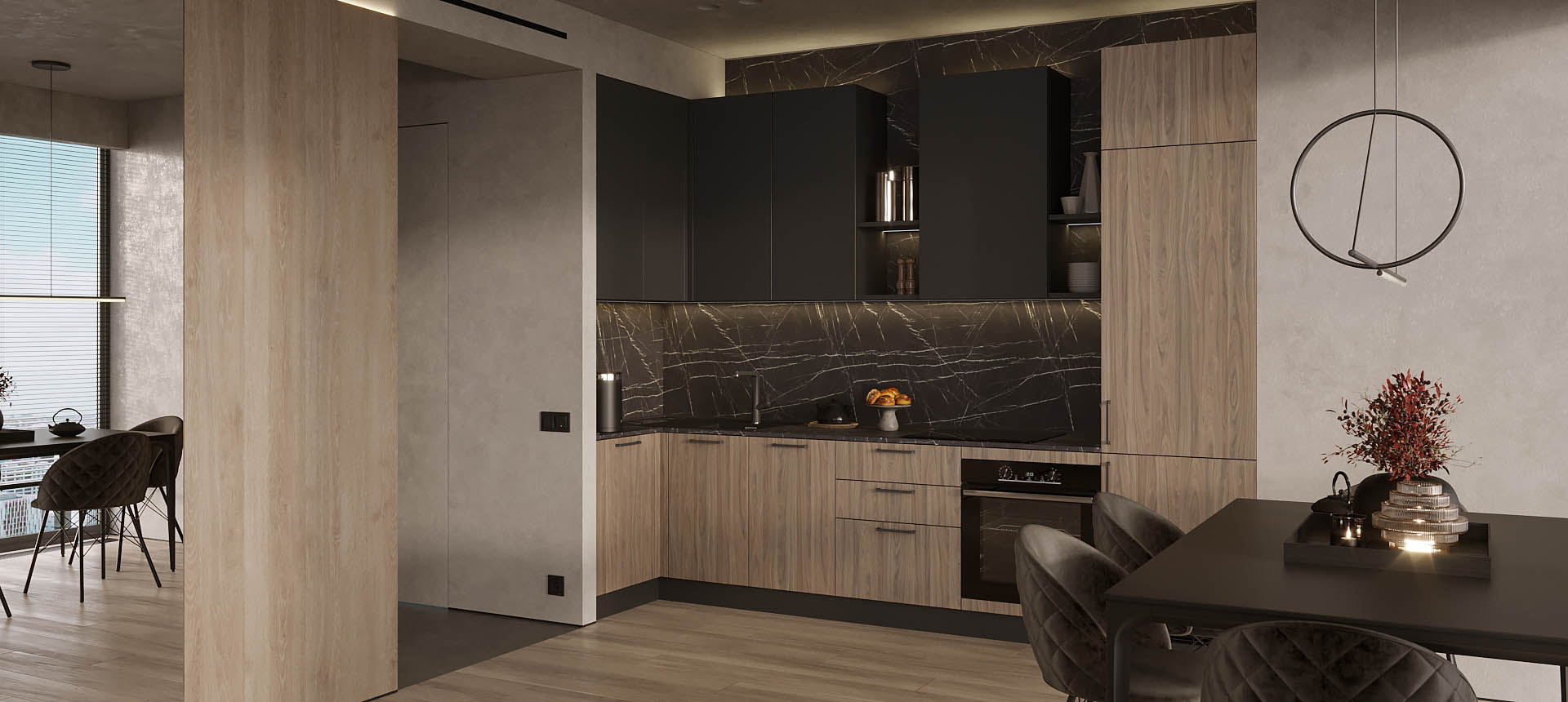 • Красивая кухня с золотыми акцентами в двухкомнатной квартире бизнес-класса