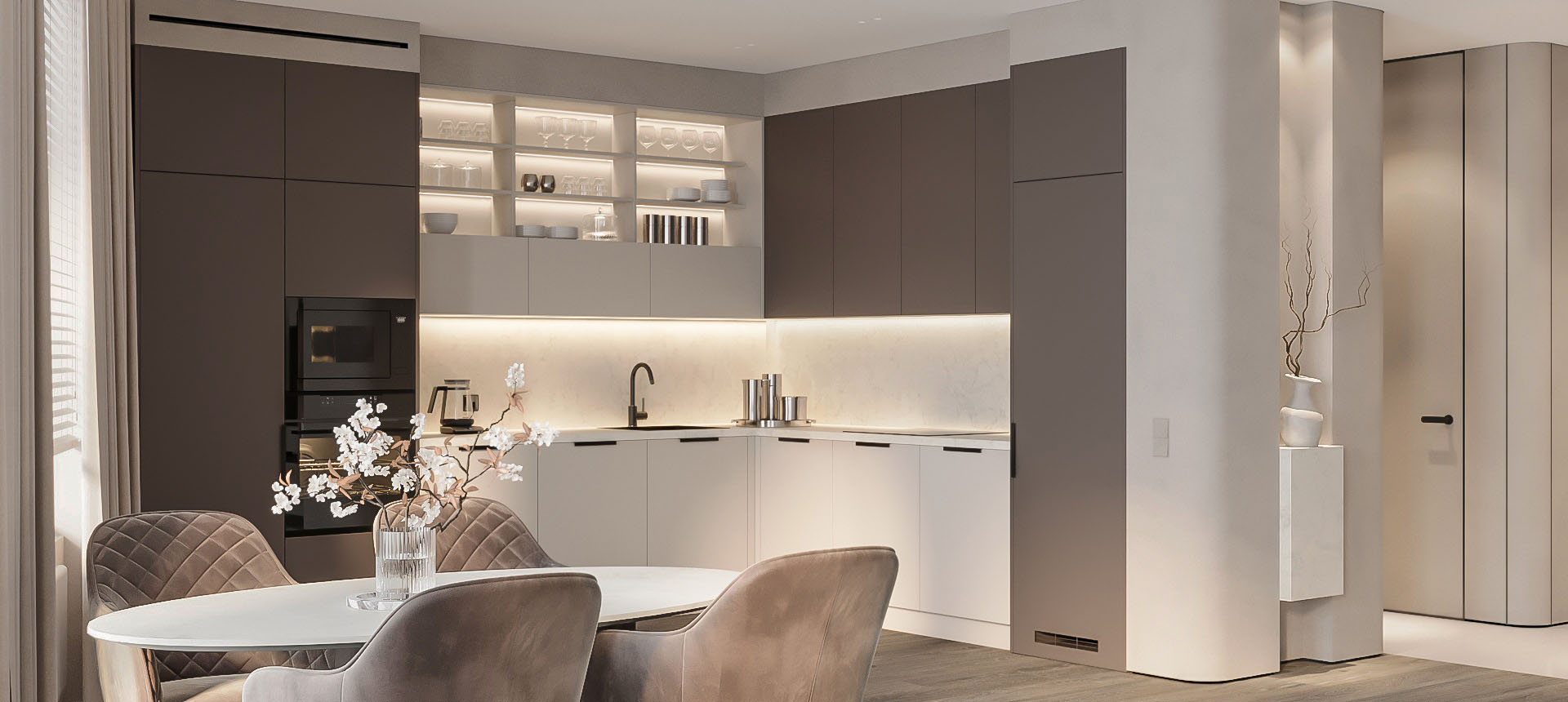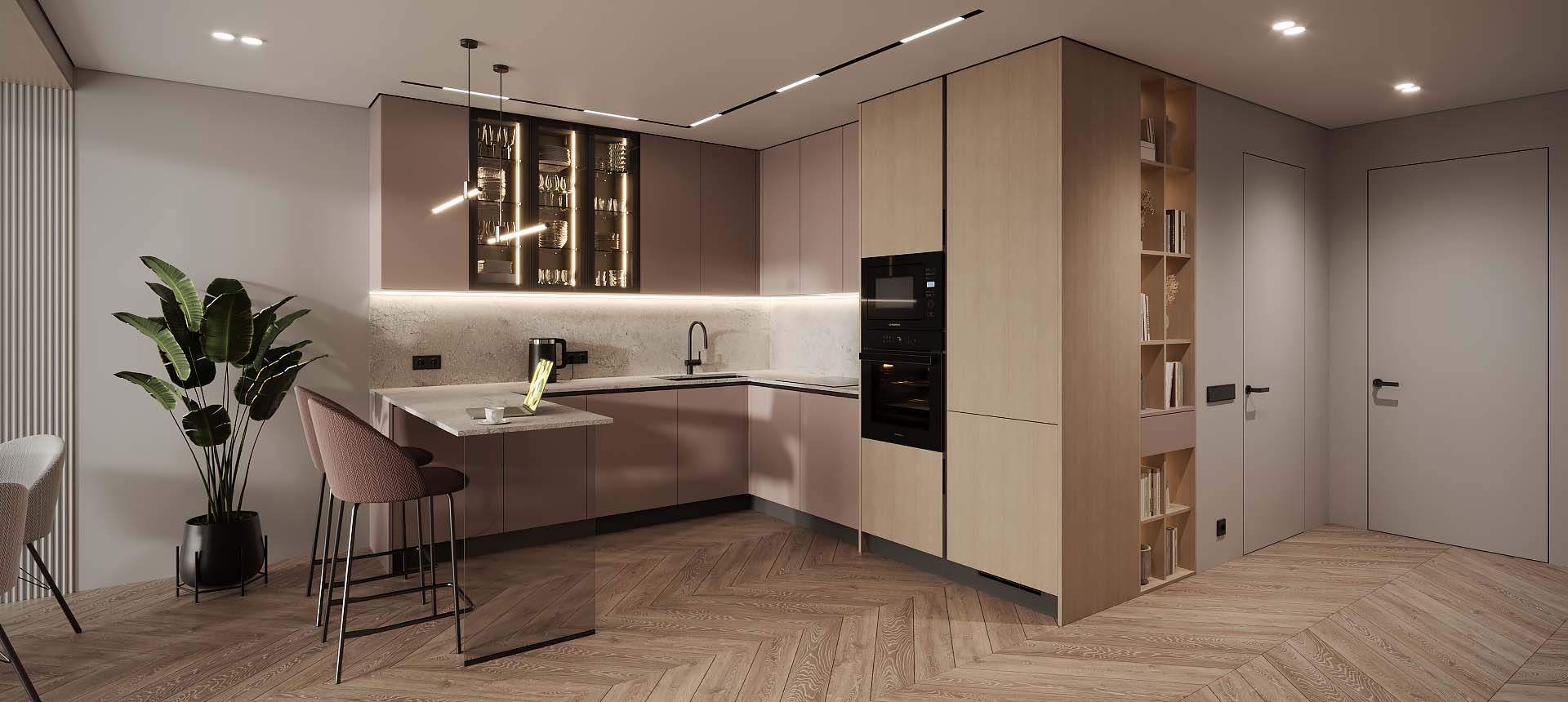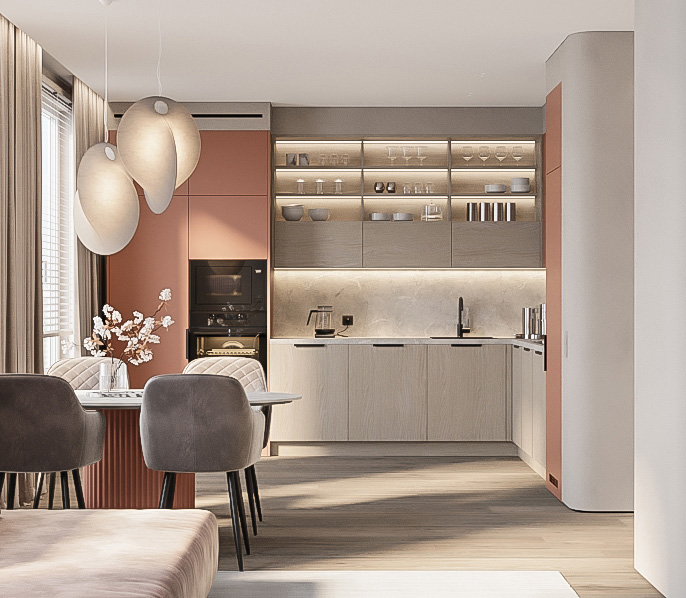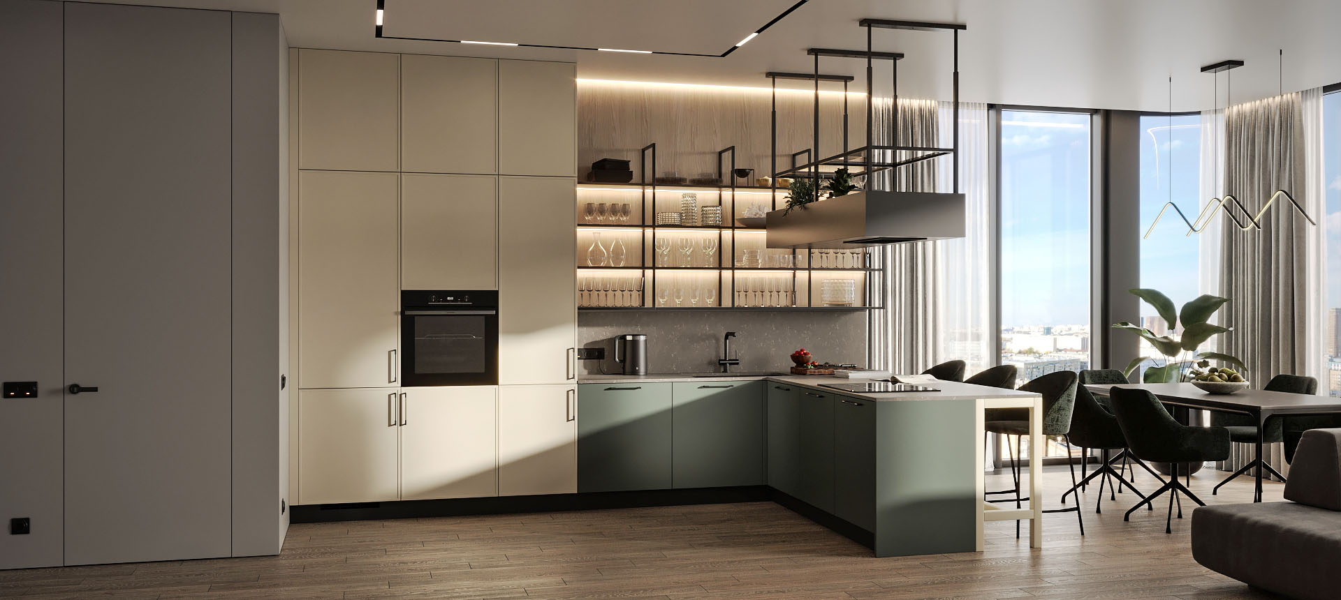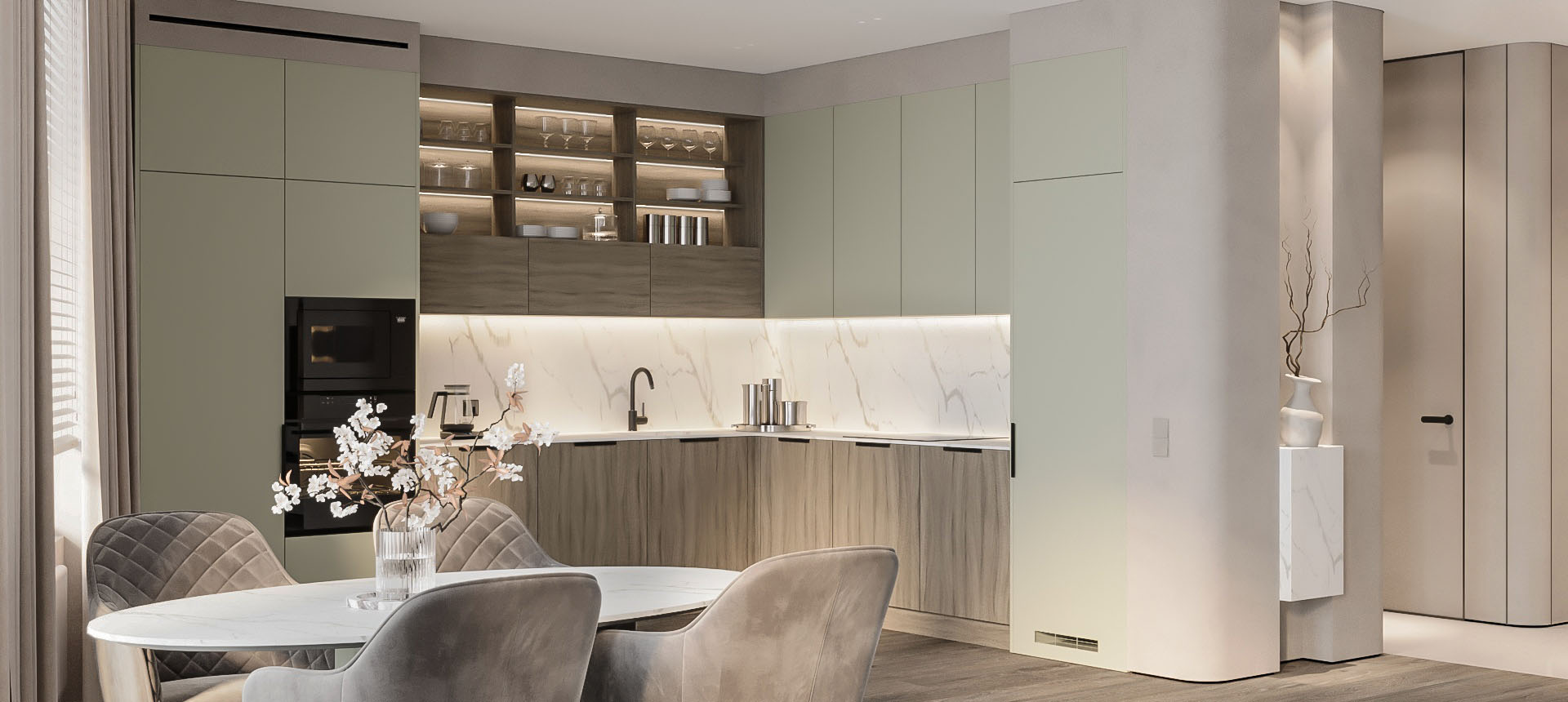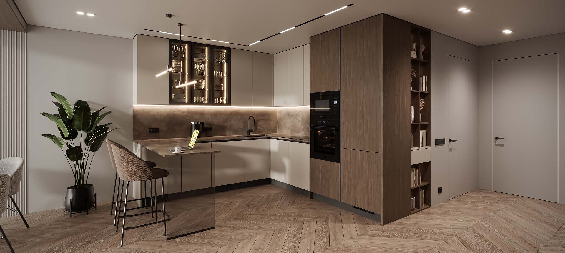 • Красивая кухня с золотыми акцентами в двухкомнатной квартире бизнес-класса