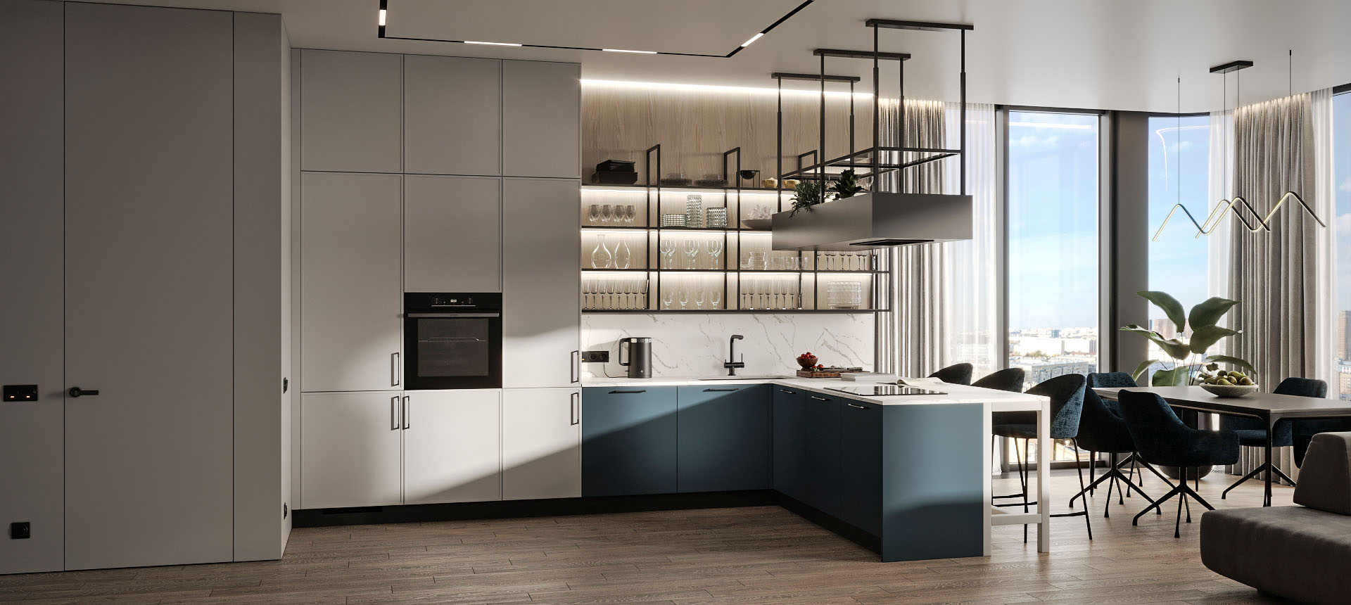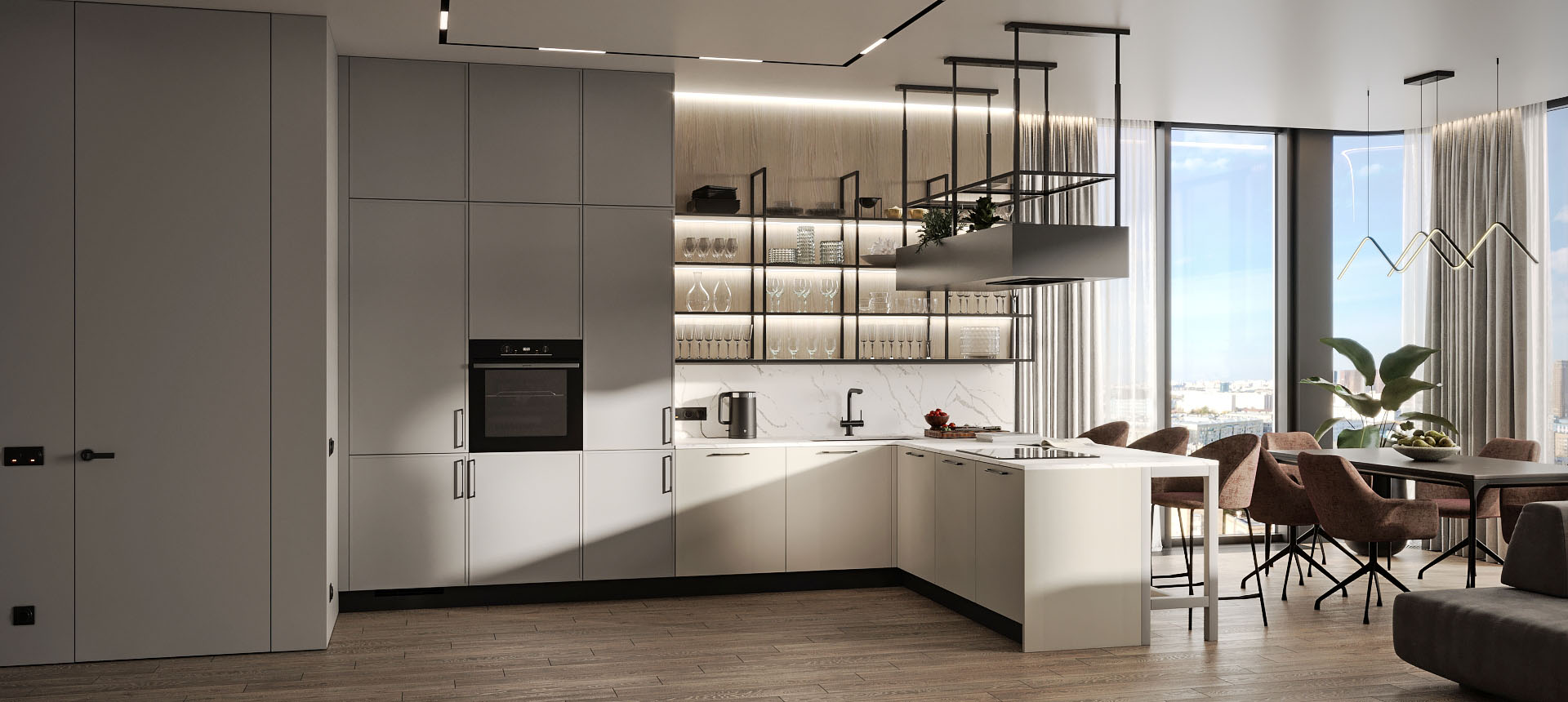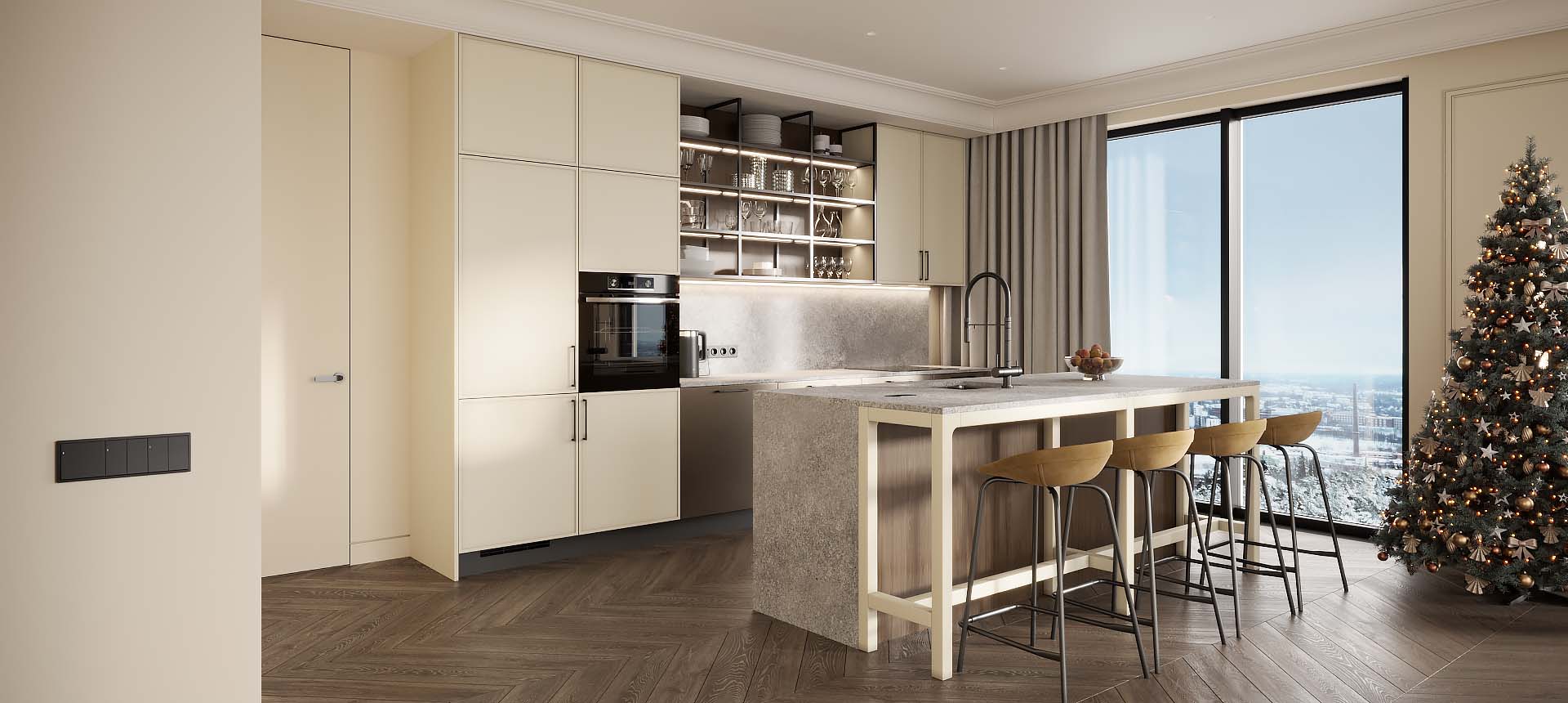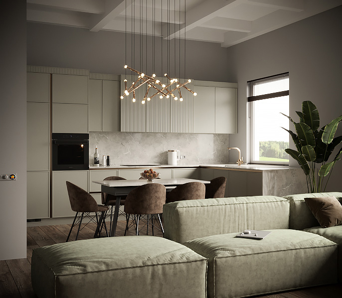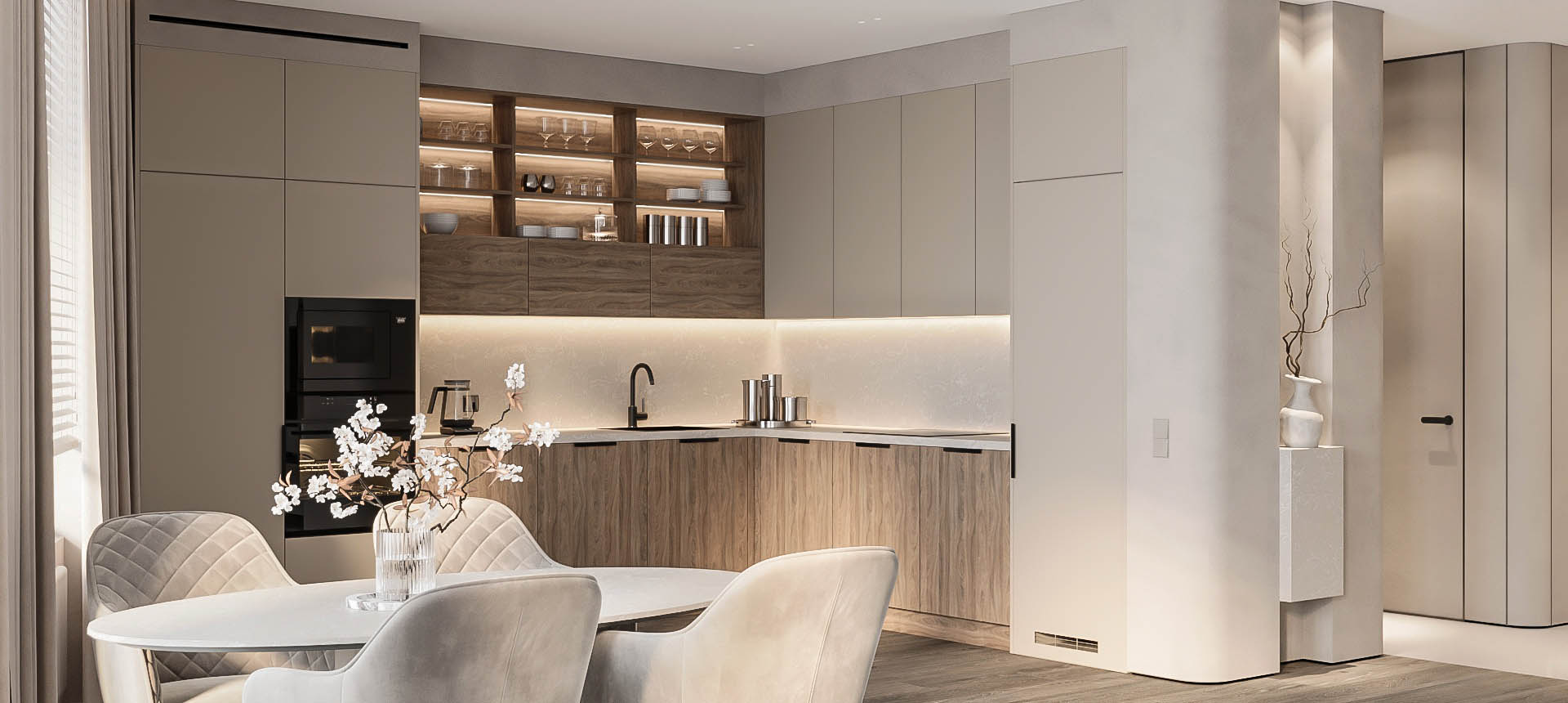 • Красивая кухня с золотыми акцентами в двухкомнатной квартире бизнес-класса
