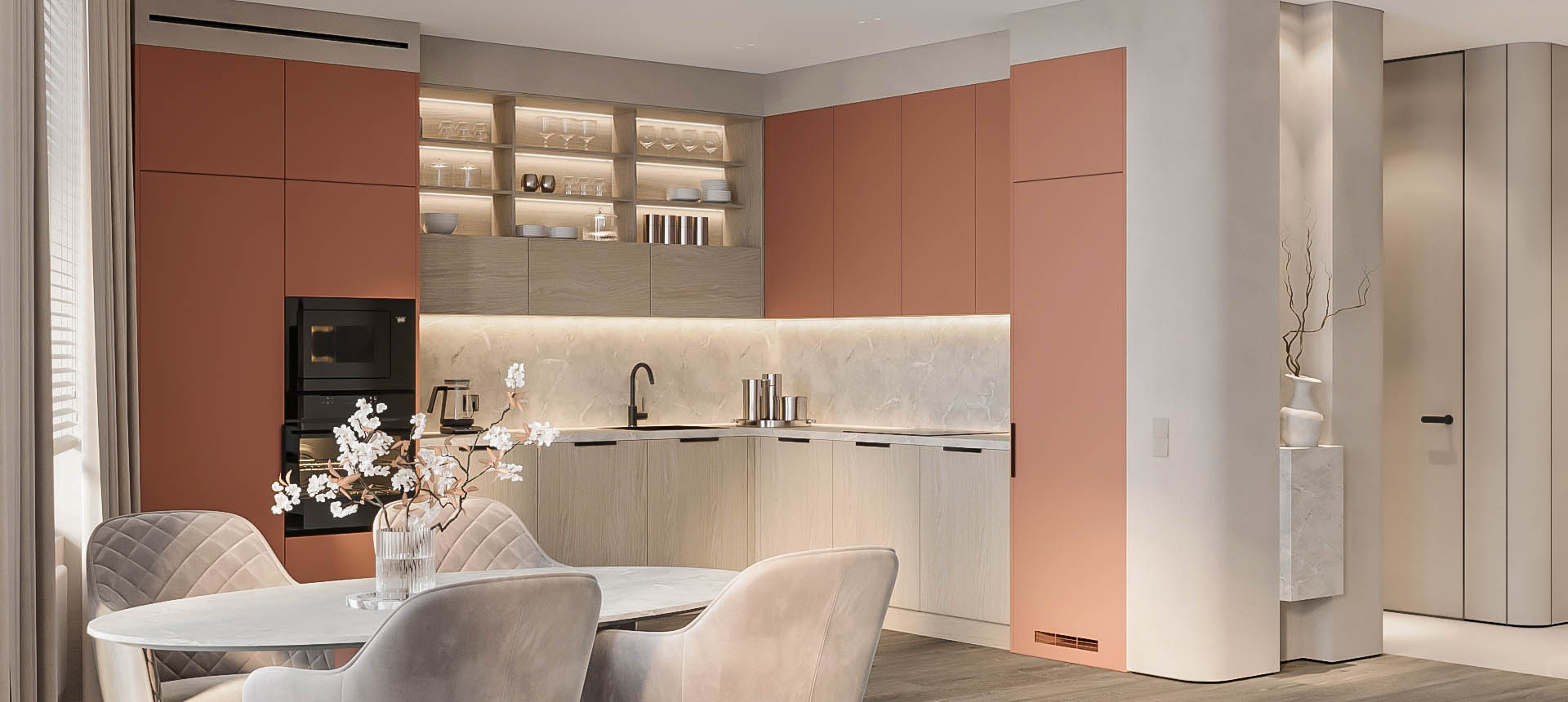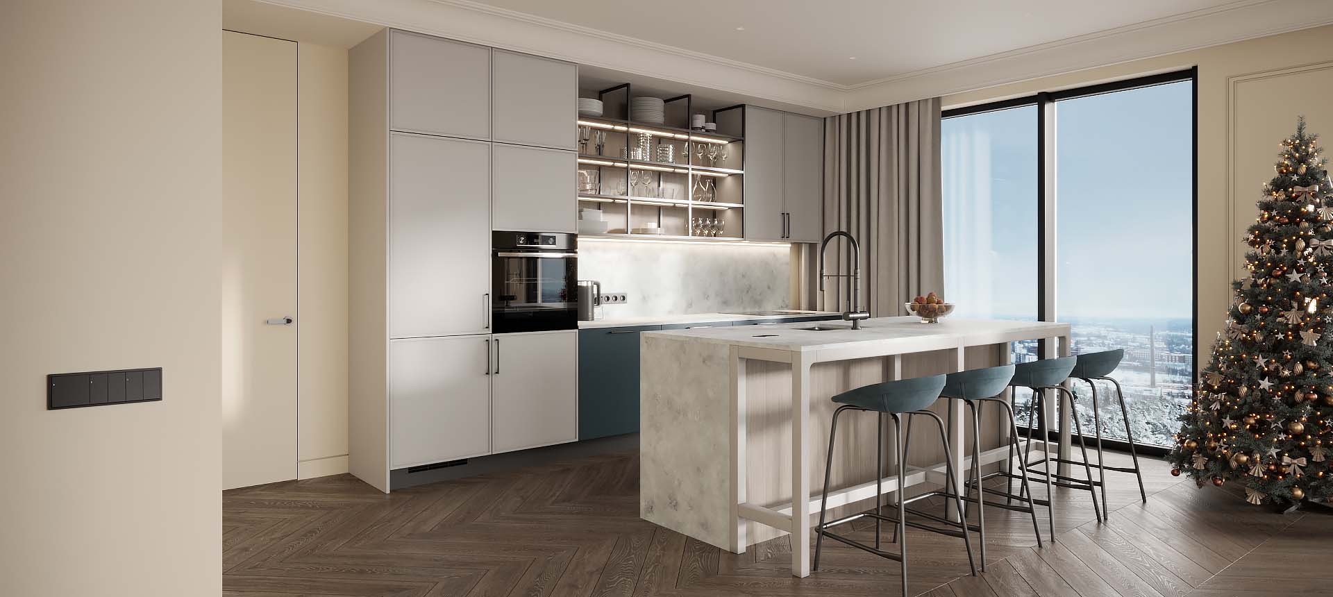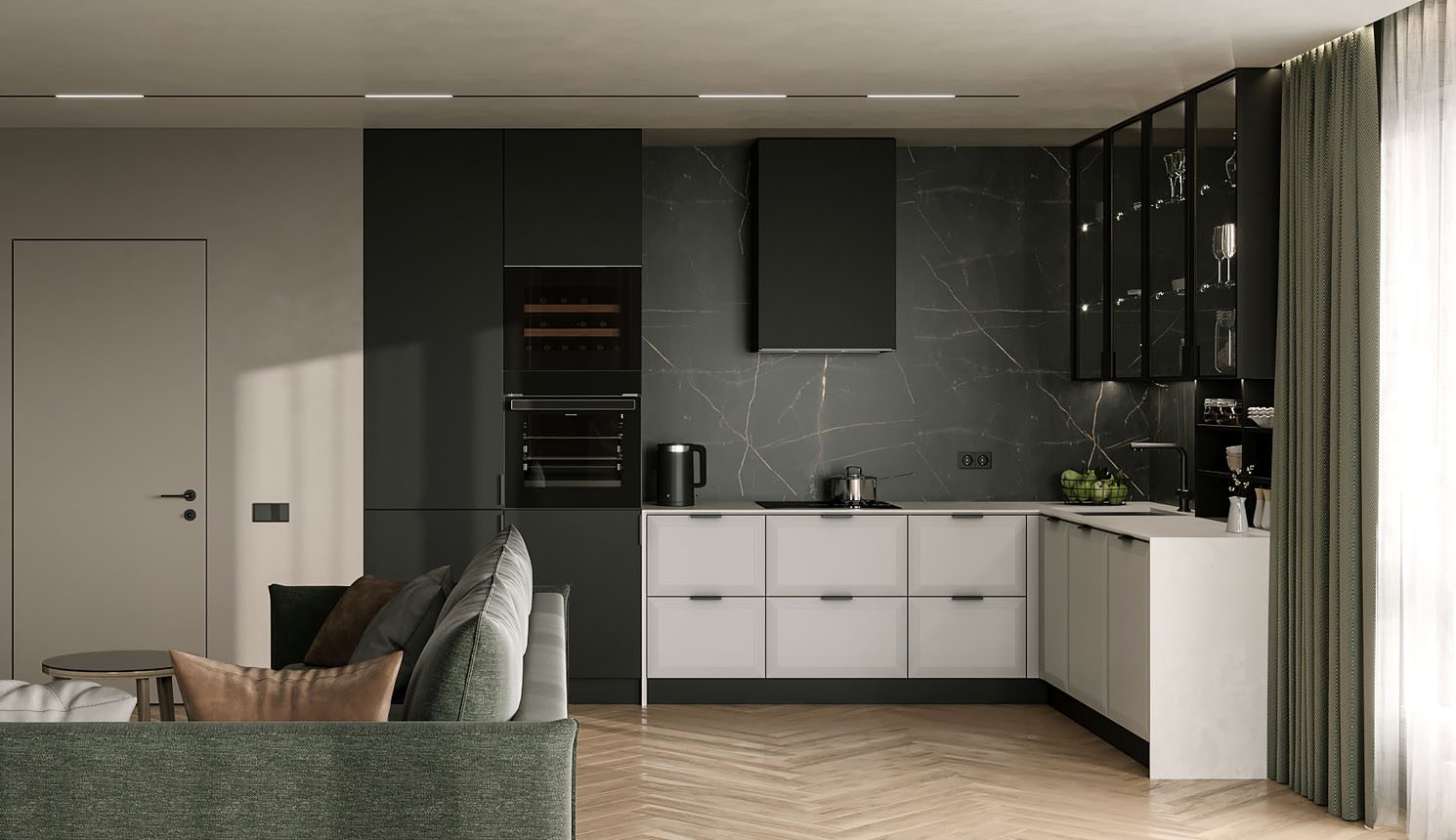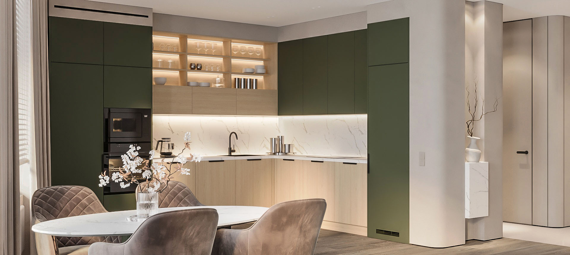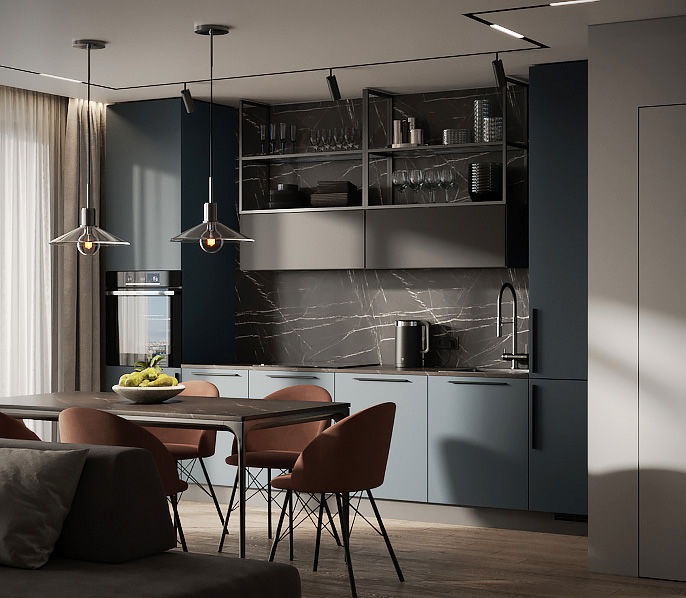 • Красивая кухня с золотыми акцентами в двухкомнатной квартире бизнес-класса
