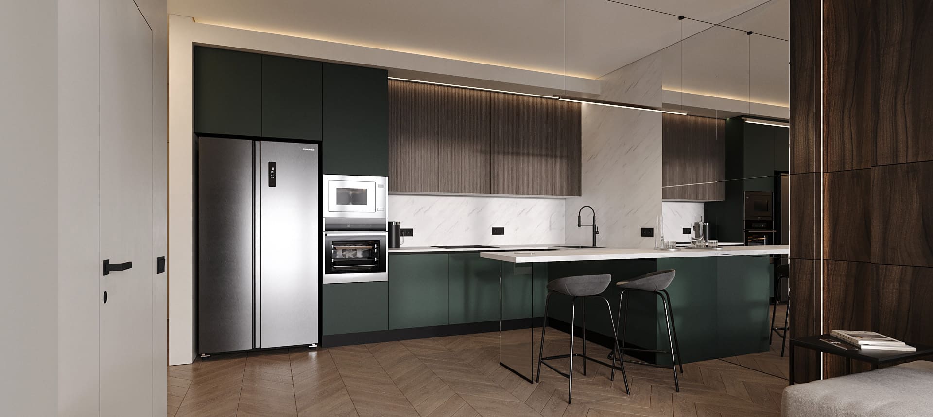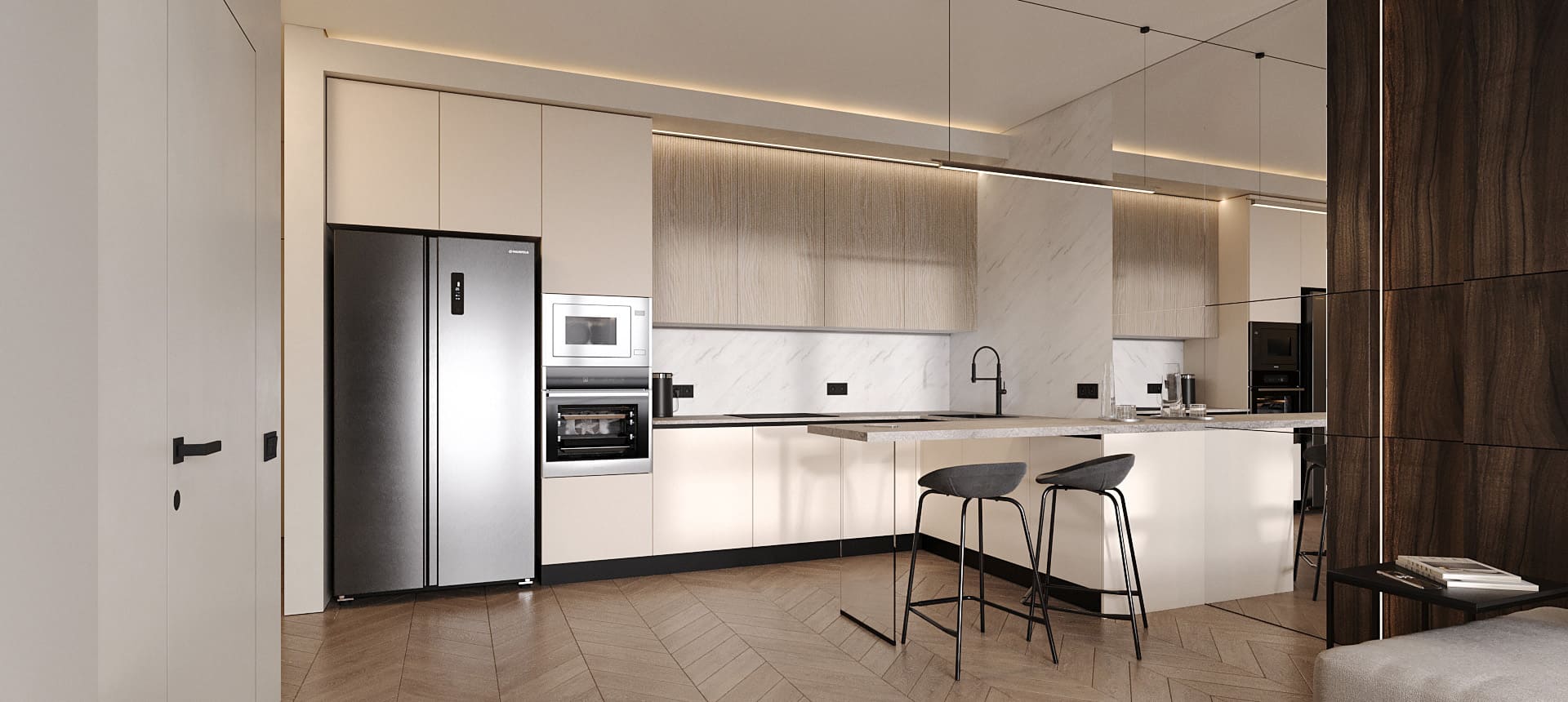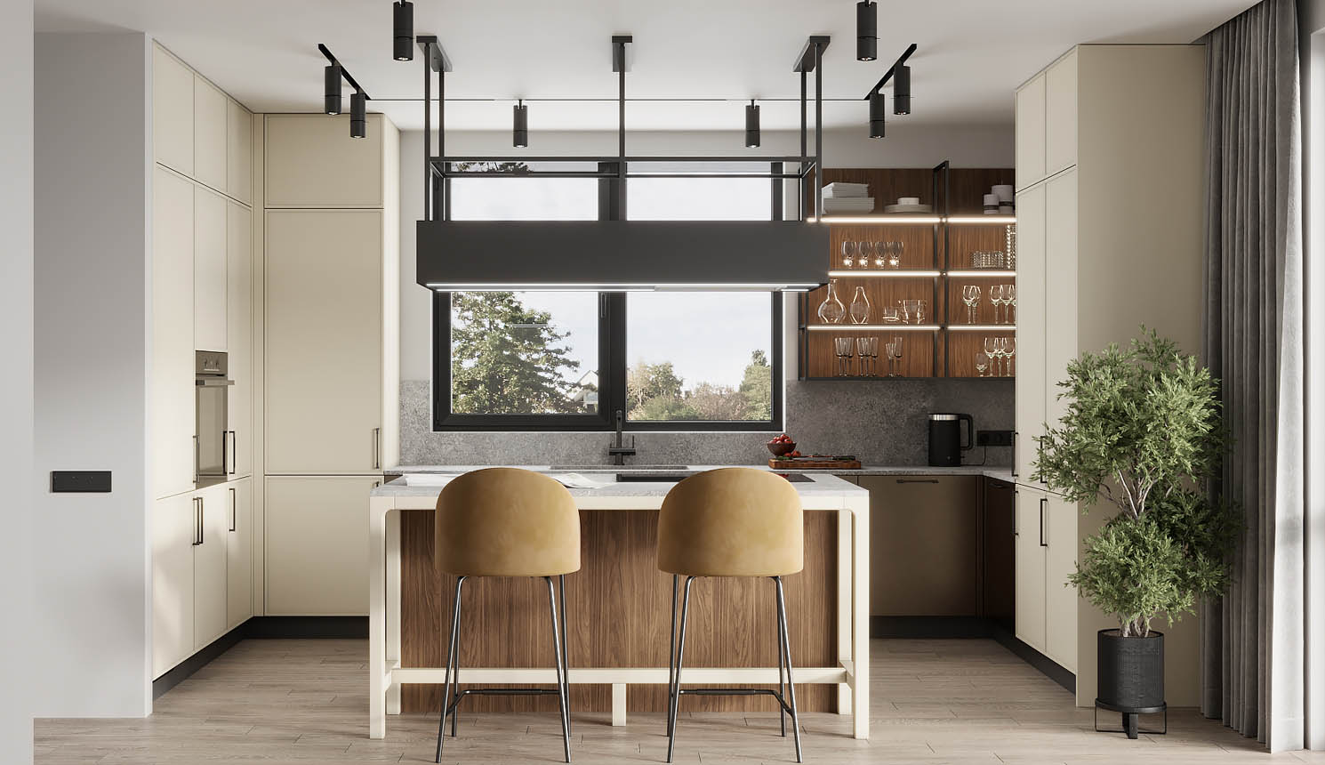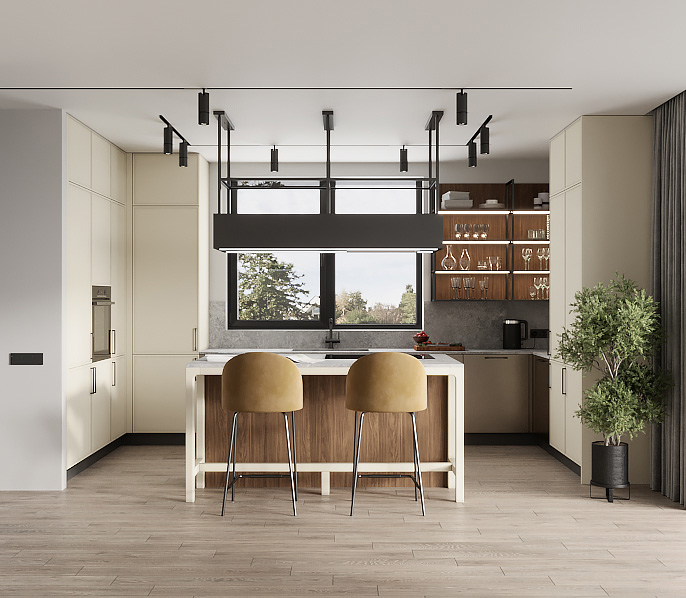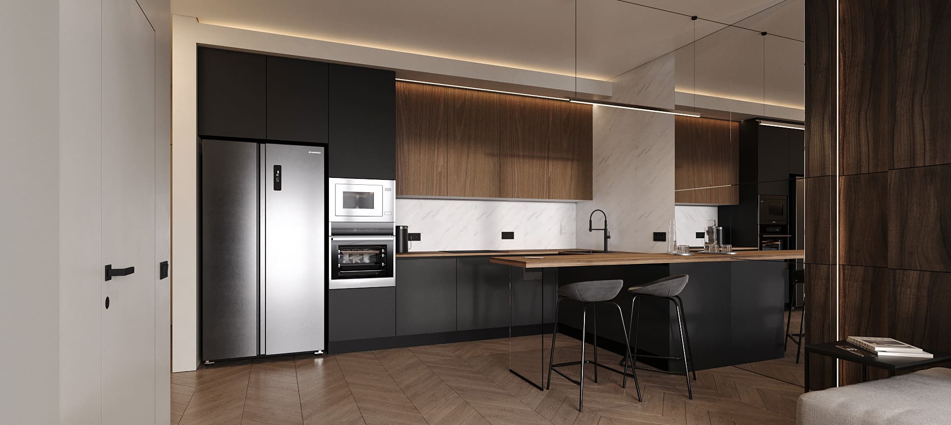 • Красивая кухня с золотыми акцентами в двухкомнатной квартире бизнес-класса