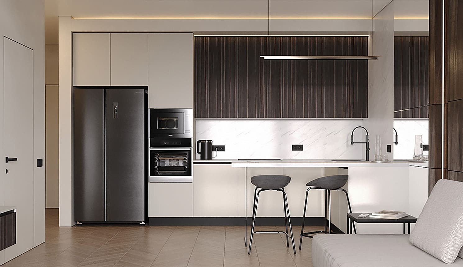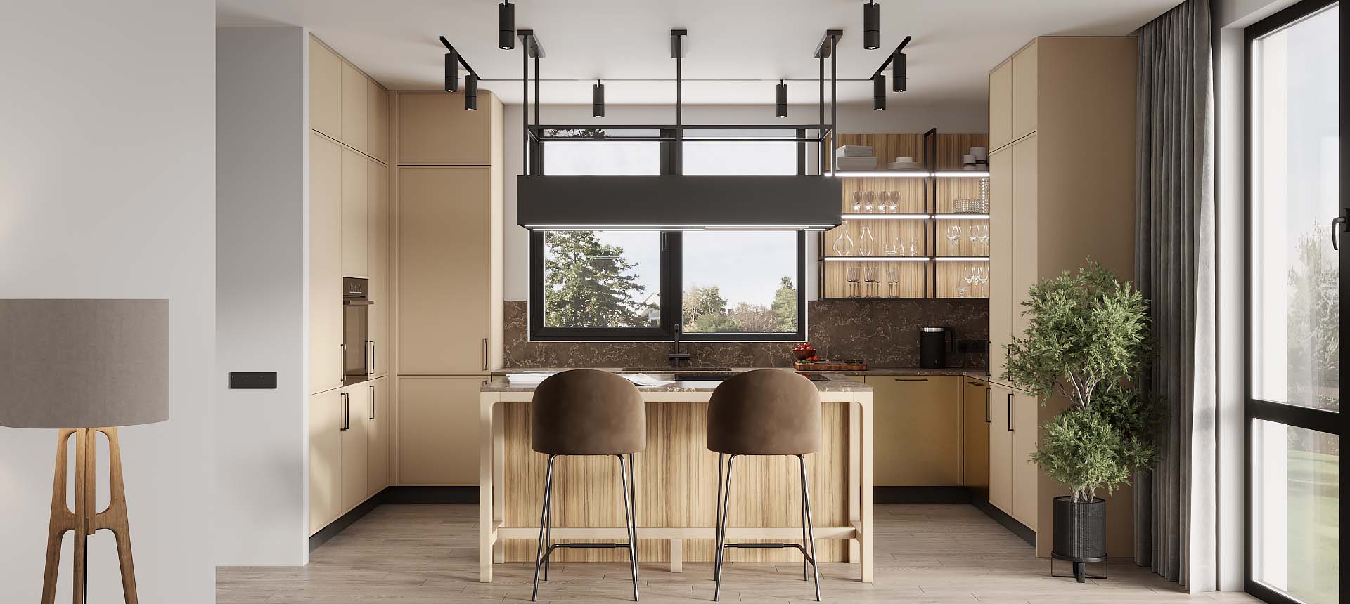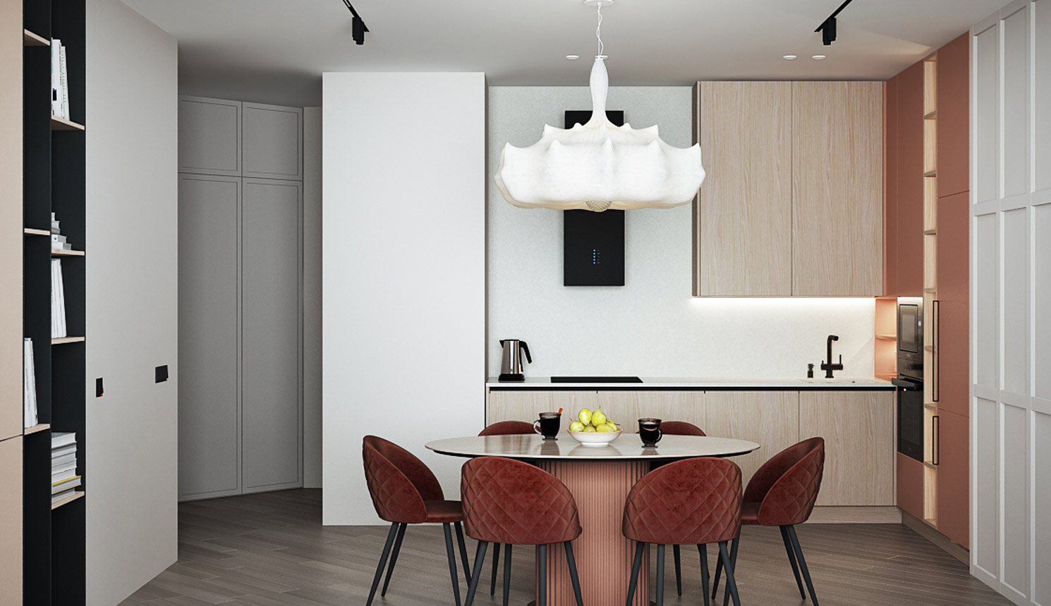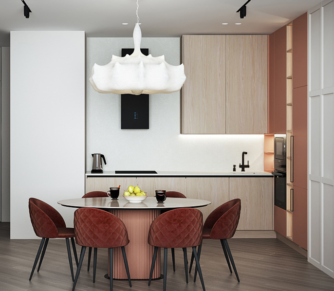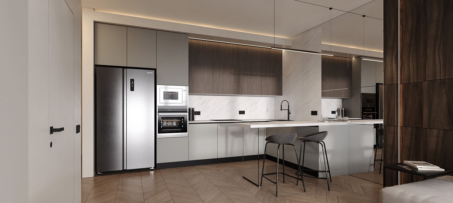 • Красивая кухня с золотыми акцентами в двухкомнатной квартире бизнес-класса
