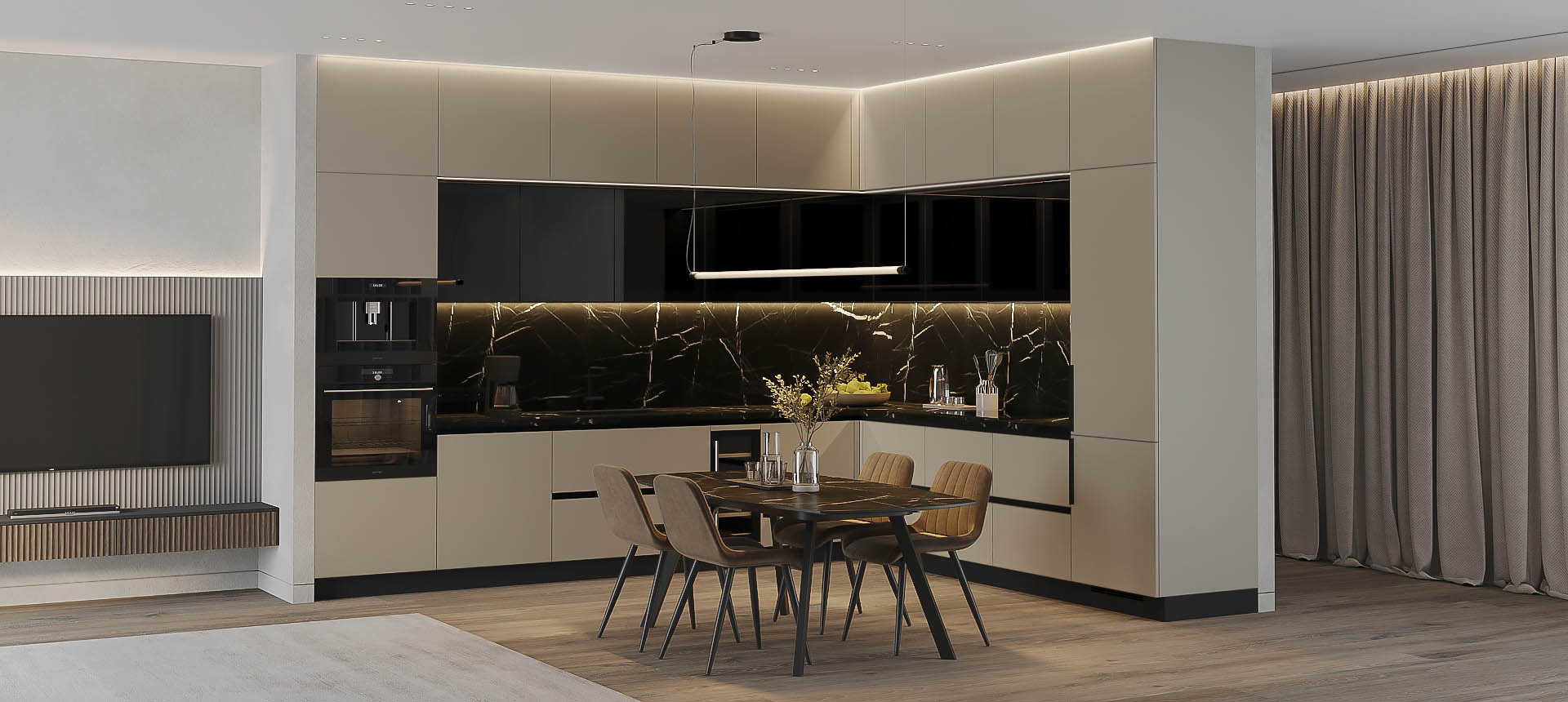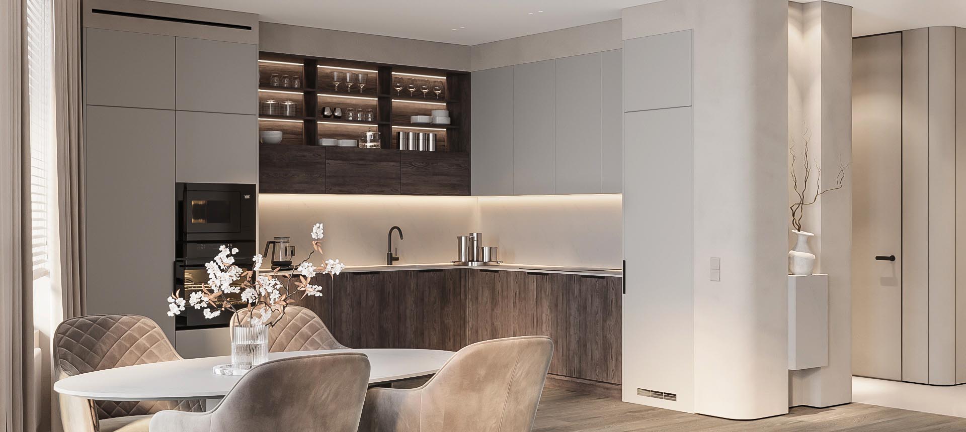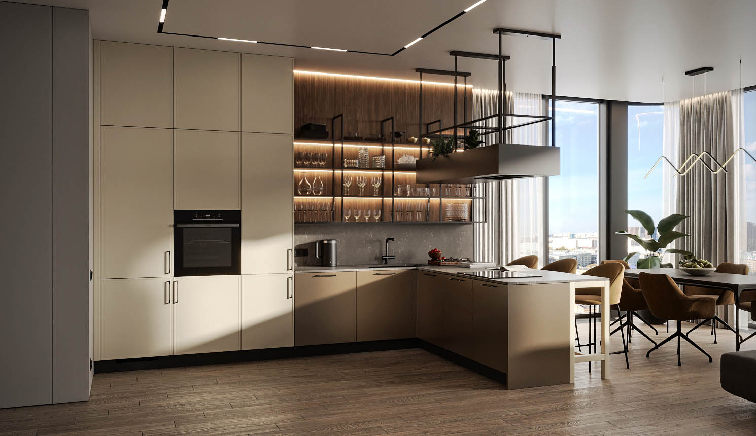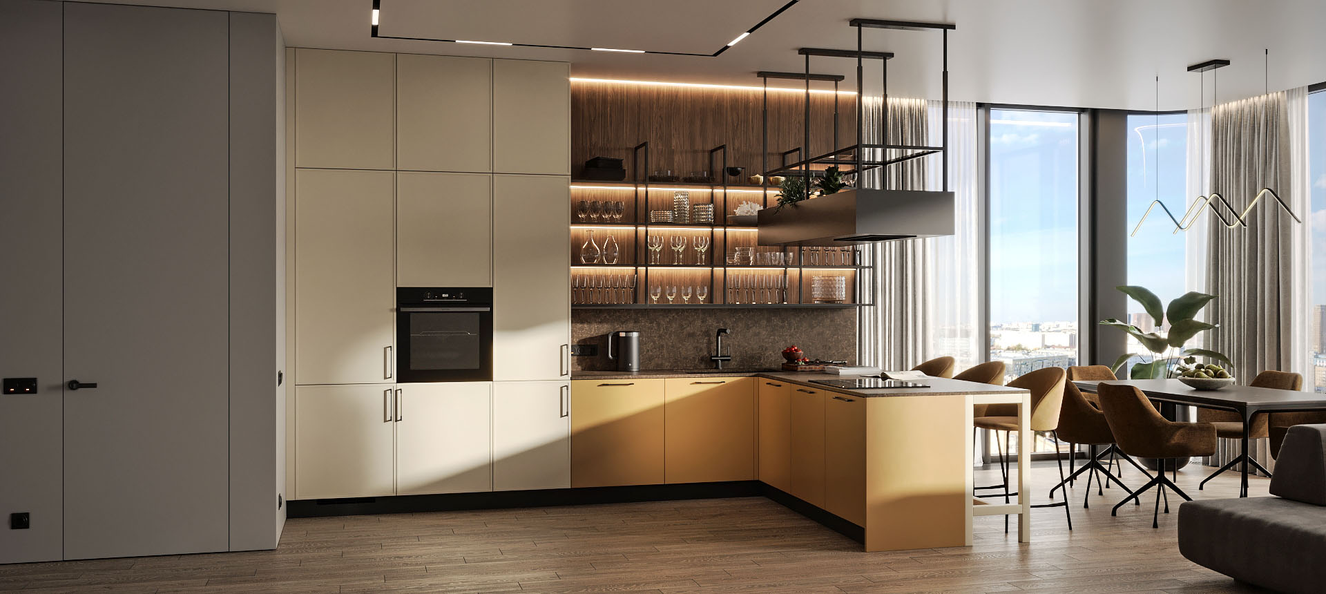 Красивая кухня с золотыми акцентами в двухкомнатной квартире бизнес-класса