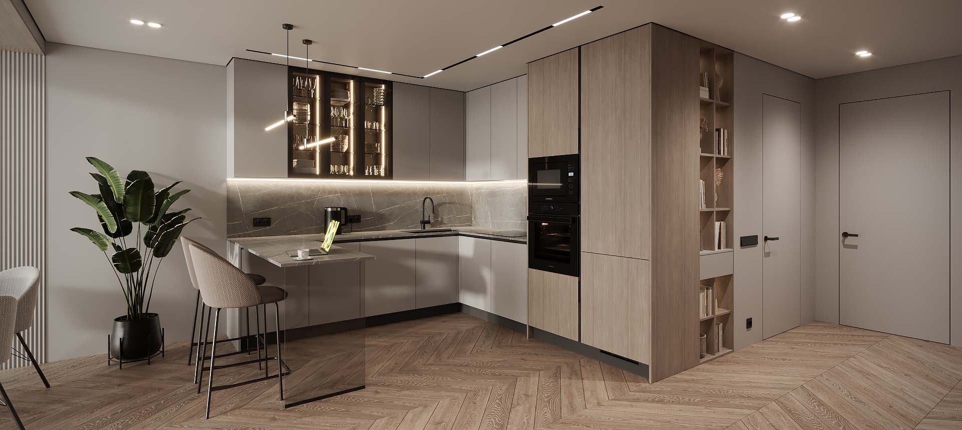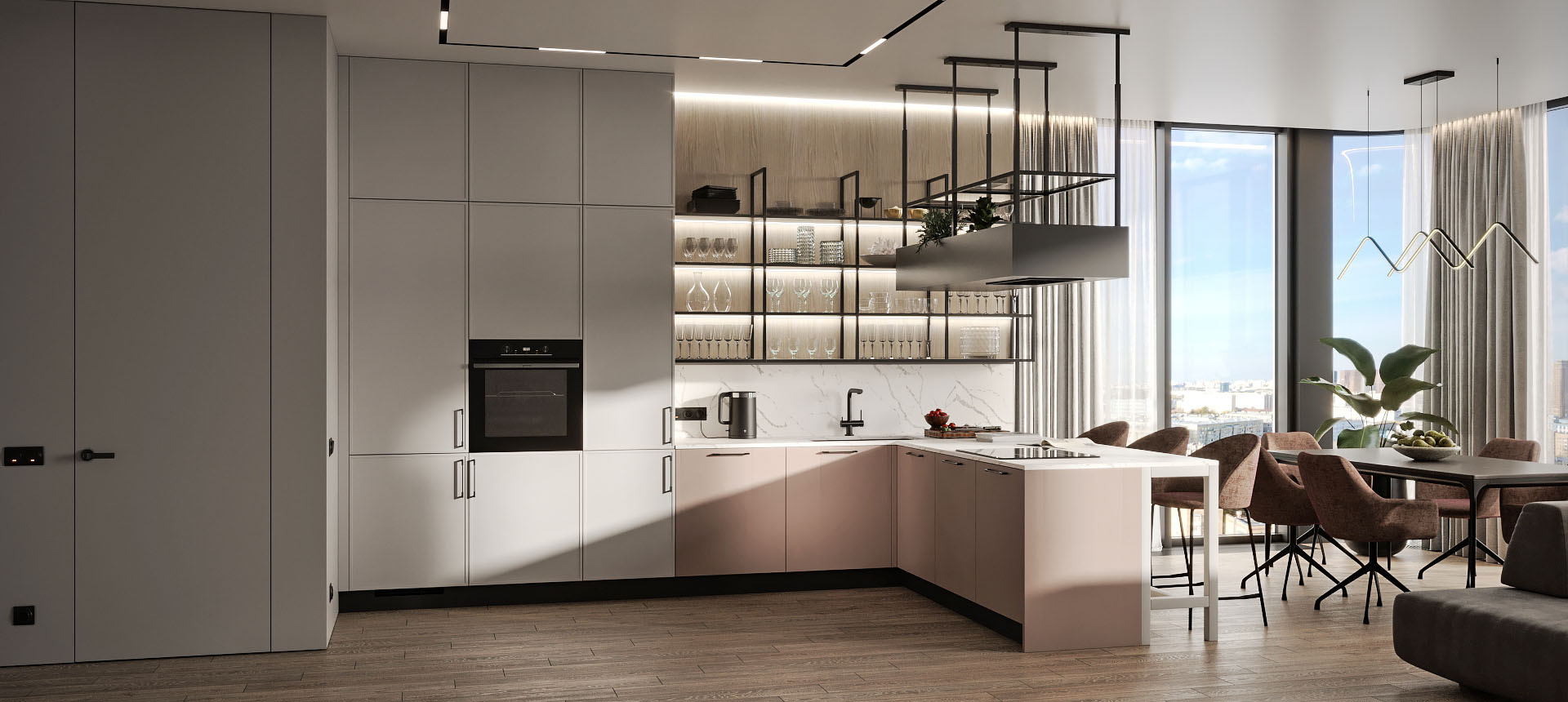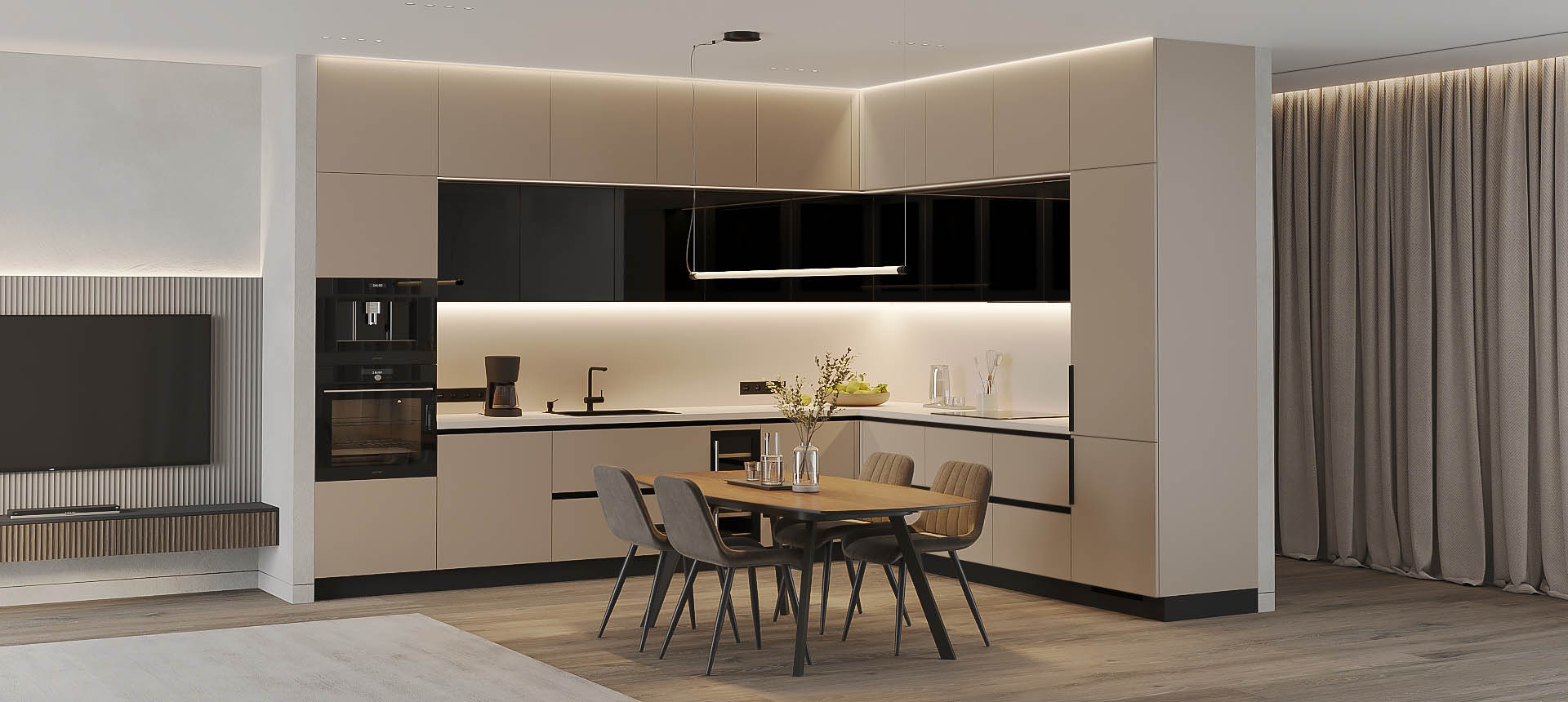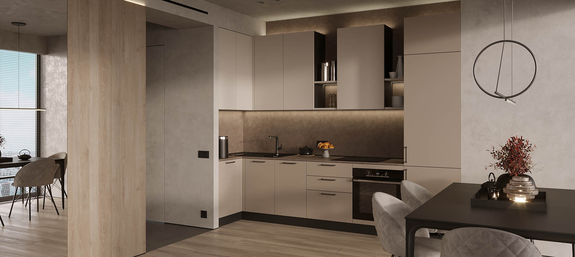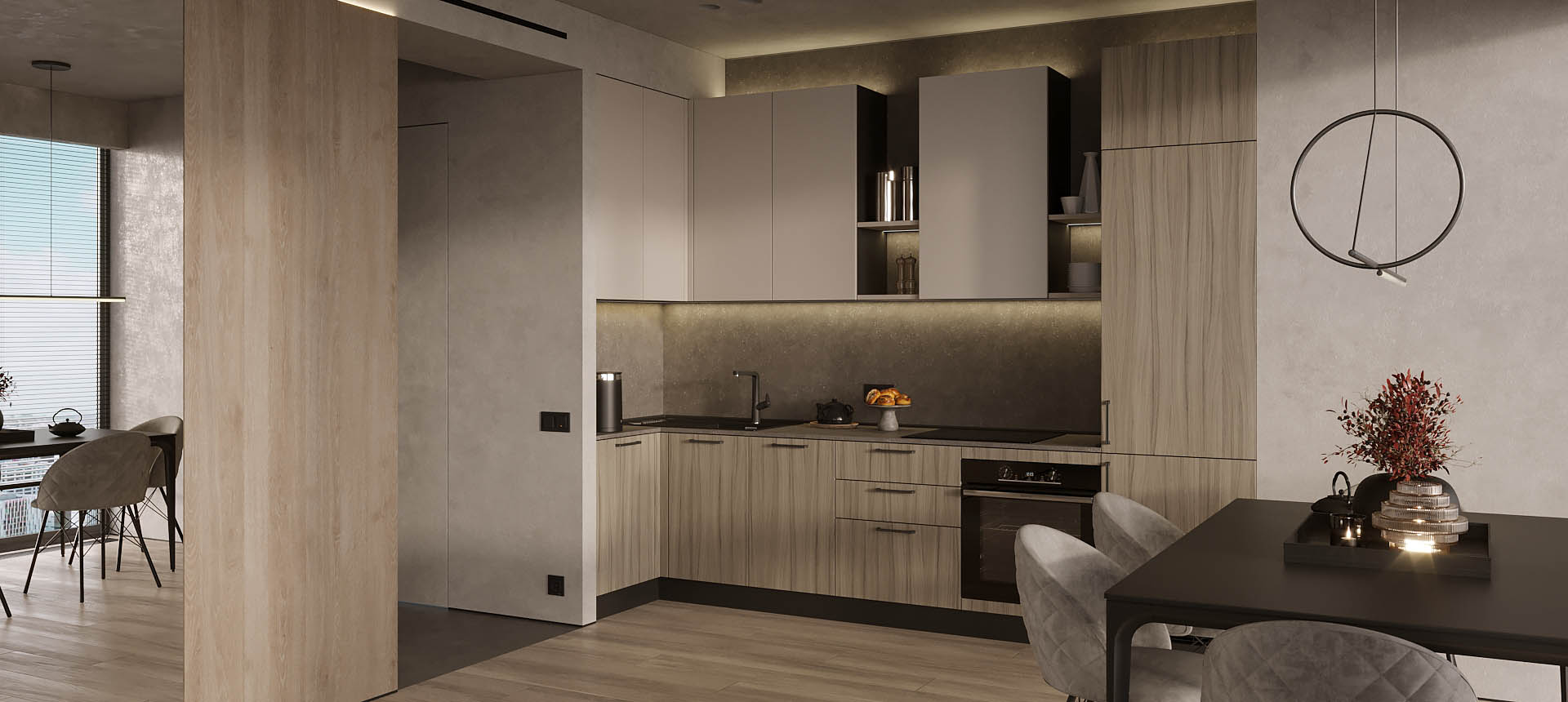 Красивая кухня с золотыми акцентами в двухкомнатной квартире бизнес-класса