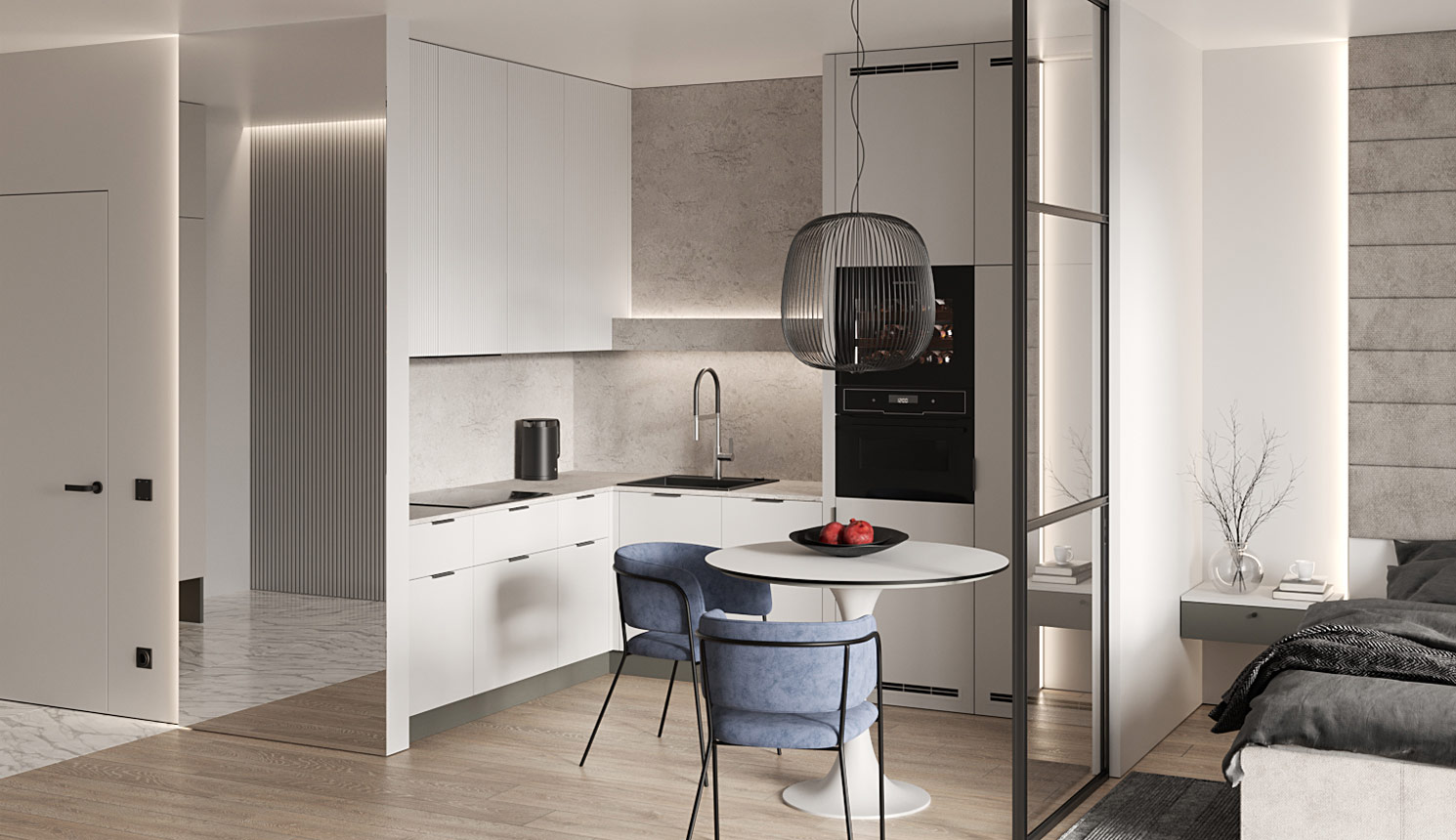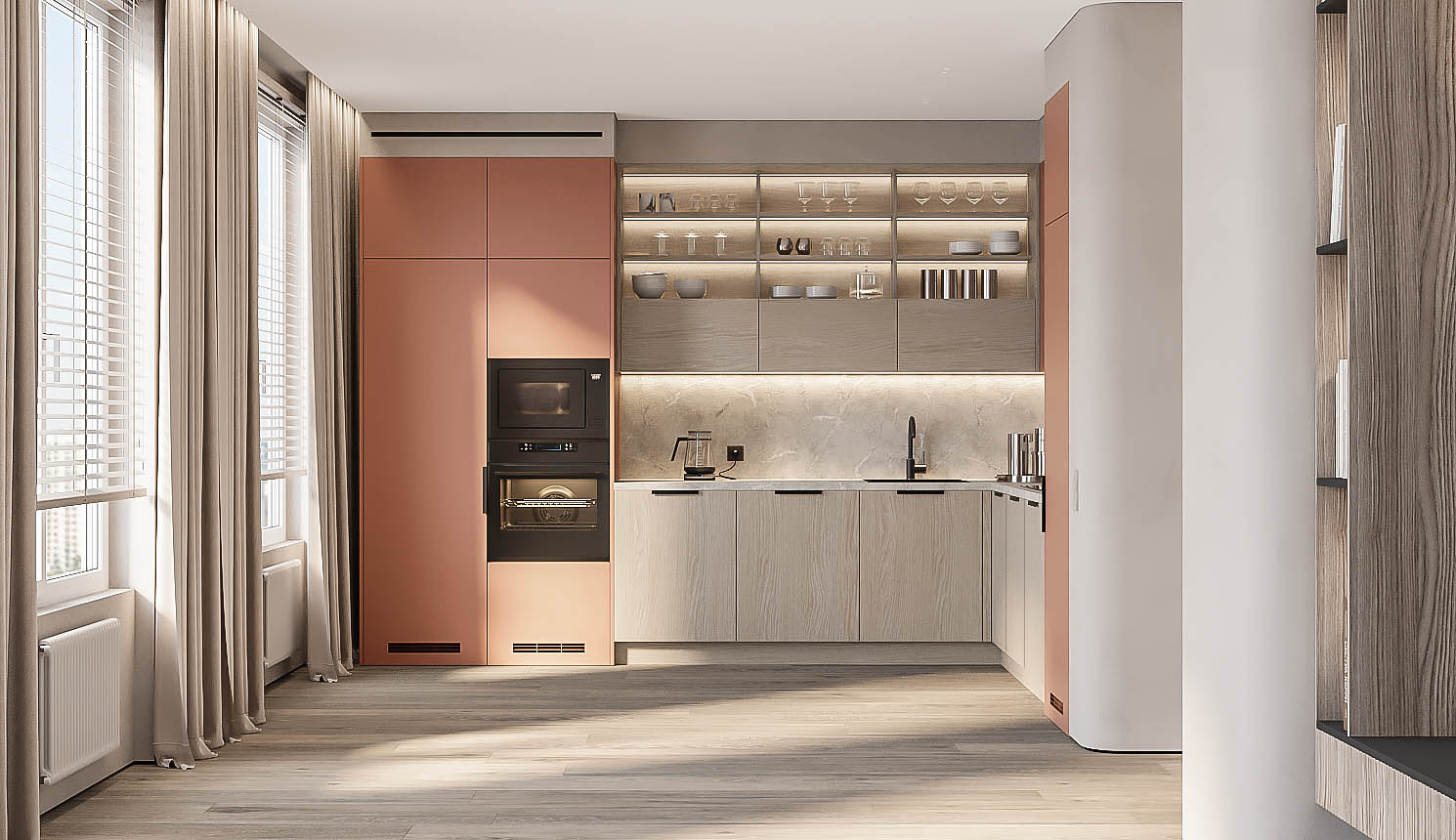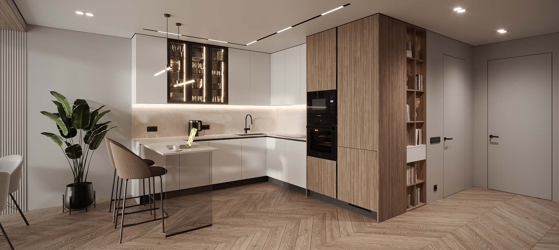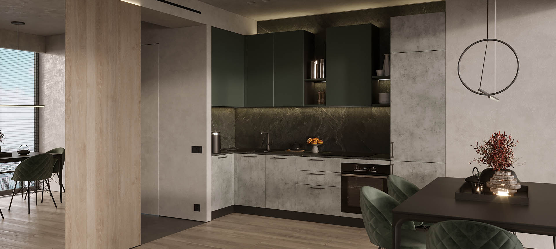 Красивая кухня с золотыми акцентами в двухкомнатной квартире бизнес-класса