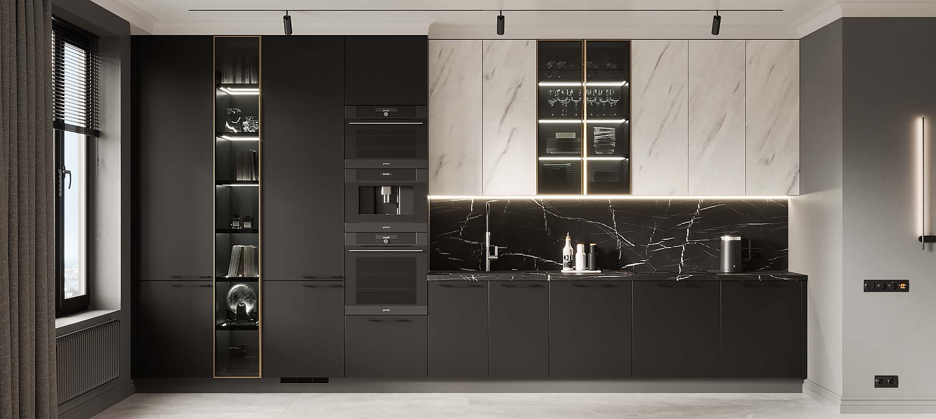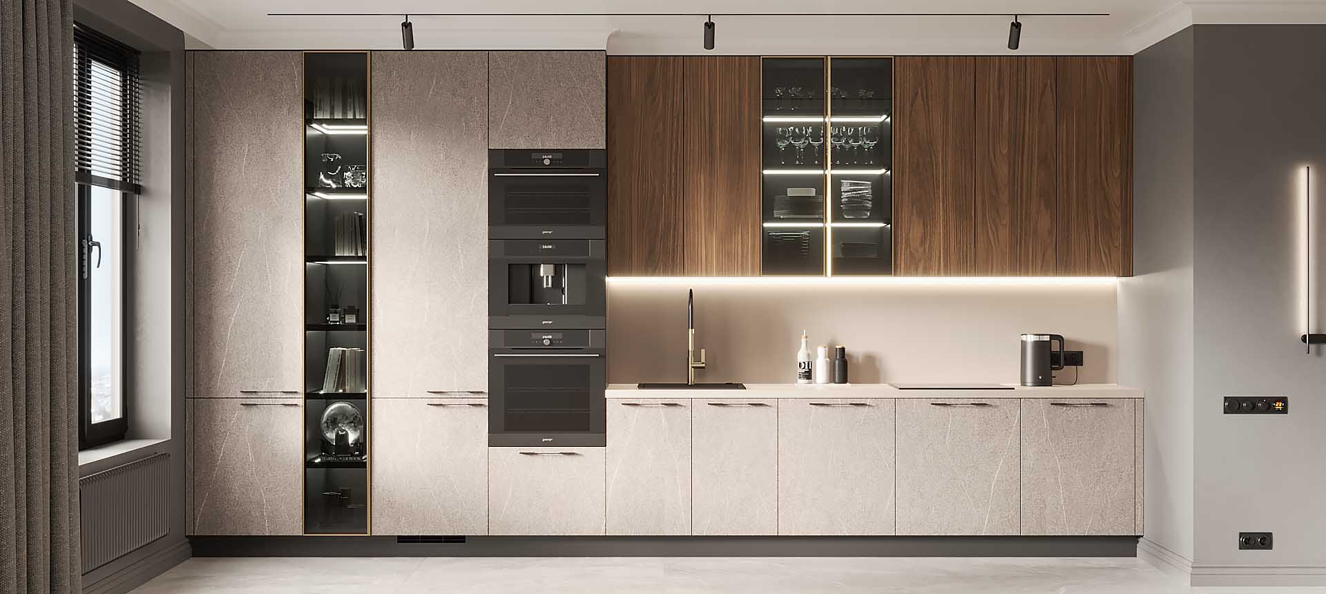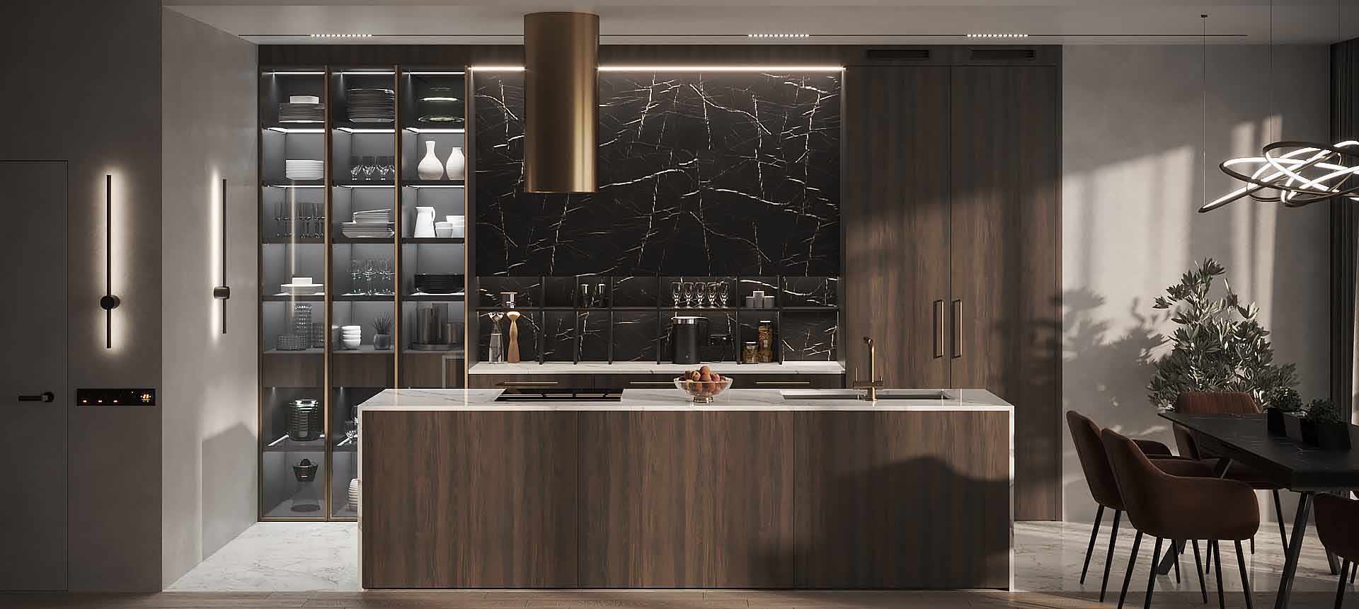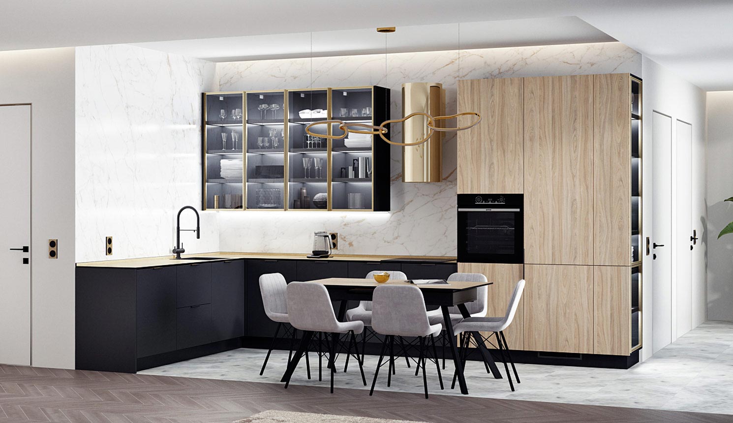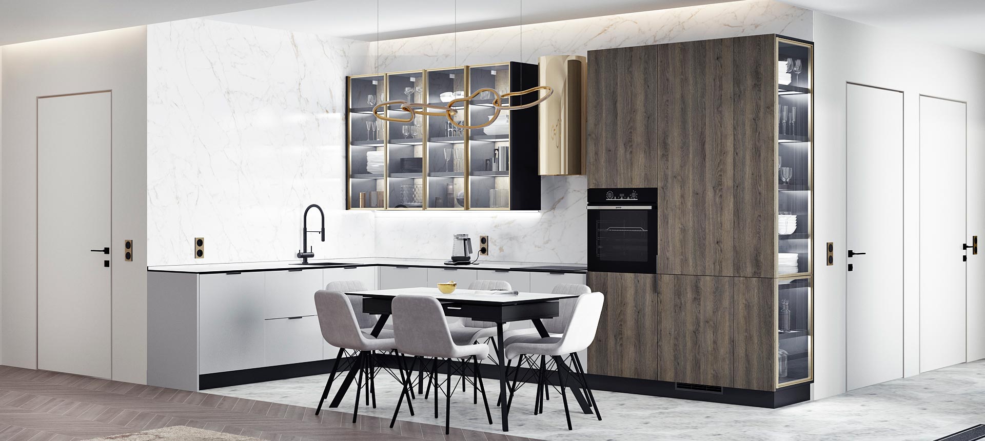 • Красивая кухня с золотыми акцентами в двухкомнатной квартире бизнес-класса