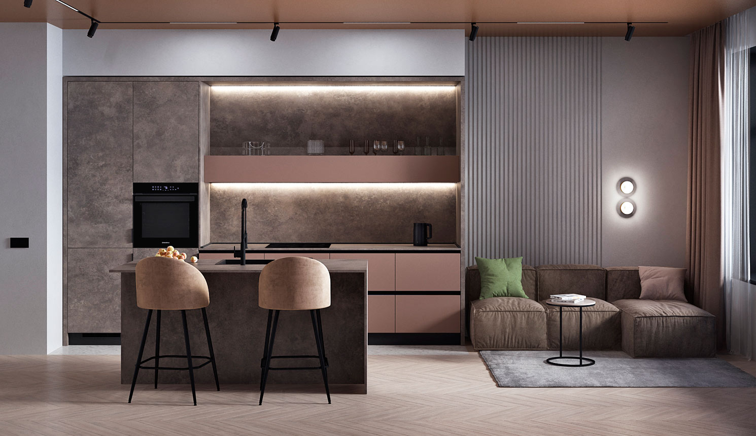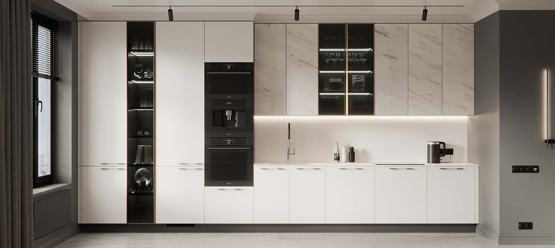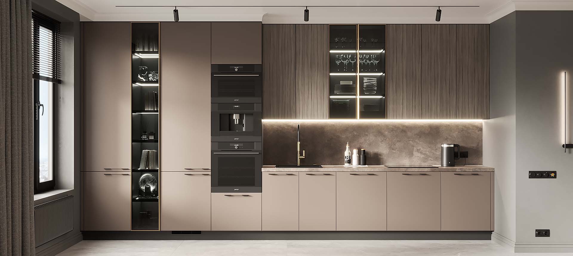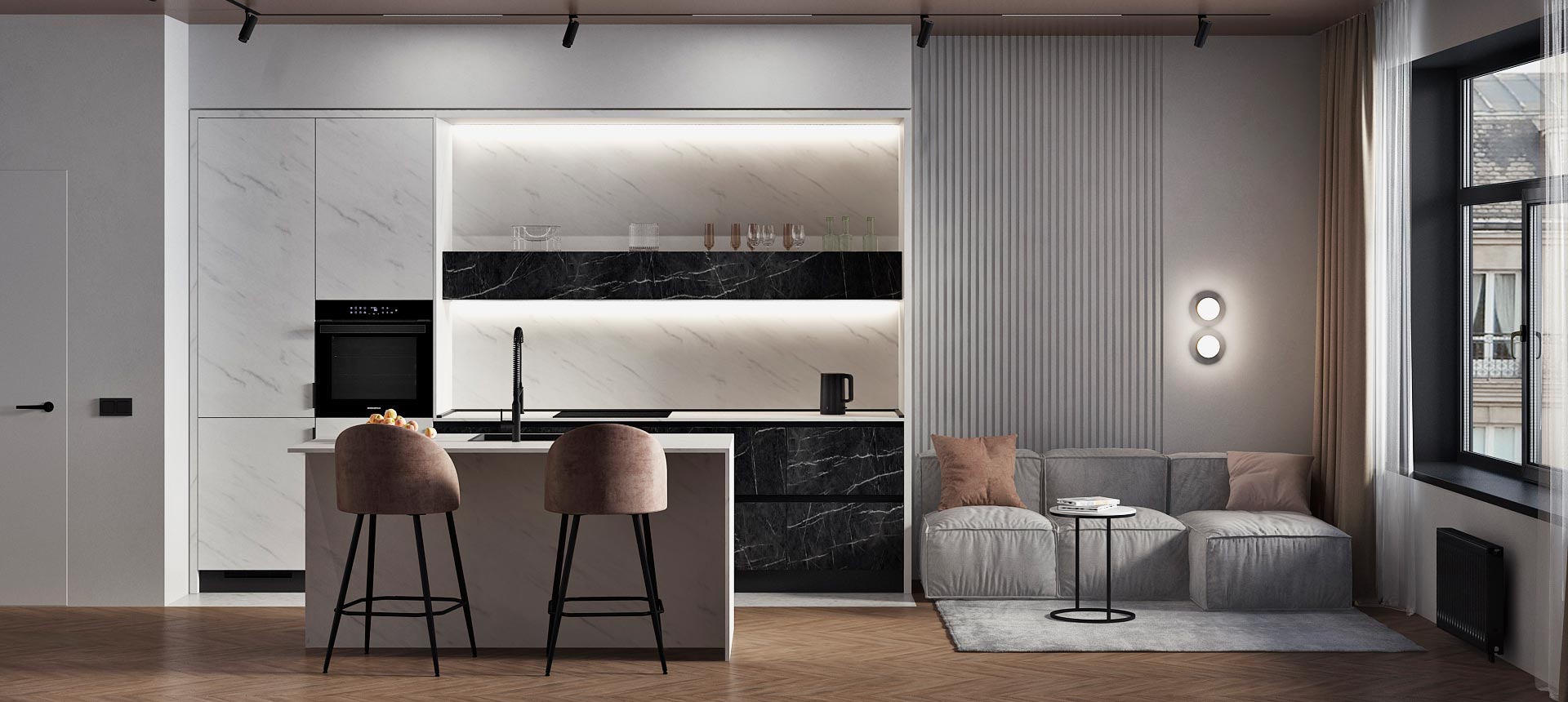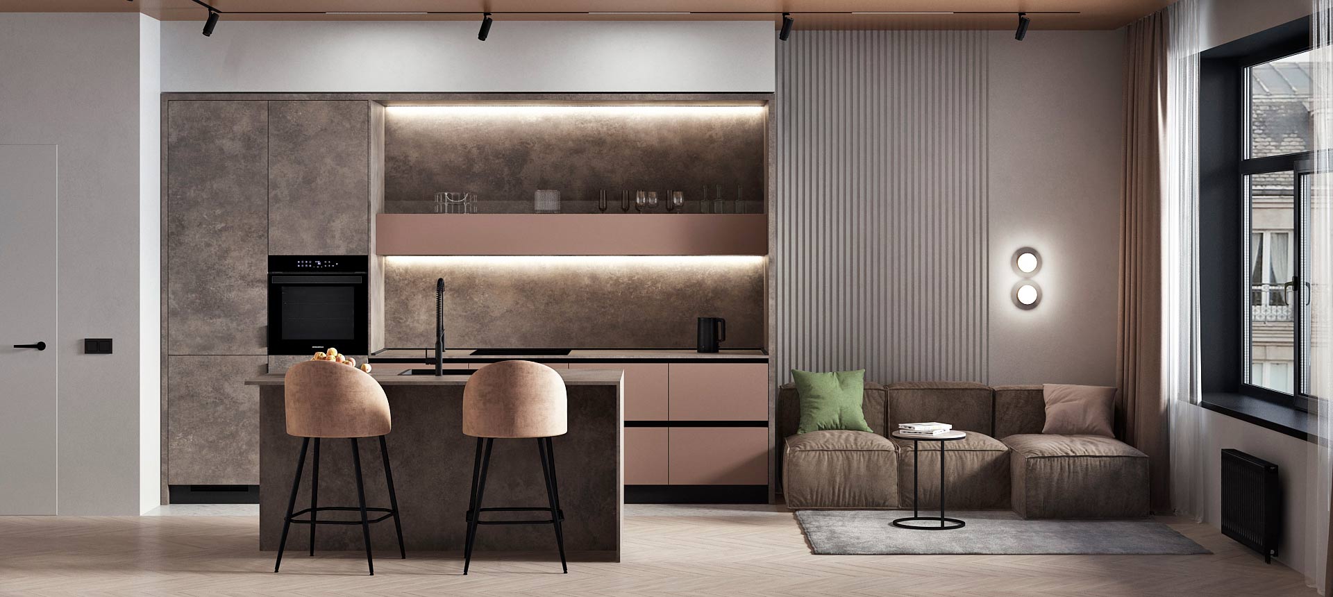 • Красивая кухня с золотыми акцентами в двухкомнатной квартире бизнес-класса