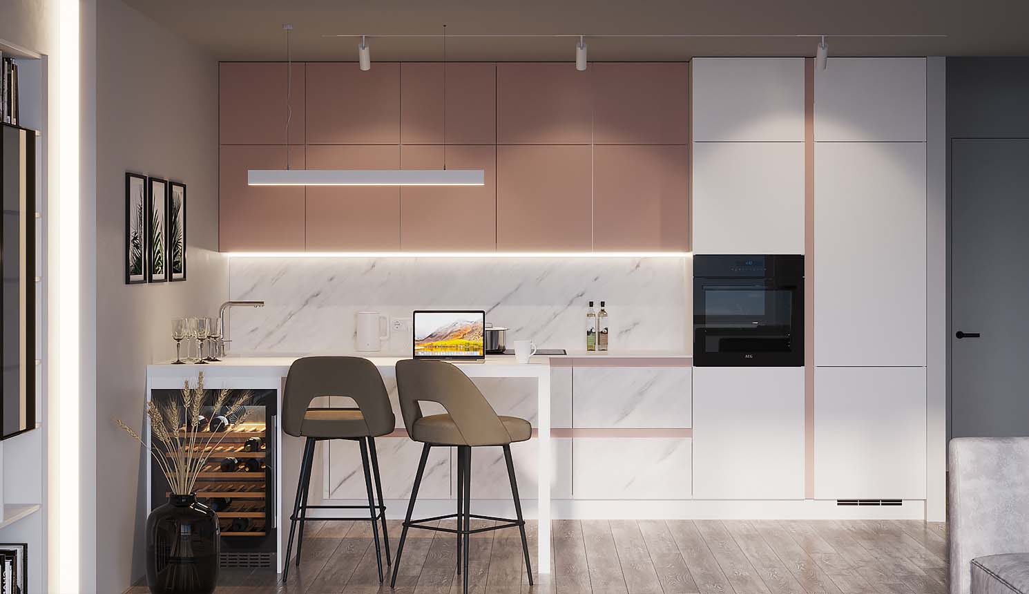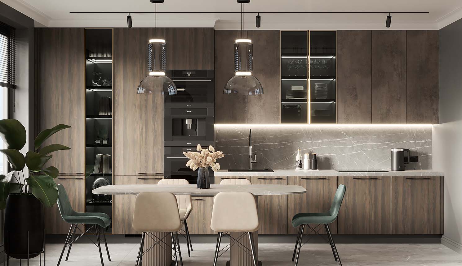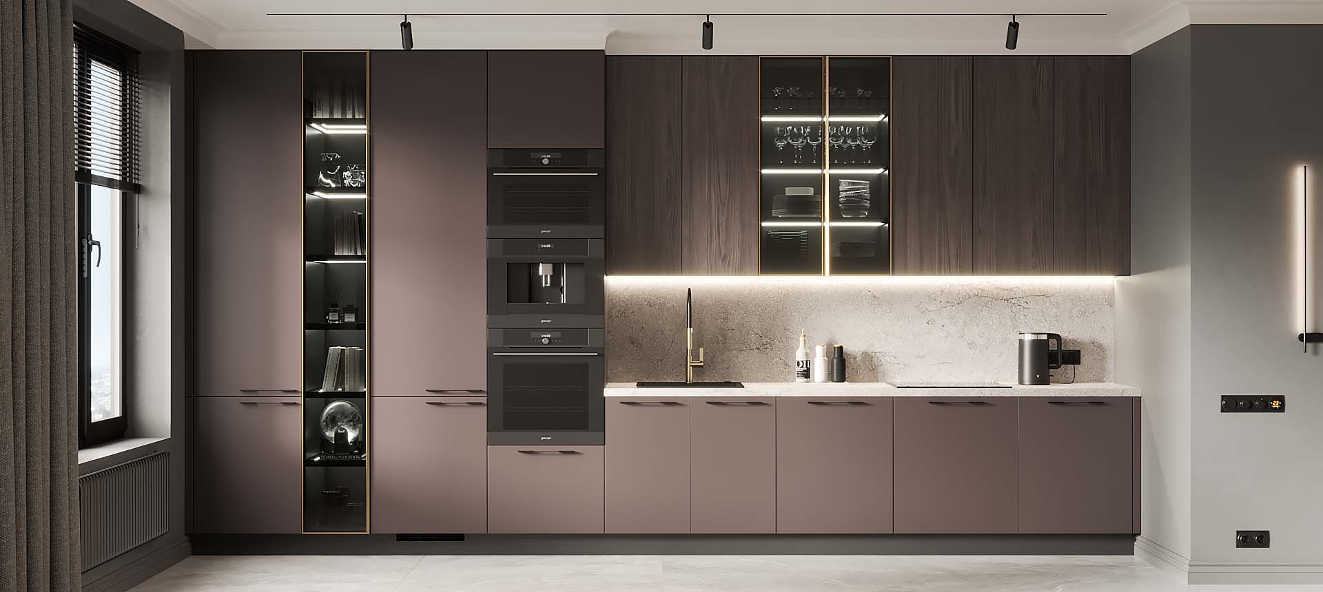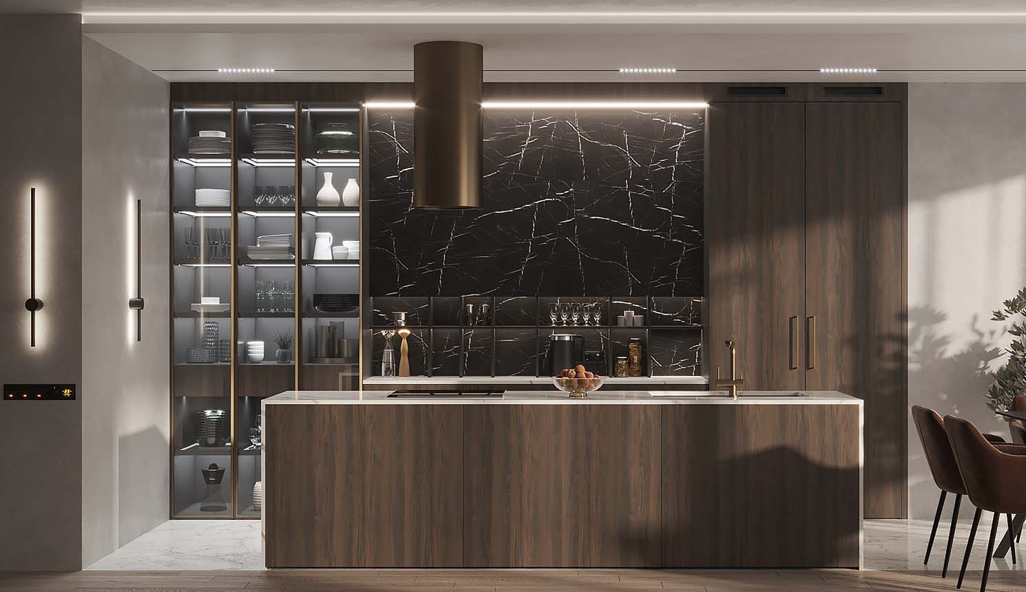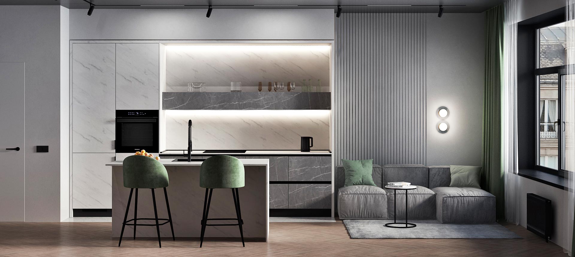 • Красивая кухня с золотыми акцентами в двухкомнатной квартире бизнес-класса
