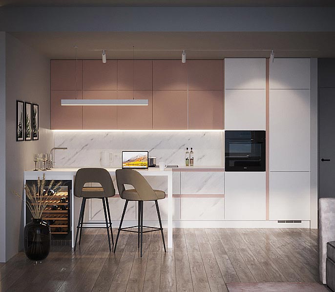 Красивая кухня с золотыми акцентами в двухкомнатной квартире бизнес-класса