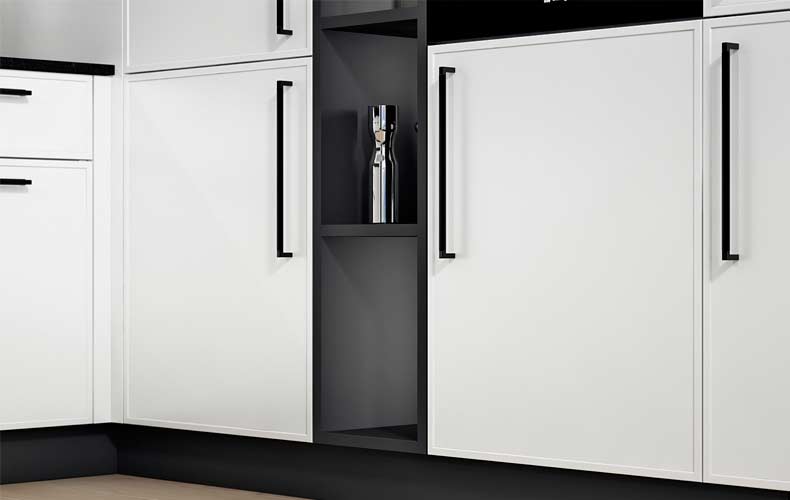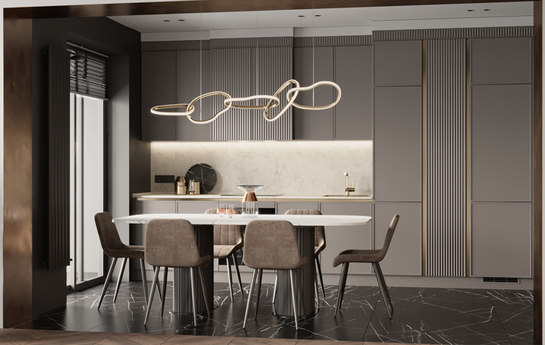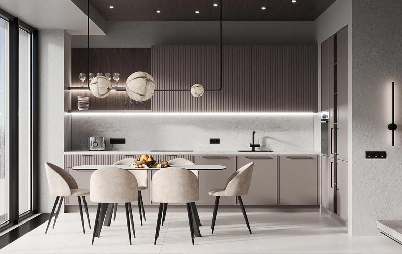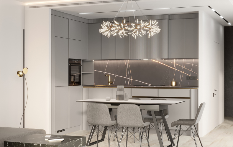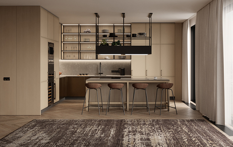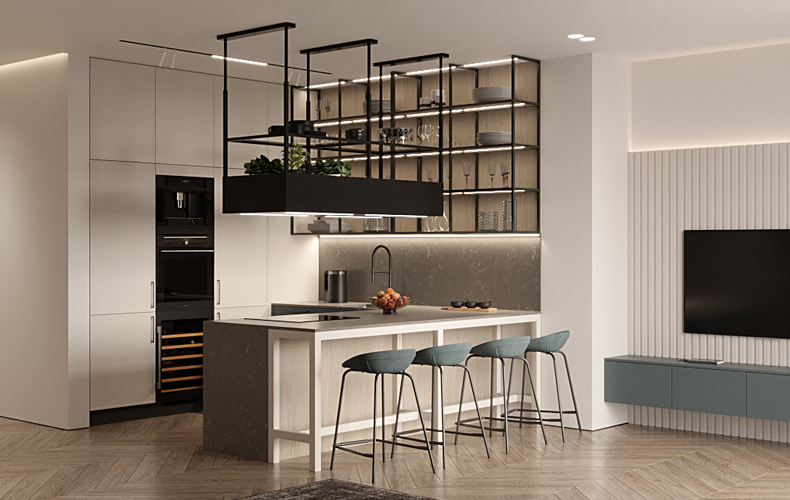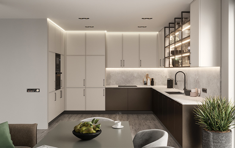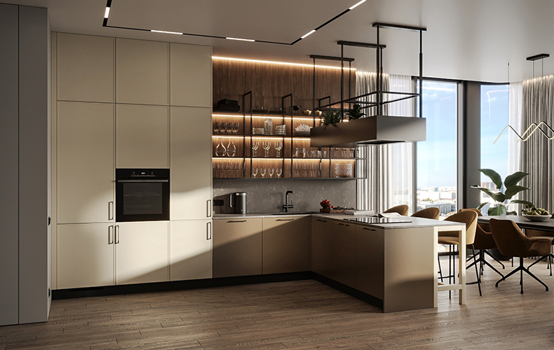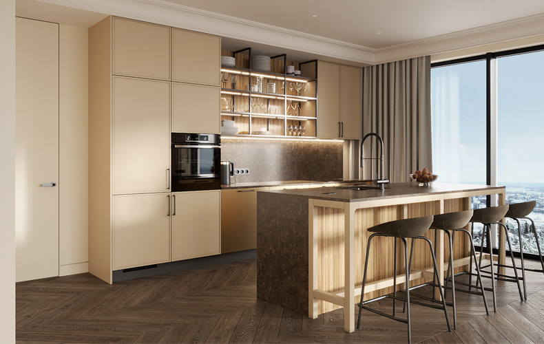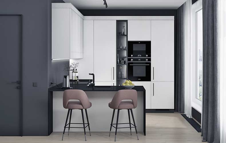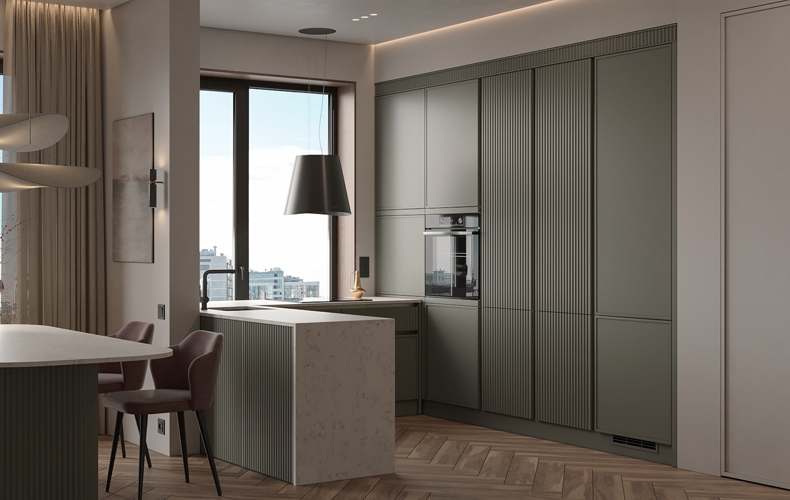 Кухонный гарнитур Ренцо 7 представлен прямой конфигурацией с полуостровом, куда внесена мойка со смесителем. В правой части установлены высокие мебельные колонки со встроенной бытовой техникой и полками для хранения. Слева располагается рабочая зона с секциями навесных и напольных шкафов. У кухни используется два вида фасадов: гладкие «Ренцо» и ребристые «Линеа».