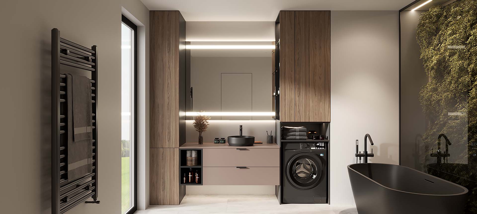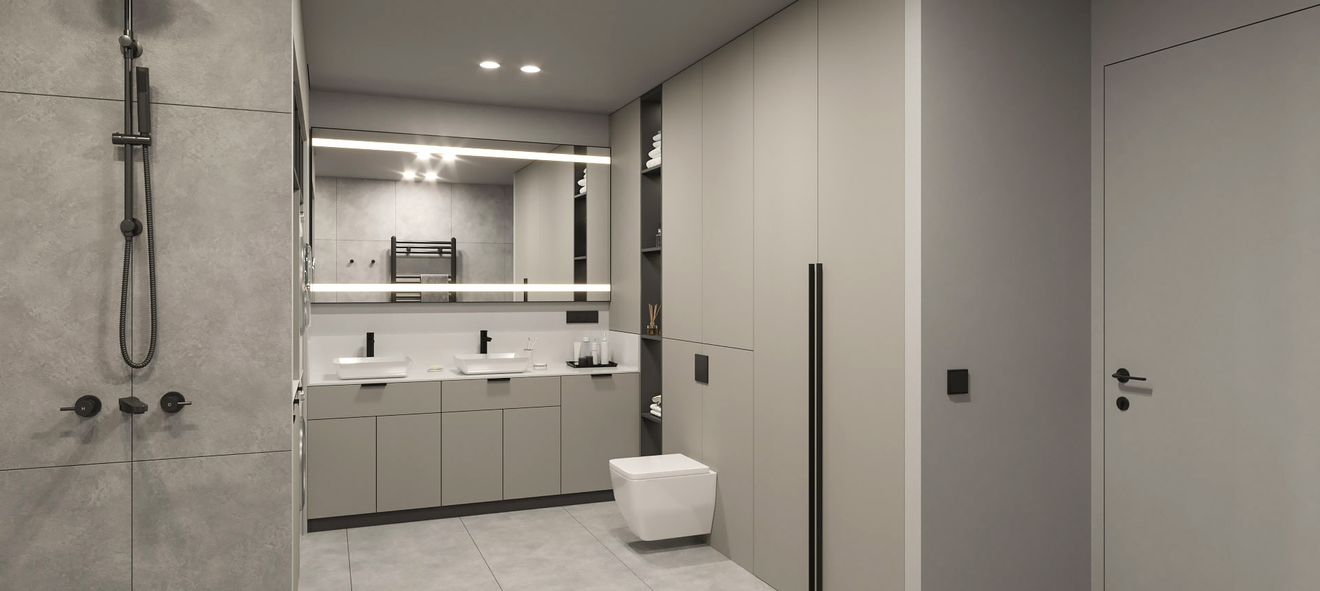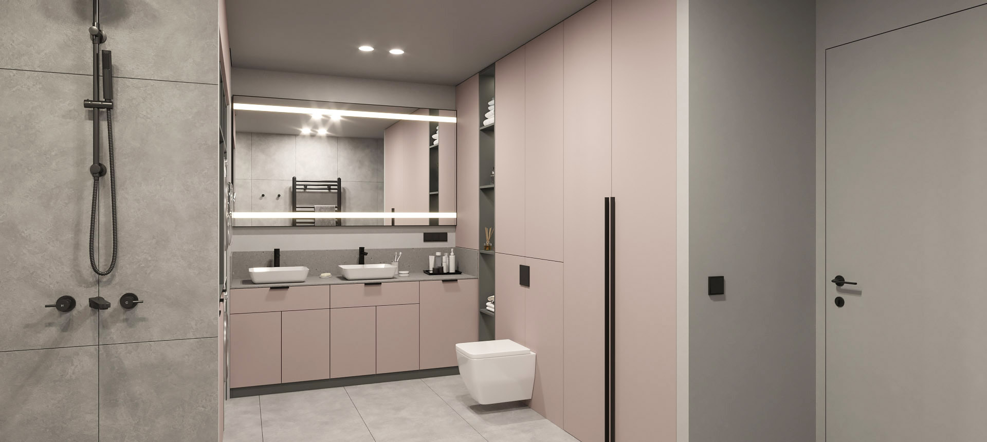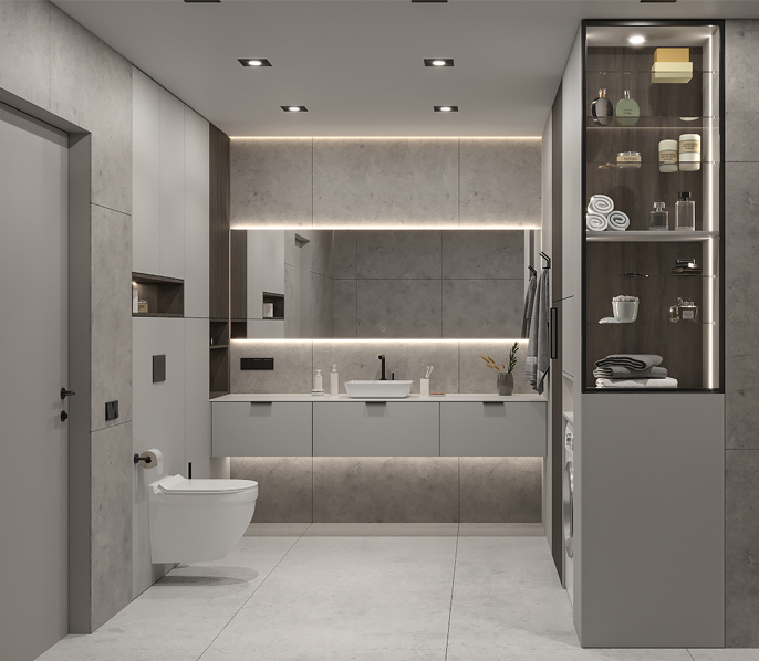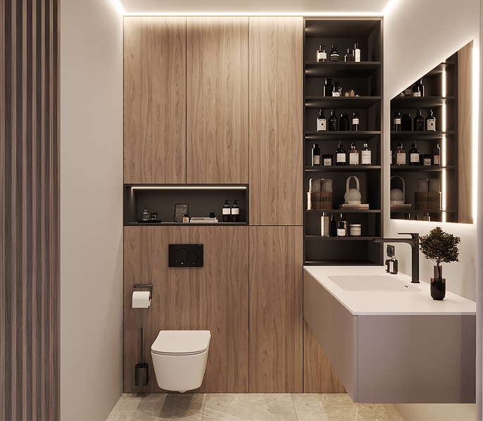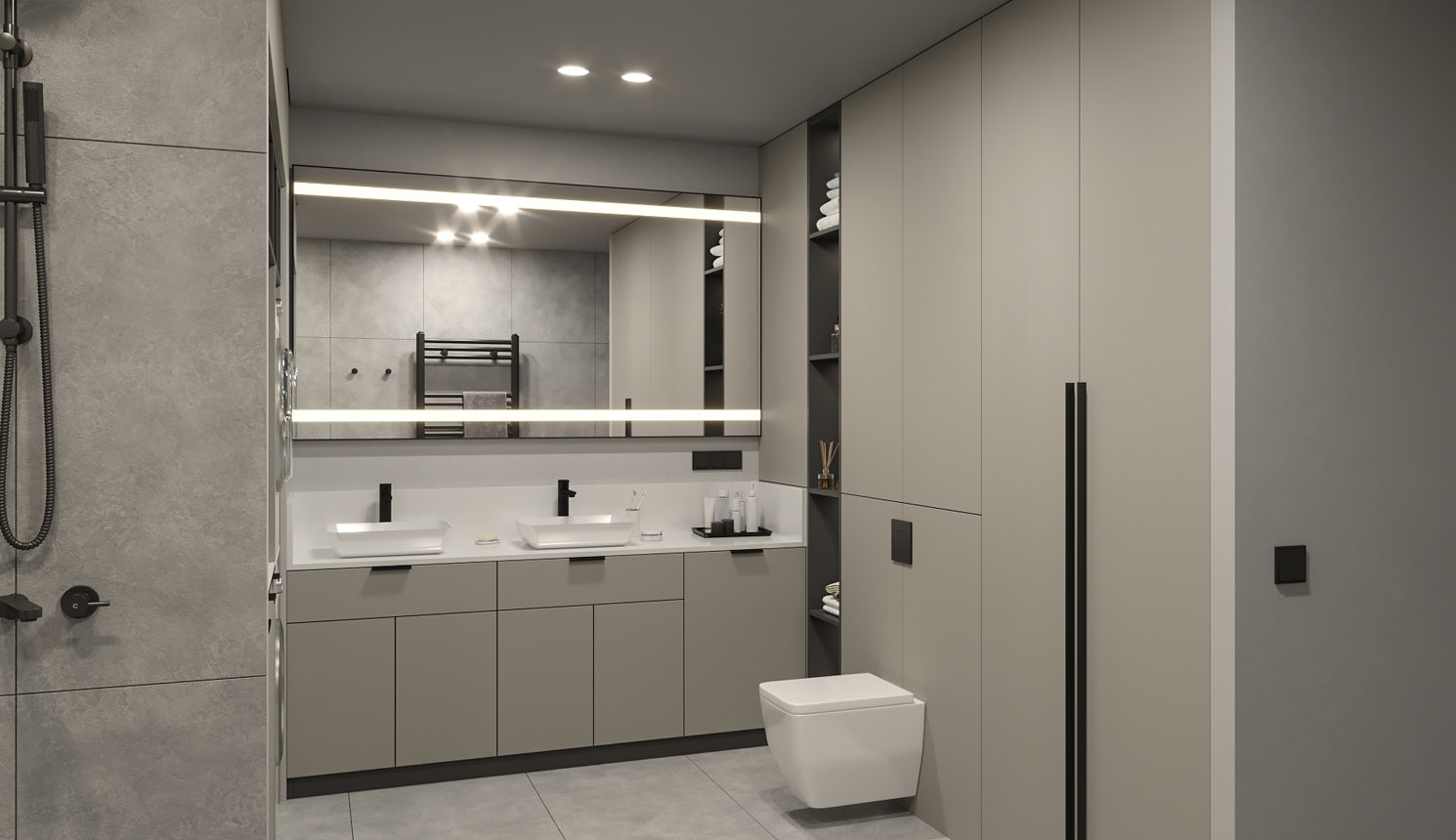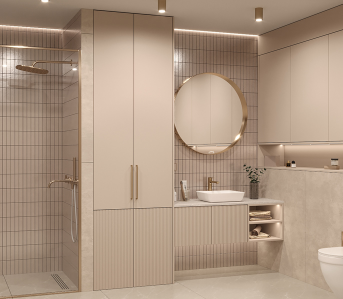 «У меня все проекты с компанией («Стильные Кухни и Интерьеры) были хорошие, но мебелью в ванную комнату я довольна больше всего на свете. Мне сделали тумбу под раковину, две навесные колонки по бокам, зеркало с подсветкой, а также встроенный шкаф напротив. Из-за высоты потолков и размеров шкафов было непросто спроектировать все так, как надо: были опасения, что дверцы ослабнут, что тяжелые дверцы нельзя будет открывать одним легким нажатием. Но в итоге в фасады добавили направляющие, которые их усиливают. И еще удалось сделать эти высокие двери с механизмом push-to-open. У меня не очень большая площадь ванной, поэтому хотелось обойтись без лишних деталей, в том числе и выступающих ручек, которые я бы постоянно задевала»,