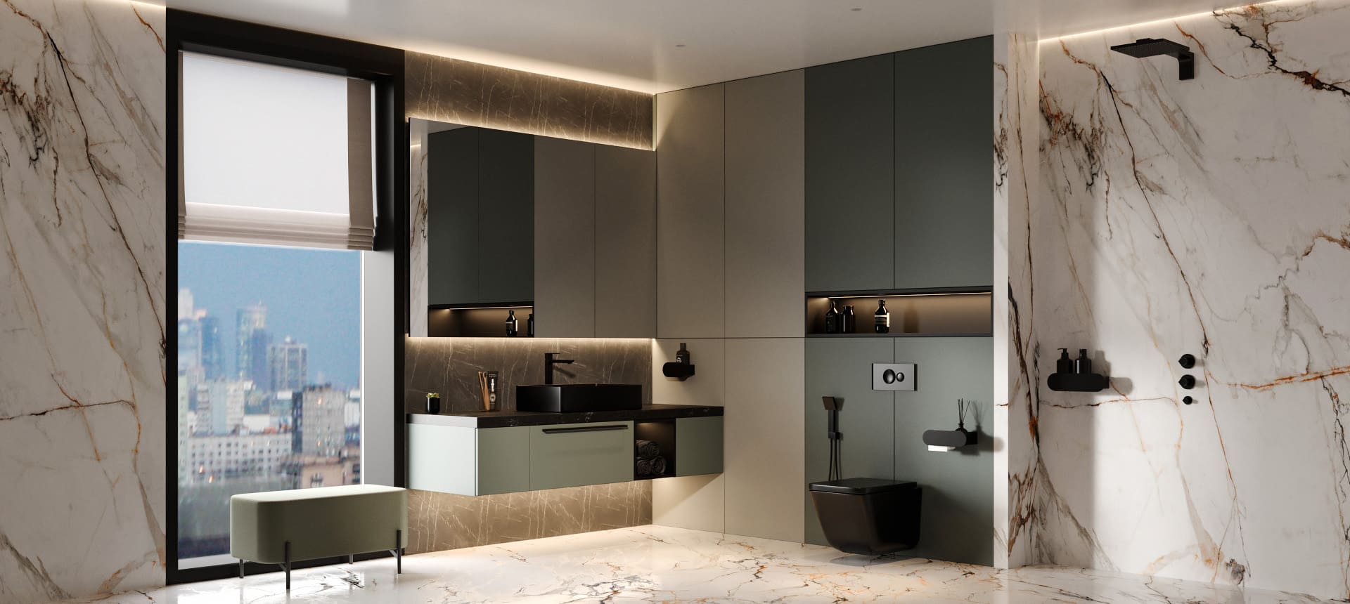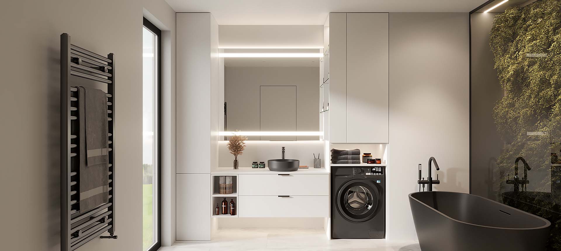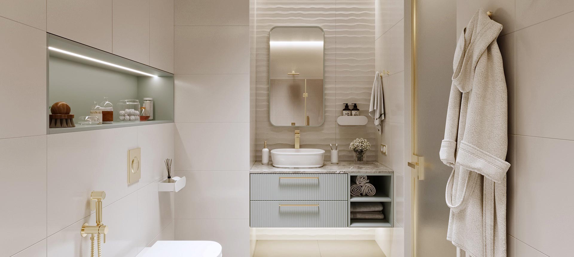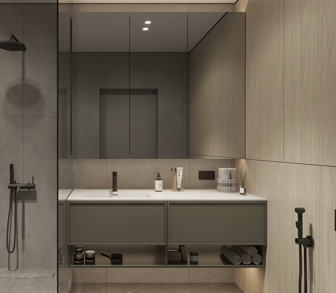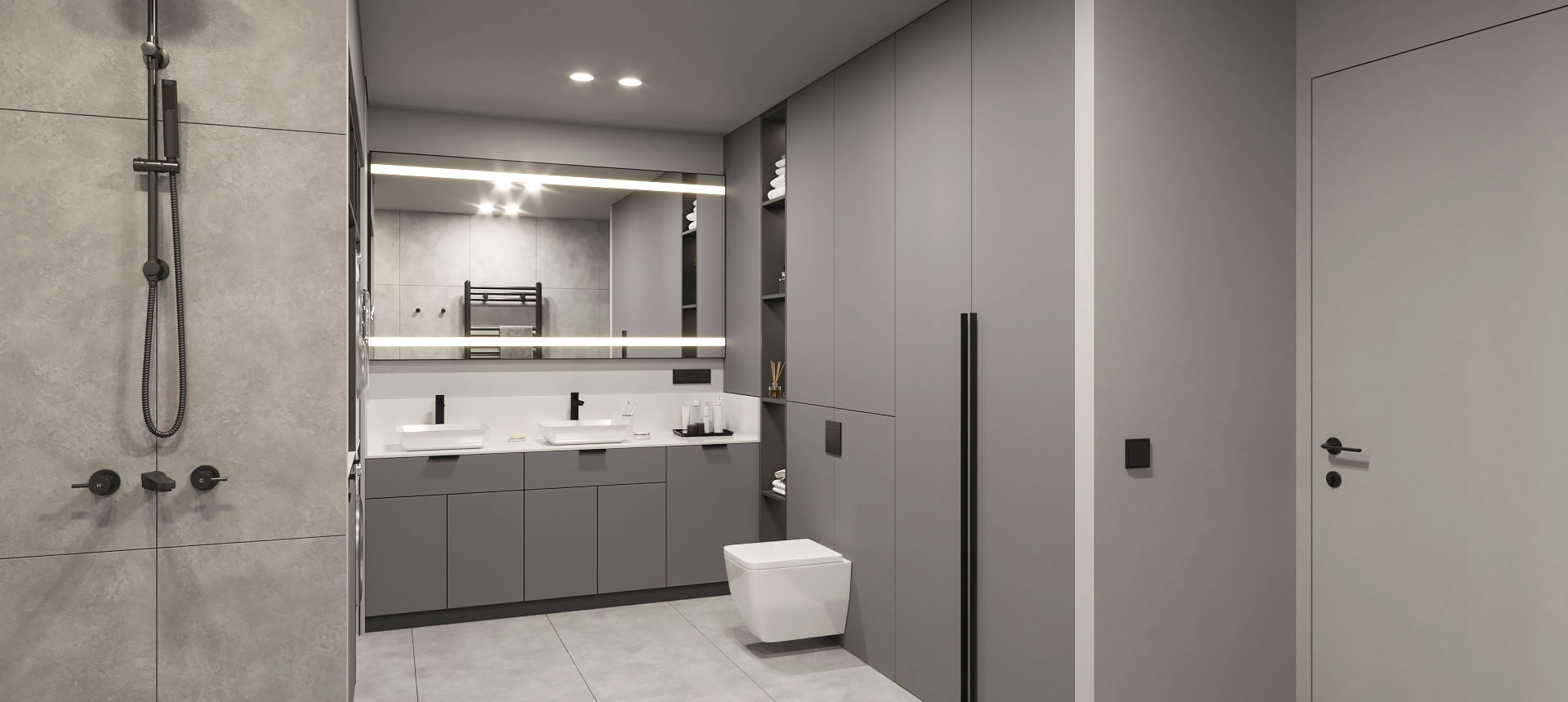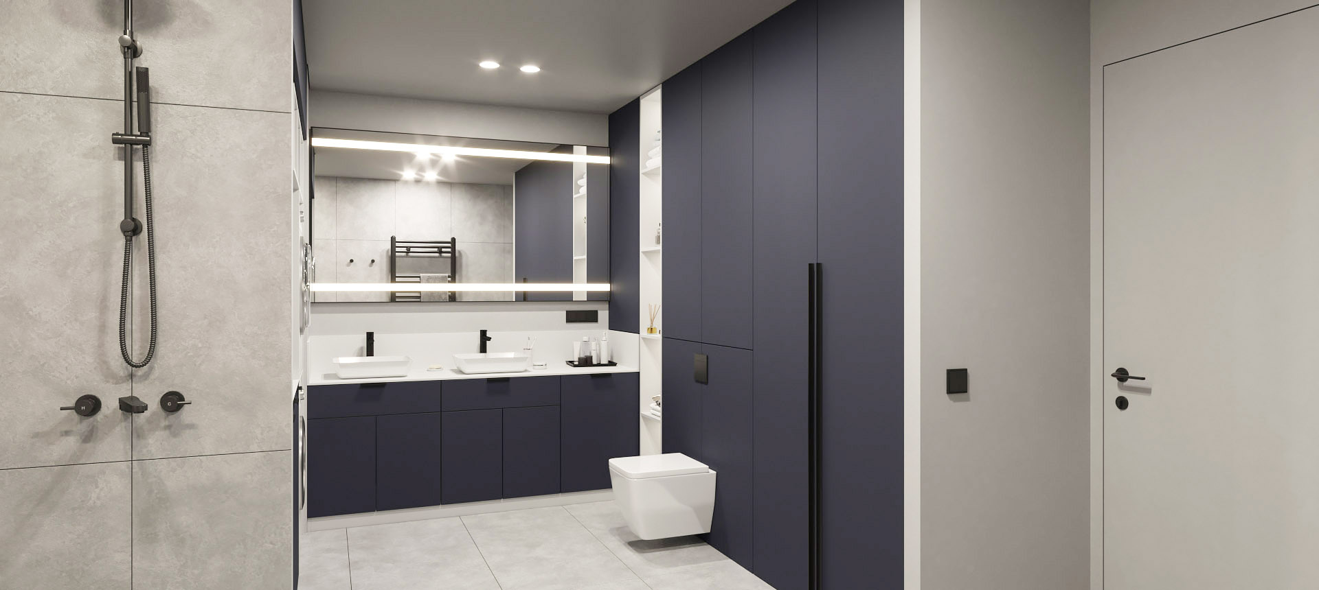 «У меня все проекты с компанией («Стильные Кухни и Интерьеры) были хорошие, но мебелью в ванную комнату я довольна больше всего на свете. Мне сделали тумбу под раковину, две навесные колонки по бокам, зеркало с подсветкой, а также встроенный шкаф напротив. Из-за высоты потолков и размеров шкафов было непросто спроектировать все так, как надо: были опасения, что дверцы ослабнут, что тяжелые дверцы нельзя будет открывать одним легким нажатием. Но в итоге в фасады добавили направляющие, которые их усиливают. И еще удалось сделать эти высокие двери с механизмом push-to-open. У меня не очень большая площадь ванной, поэтому хотелось обойтись без лишних деталей, в том числе и выступающих ручек, которые я бы постоянно задевала»,