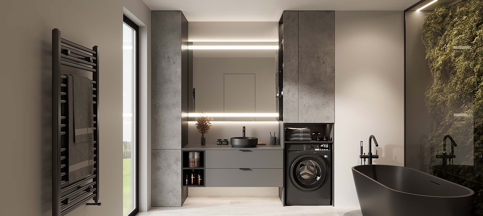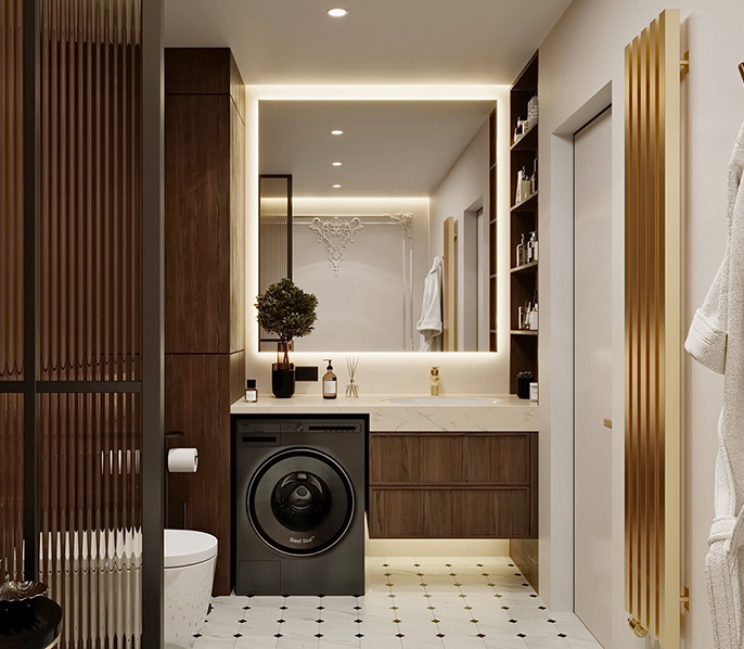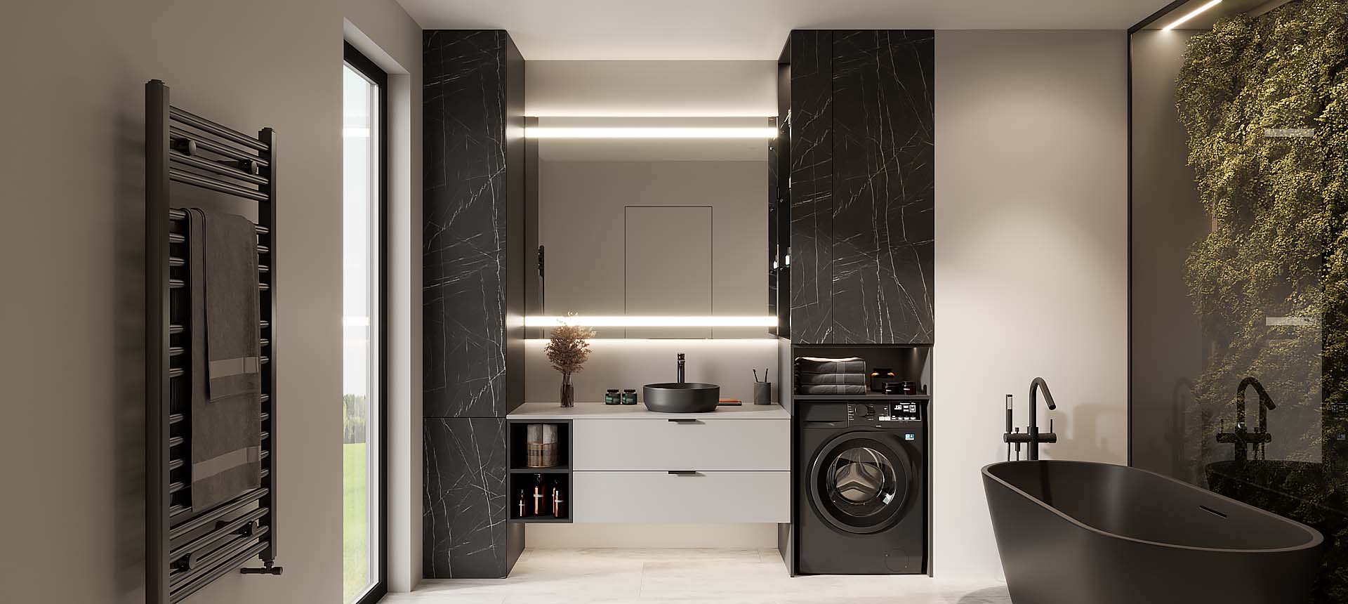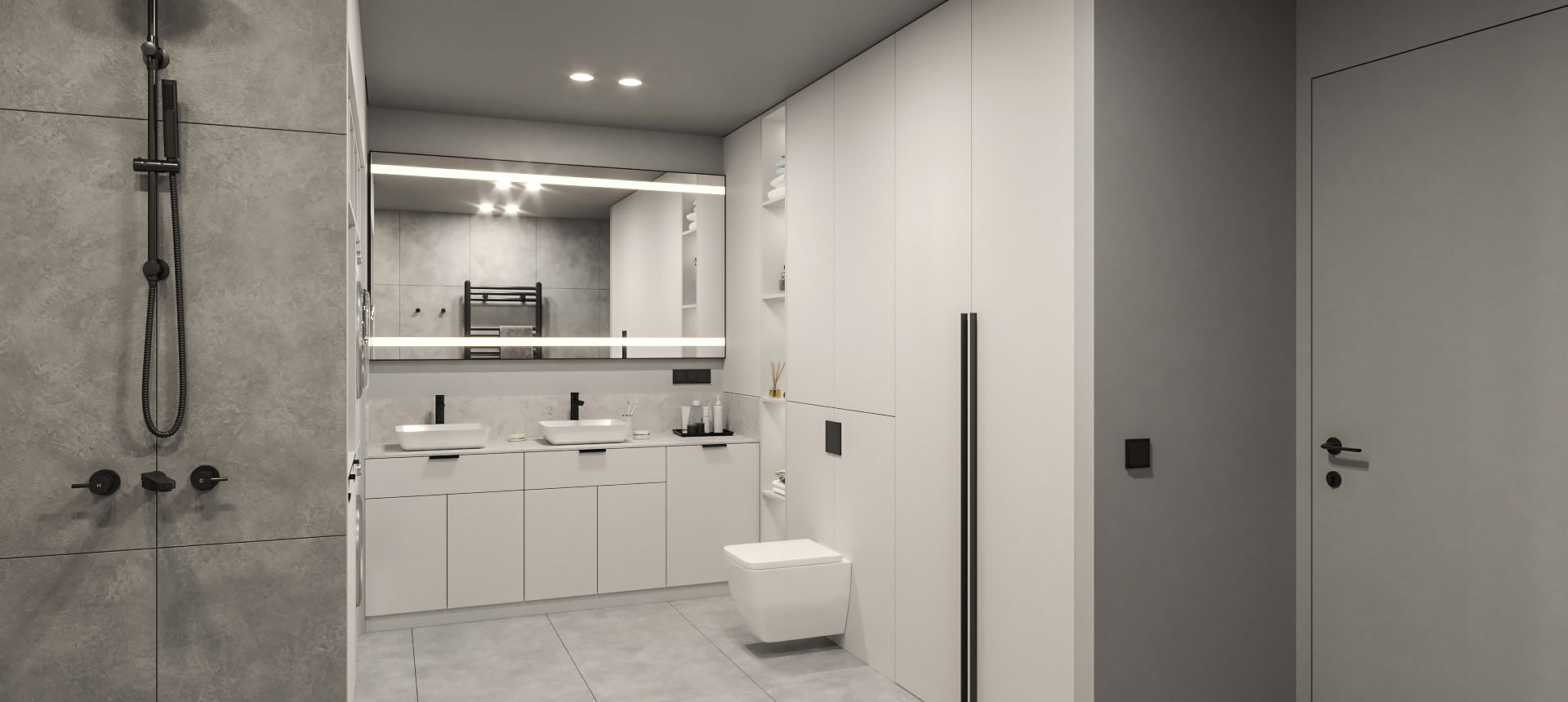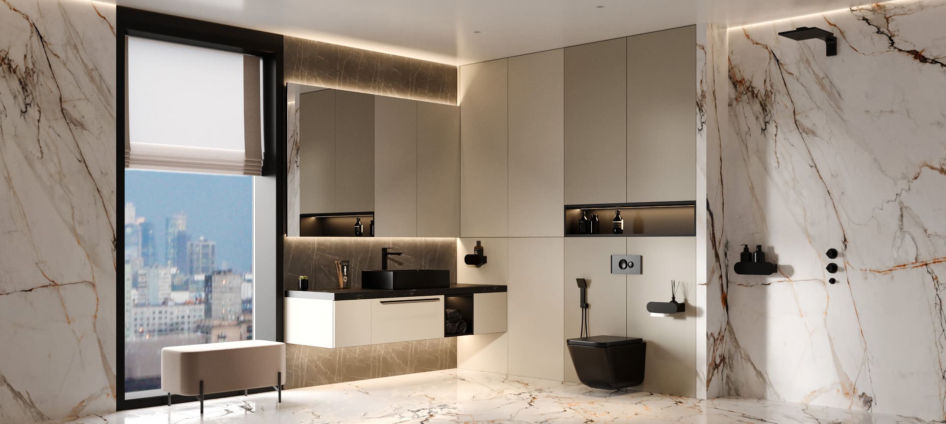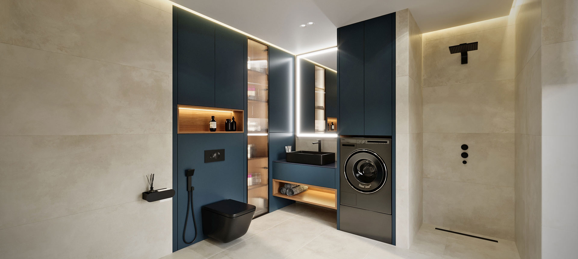«У меня все проекты с компанией («Стильные Кухни и Интерьеры) были хорошие, но мебелью в ванную комнату я довольна больше всего на свете. Мне сделали тумбу под раковину, две навесные колонки по бокам, зеркало с подсветкой, а также встроенный шкаф напротив. Из-за высоты потолков и размеров шкафов было непросто спроектировать все так, как надо: были опасения, что дверцы ослабнут, что тяжелые дверцы нельзя будет открывать одним легким нажатием. Но в итоге в фасады добавили направляющие, которые их усиливают. И еще удалось сделать эти высокие двери с механизмом push-to-open. У меня не очень большая площадь ванной, поэтому хотелось обойтись без лишних деталей, в том числе и выступающих ручек, которые я бы постоянно задевала»,