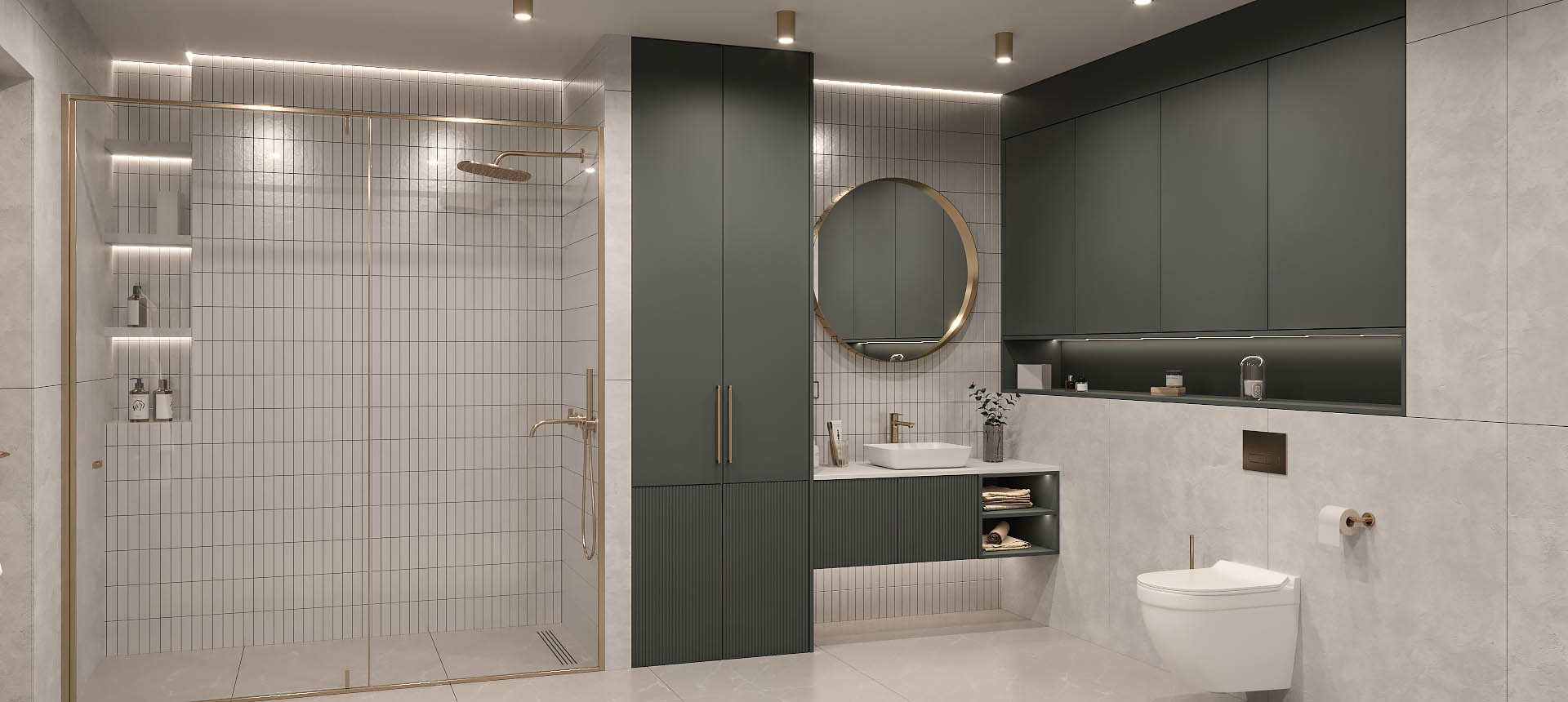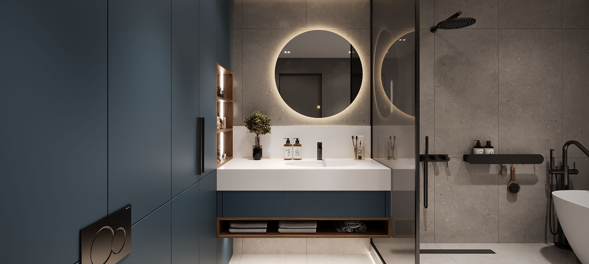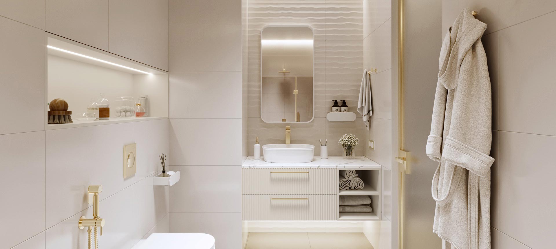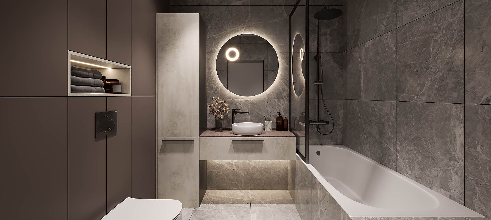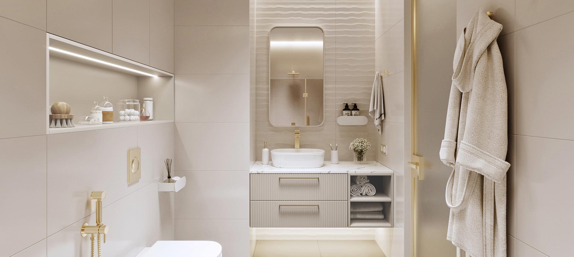 «У меня все проекты с компанией («Стильные Кухни и Интерьеры) были хорошие, но мебелью в ванную комнату я довольна больше всего на свете. Мне сделали тумбу под раковину, две навесные колонки по бокам, зеркало с подсветкой, а также встроенный шкаф напротив. Из-за высоты потолков и размеров шкафов было непросто спроектировать все так, как надо: были опасения, что дверцы ослабнут, что тяжелые дверцы нельзя будет открывать одним легким нажатием. Но в итоге в фасады добавили направляющие, которые их усиливают. И еще удалось сделать эти высокие двери с механизмом push-to-open. У меня не очень большая площадь ванной, поэтому хотелось обойтись без лишних деталей, в том числе и выступающих ручек, которые я бы постоянно задевала»,
