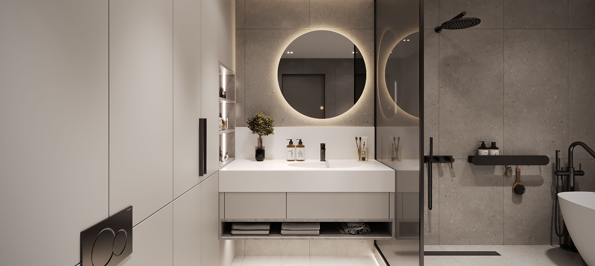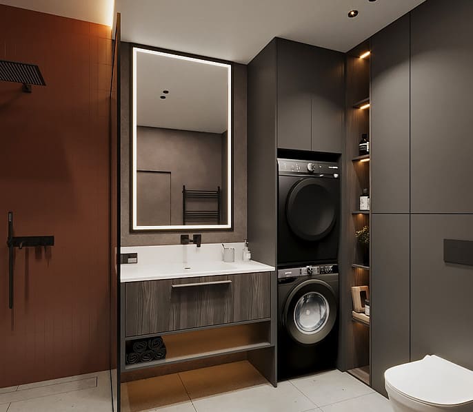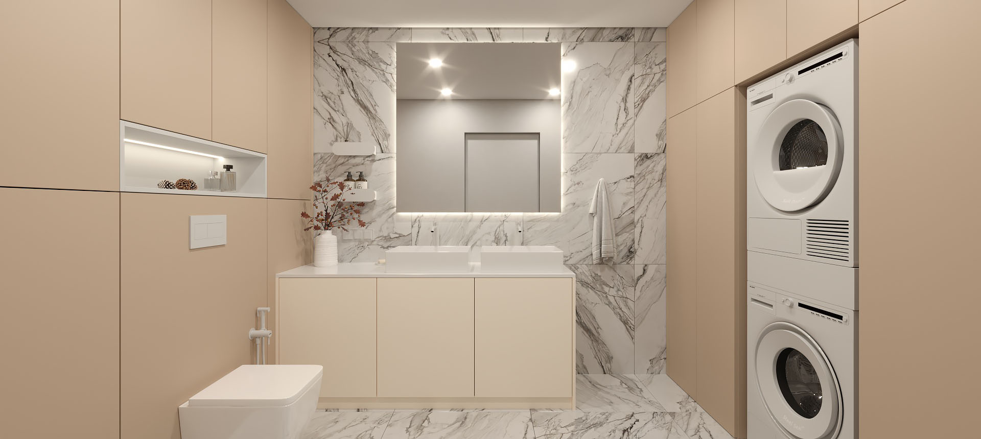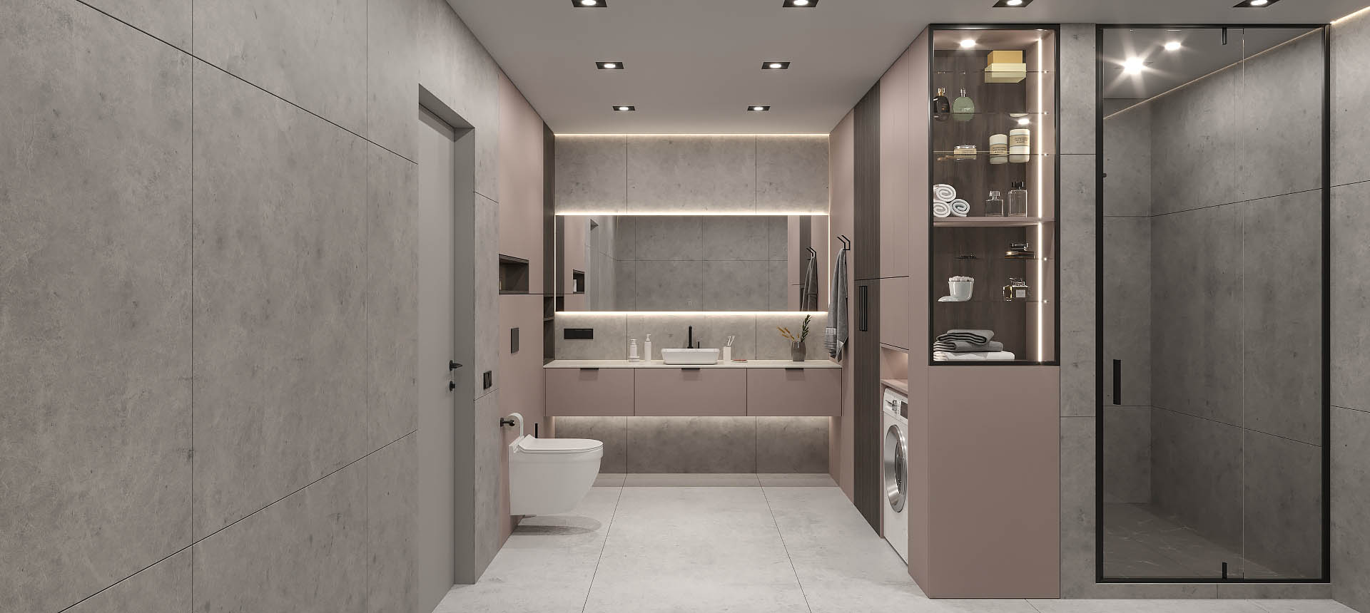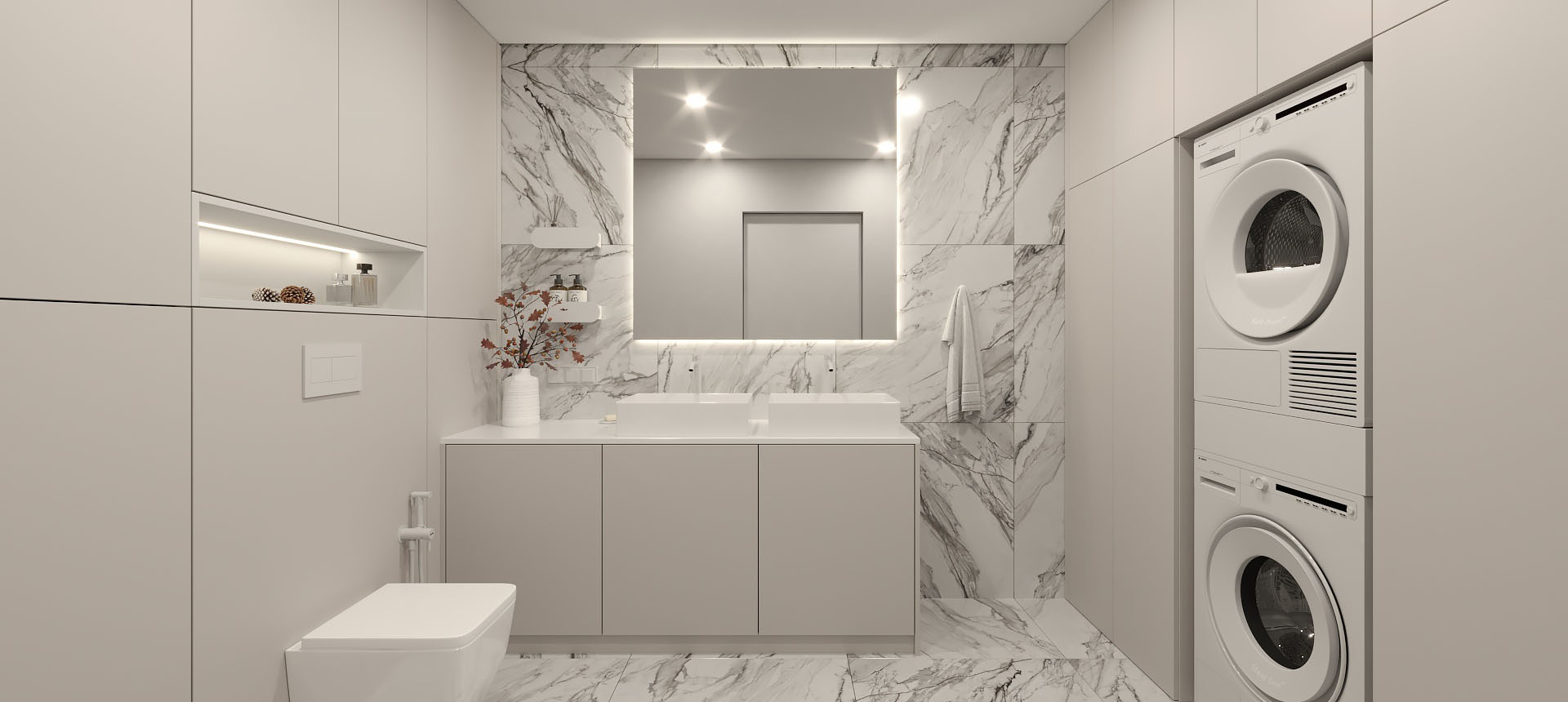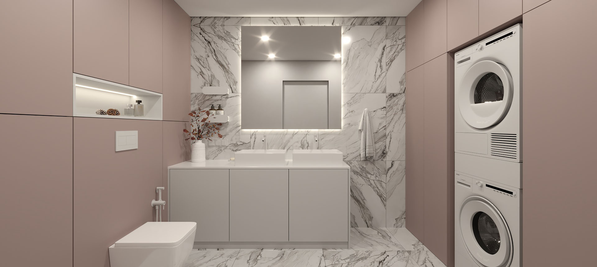 «У меня все проекты с компанией («Стильные Кухни и Интерьеры) были хорошие, но мебелью в ванную комнату я довольна больше всего на свете. Мне сделали тумбу под раковину, две навесные колонки по бокам, зеркало с подсветкой, а также встроенный шкаф напротив. Из-за высоты потолков и размеров шкафов было непросто спроектировать все так, как надо: были опасения, что дверцы ослабнут, что тяжелые дверцы нельзя будет открывать одним легким нажатием. Но в итоге в фасады добавили направляющие, которые их усиливают. И еще удалось сделать эти высокие двери с механизмом push-to-open. У меня не очень большая площадь ванной, поэтому хотелось обойтись без лишних деталей, в том числе и выступающих ручек, которые я бы постоянно задевала»,