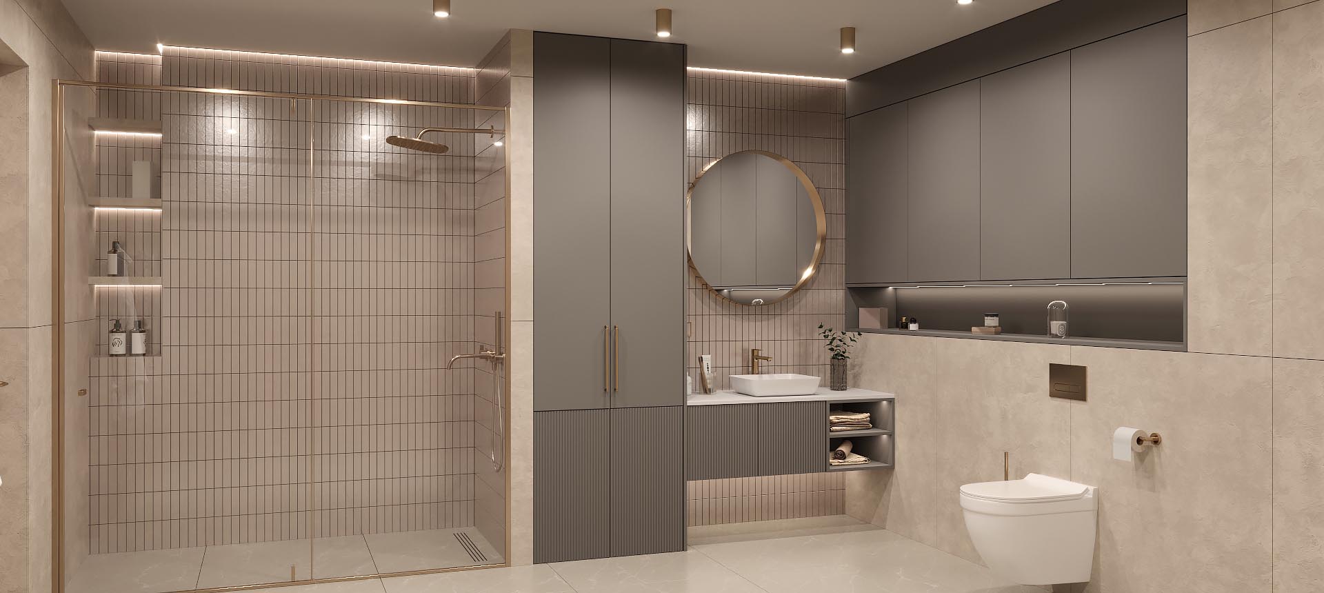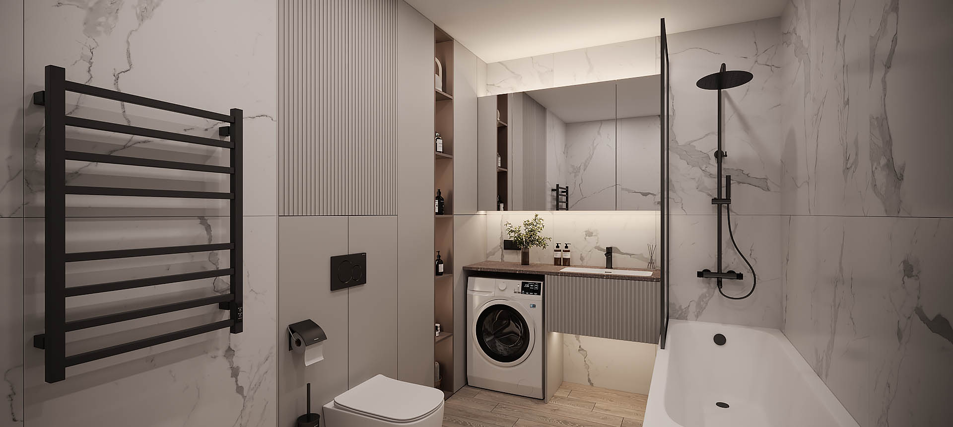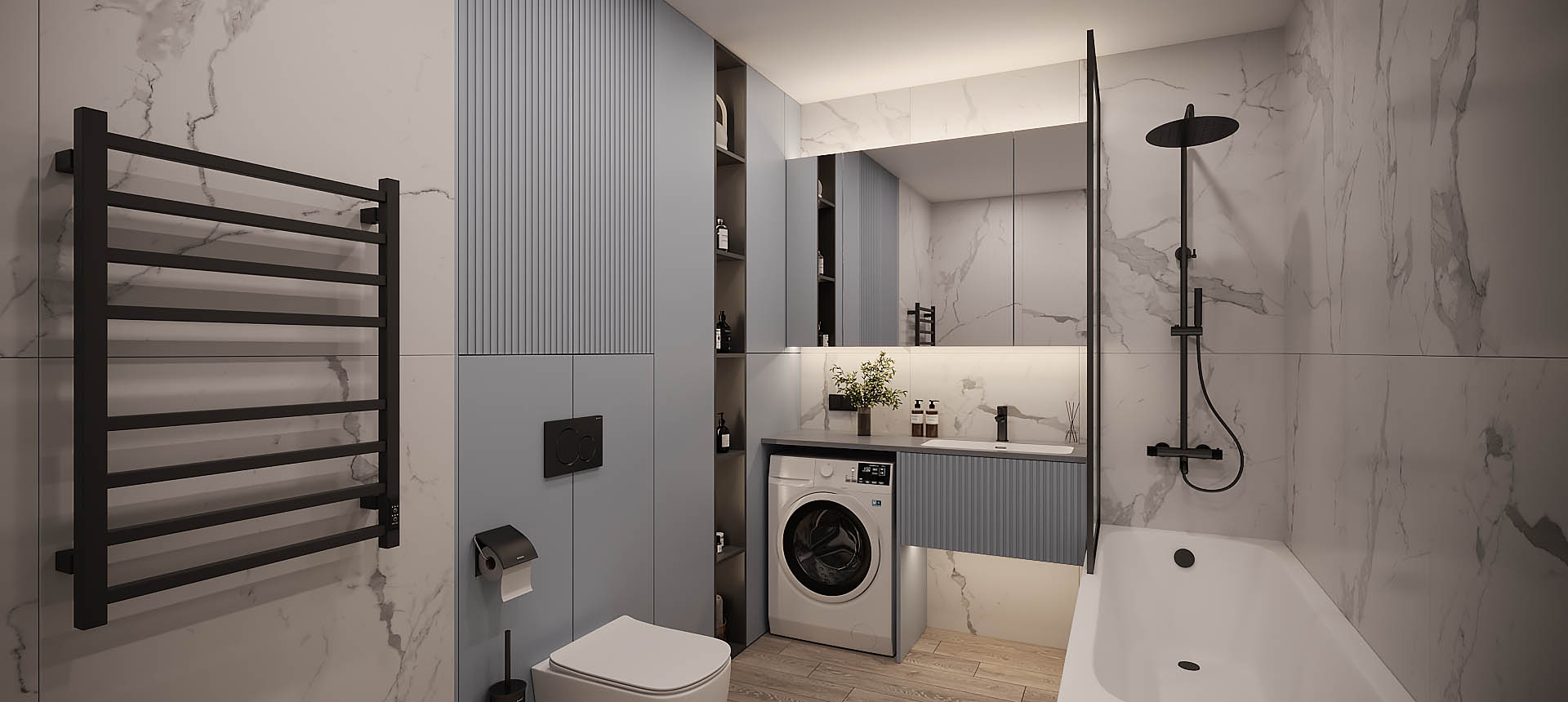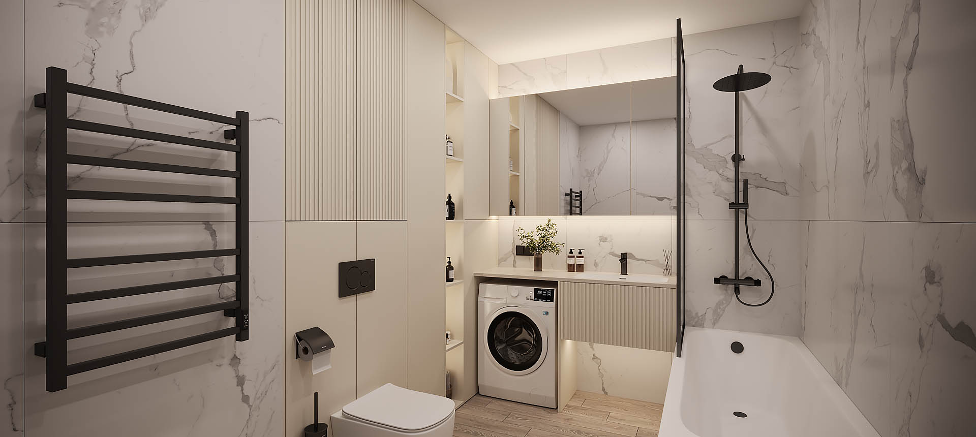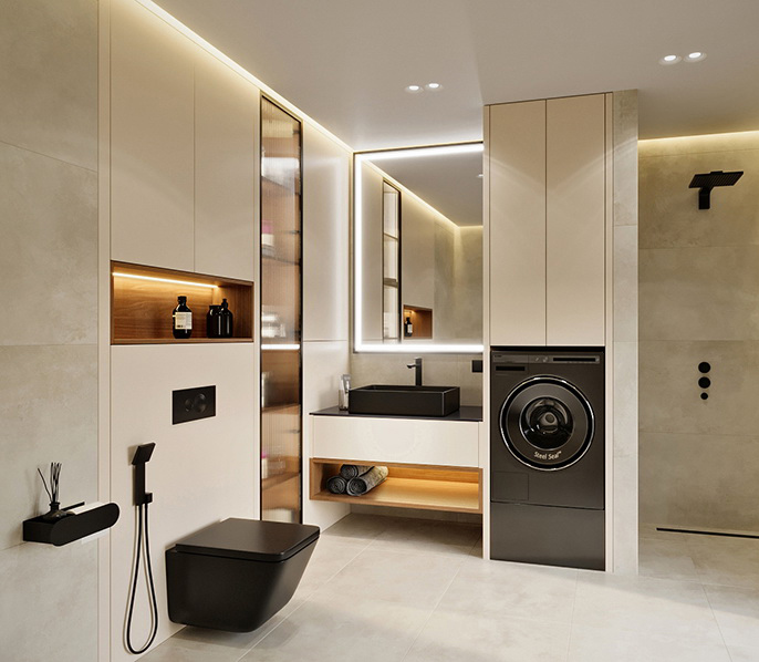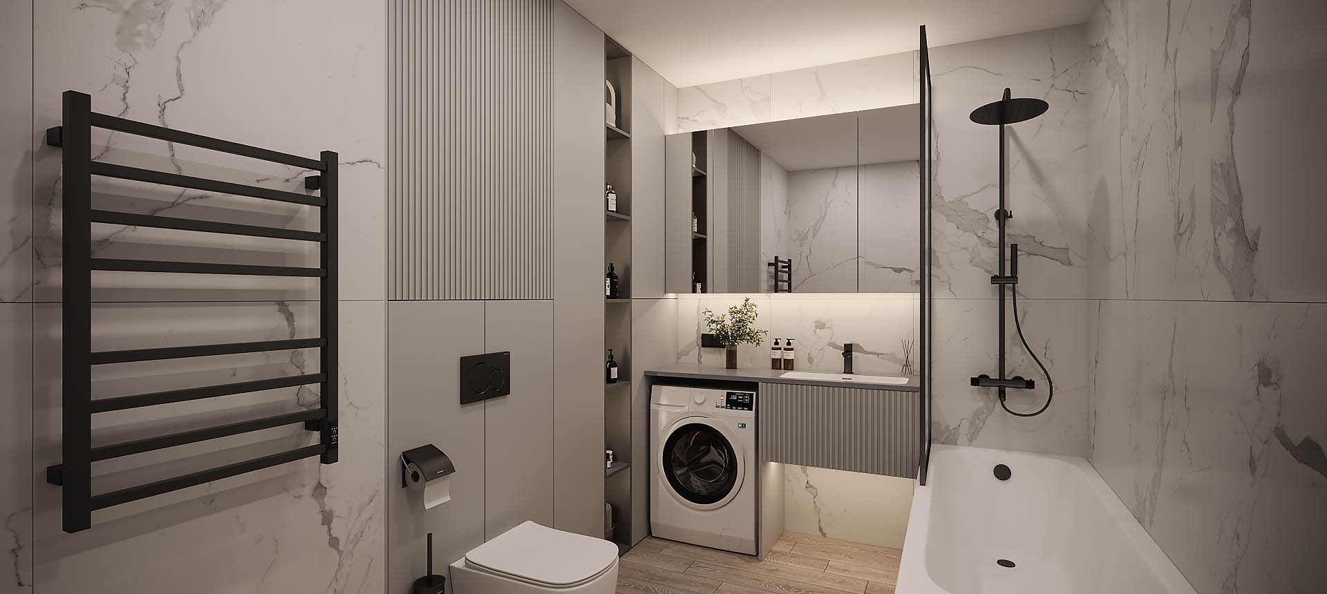 «У меня все проекты с компанией («Стильные Кухни и Интерьеры) были хорошие, но мебелью в ванную комнату я довольна больше всего на свете. Мне сделали тумбу под раковину, две навесные колонки по бокам, зеркало с подсветкой, а также встроенный шкаф напротив. Из-за высоты потолков и размеров шкафов было непросто спроектировать все так, как надо: были опасения, что дверцы ослабнут, что тяжелые дверцы нельзя будет открывать одним легким нажатием. Но в итоге в фасады добавили направляющие, которые их усиливают. И еще удалось сделать эти высокие двери с механизмом push-to-open. У меня не очень большая площадь ванной, поэтому хотелось обойтись без лишних деталей, в том числе и выступающих ручек, которые я бы постоянно задевала»,
