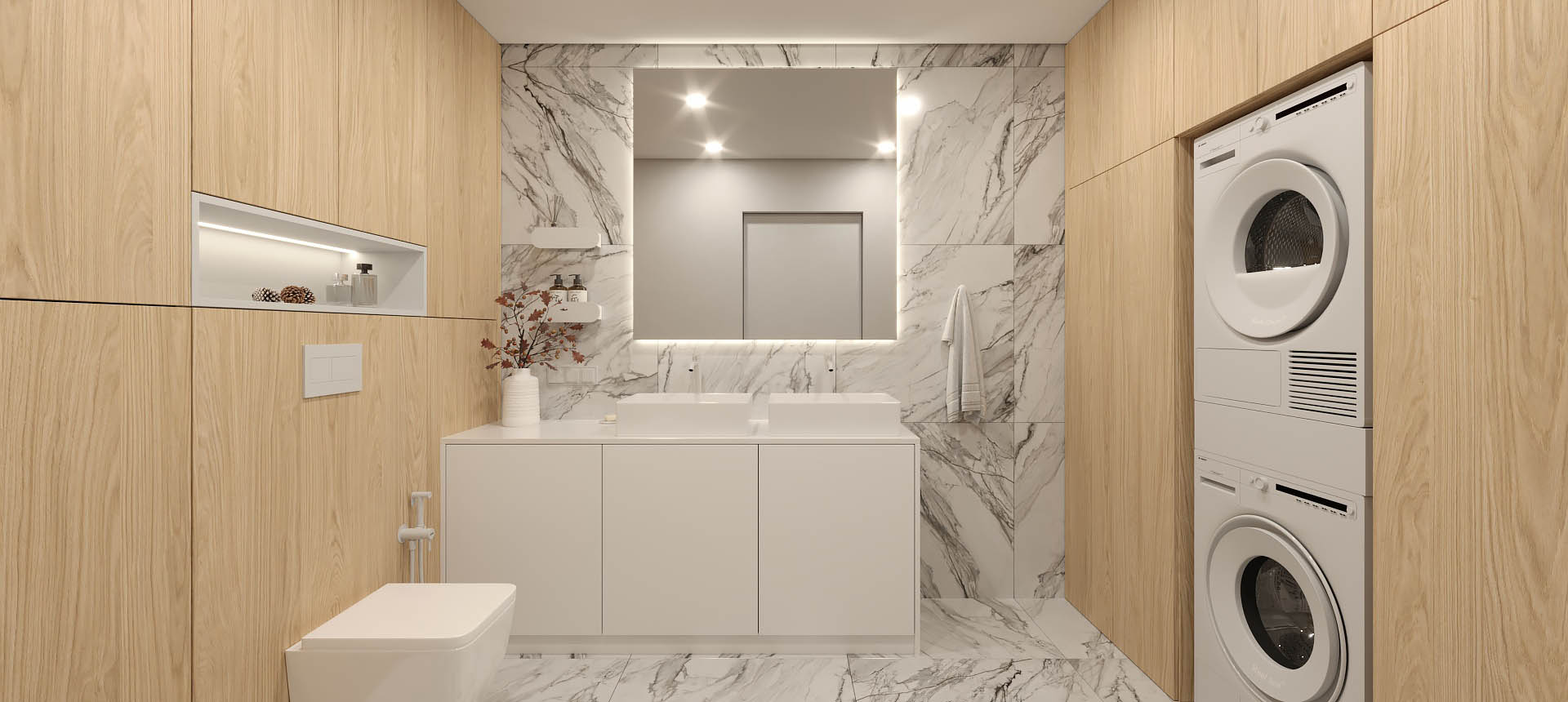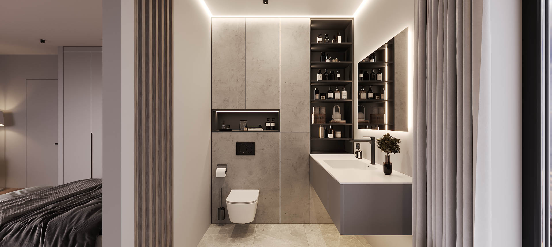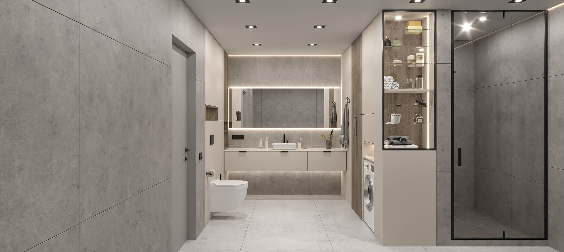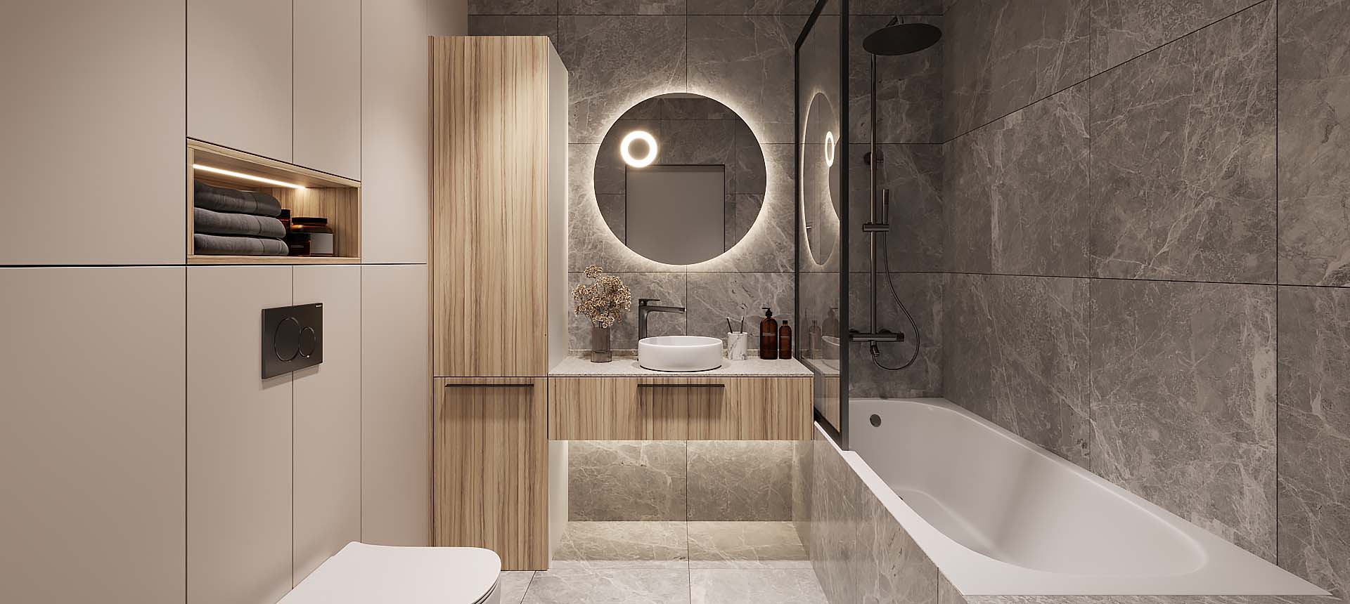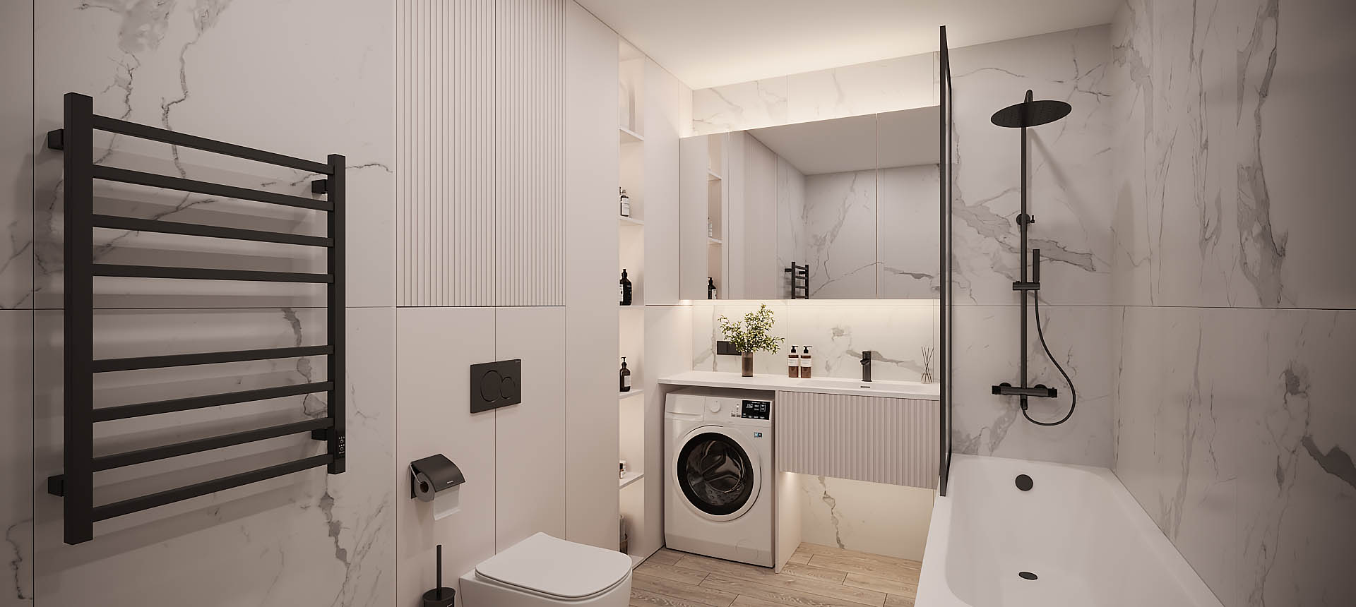 «У меня все проекты с компанией («Стильные Кухни и Интерьеры) были хорошие, но мебелью в ванную комнату я довольна больше всего на свете. Мне сделали тумбу под раковину, две навесные колонки по бокам, зеркало с подсветкой, а также встроенный шкаф напротив. Из-за высоты потолков и размеров шкафов было непросто спроектировать все так, как надо: были опасения, что дверцы ослабнут, что тяжелые дверцы нельзя будет открывать одним легким нажатием. Но в итоге в фасады добавили направляющие, которые их усиливают. И еще удалось сделать эти высокие двери с механизмом push-to-open. У меня не очень большая площадь ванной, поэтому хотелось обойтись без лишних деталей, в том числе и выступающих ручек, которые я бы постоянно задевала»,